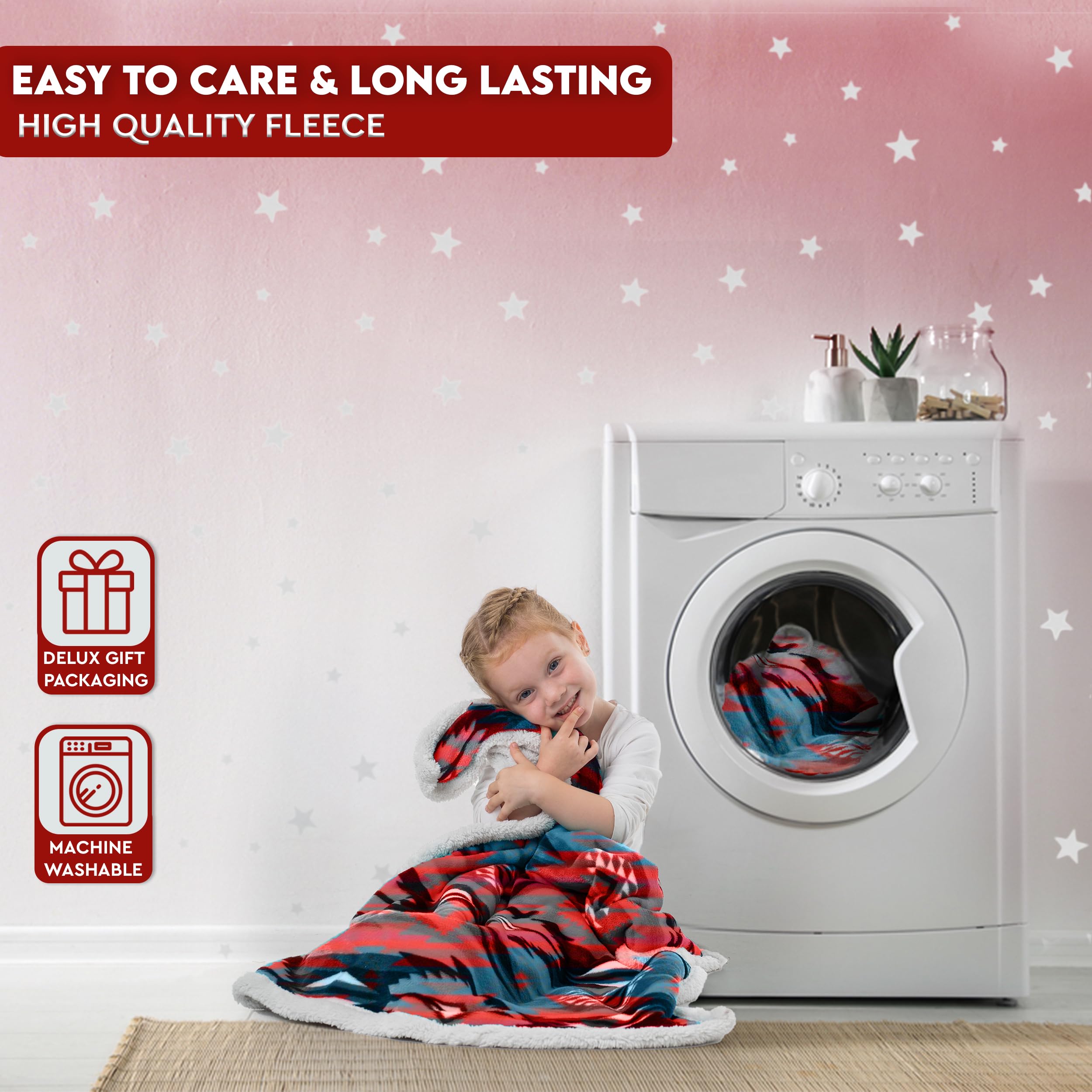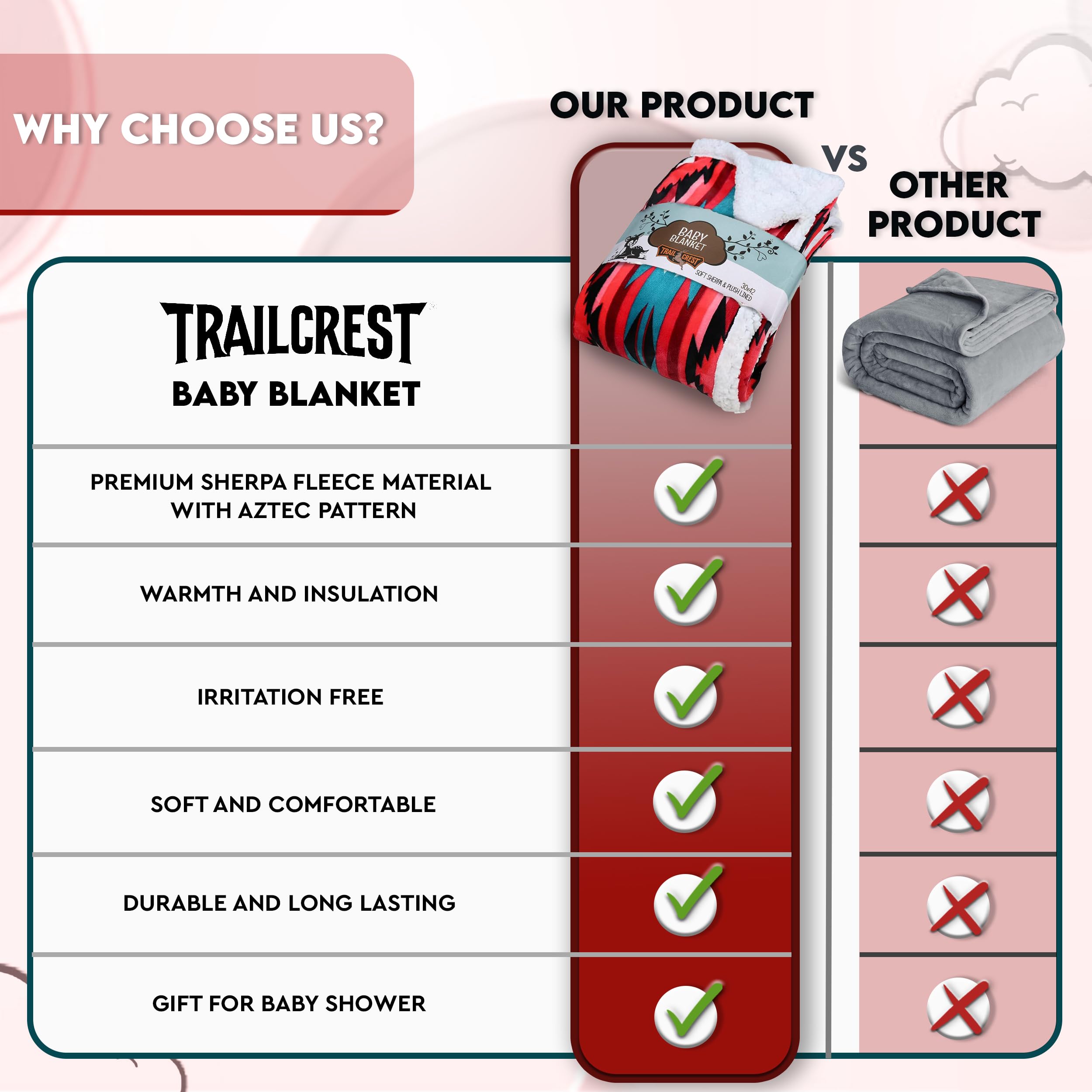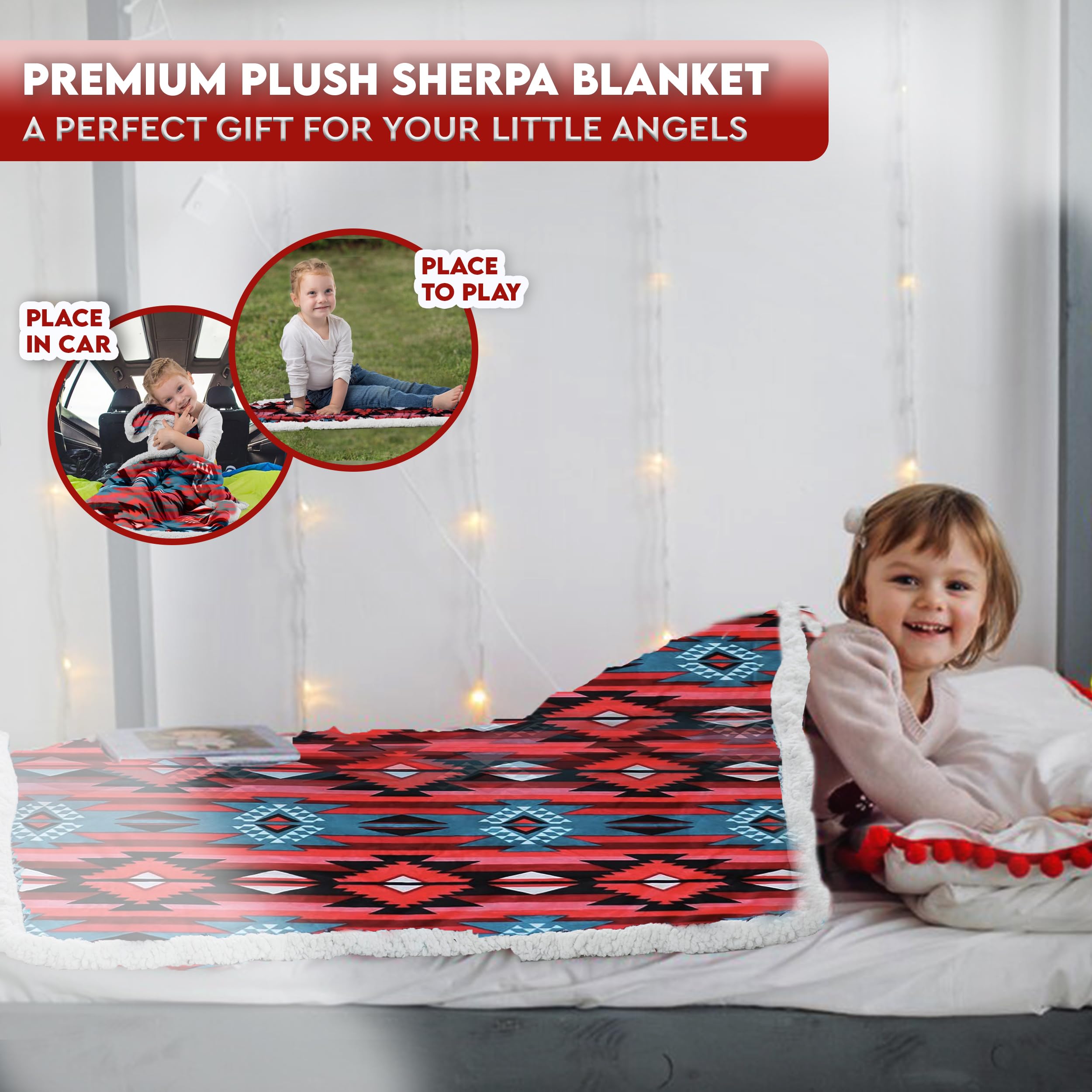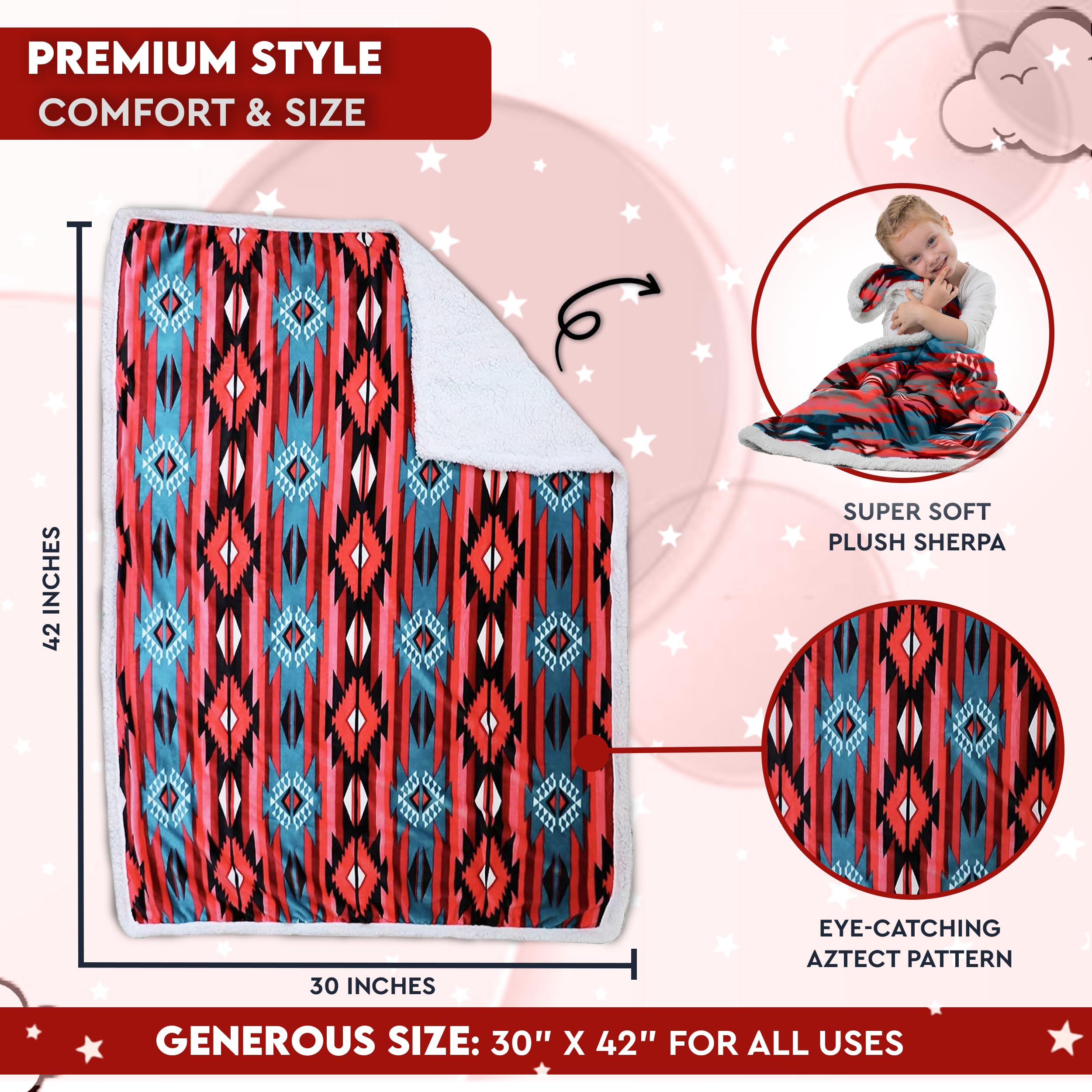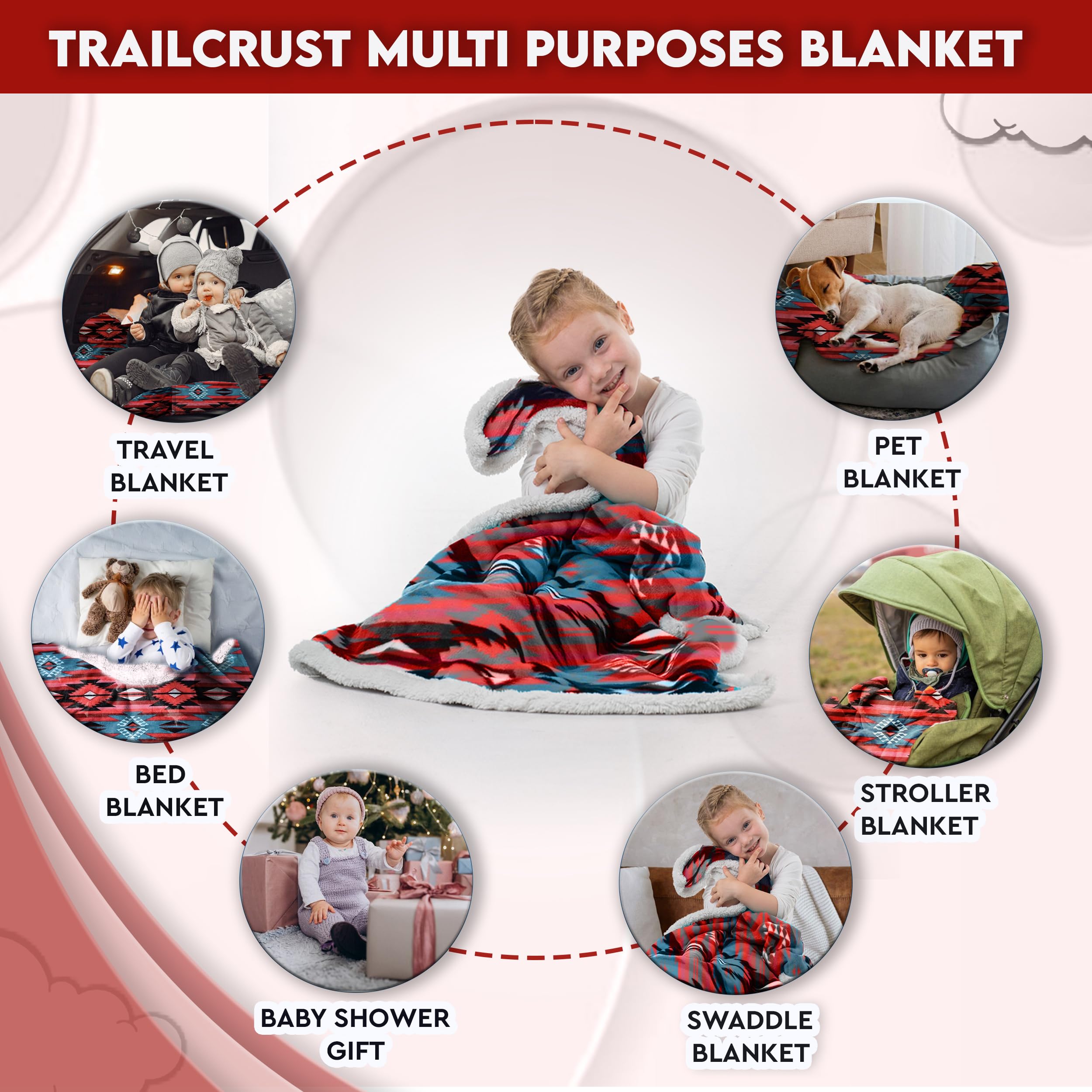 Discover The Softest & Coziest Sherpa-Lined Fleece Blanket For You & Your Baby! When it comes to your babyβs comfort, you cannot afford to settle for all those cheaply-made microfiber blankets. Now you spoil your newborn with the most luxurious and fluffiest blanket ever!Introducing The TrailCrest Premium Sherpa Fleece Plush Throw Blanket With Aztec Pattern! You and your little ones will love the ultra-soft Sherpa inner lining, which will not only keep you warm during cold winter months, but also feel great against your sensitive skin.Top 3 Reasons To Choose Our Sherpa Plush Blanket:β Because You Want To Keep Your Baby Warm & Comfy What makes our blanket so special is that itβs not only warm but also extremely snuggly, cozy and fluffy. Your toddler will love napping with our blanket, which can also double as a security blanket for years to come.β Because You Need A Plush Blanket For Your Movie Nights Thereβs nothing like coming home from work, making a hot chocolate or pouring a glass of red wine and watching a movie on your couch. What can make this feeling even better? The TrailCrest super-soft sherpa throw blanket!β Because Itβs 100% Mom-Approved Our versatile blanket can double as a stroller blanket, car seat baby cover, portable crib blanket, camping blanket, travel blanket, nursery cover or couch blanket. Plus, itβs 100% machine-washable and quick-drying!Need More Reasons? β€ 100% Machine-Washable Polyester β€ Generously Sized: 30β x 42β For All Uses β€ Eye-Catching Aztec/Ikat Patterns β€Comes in A Deluxe Gift Packaging β€100% Unconditional Satisfaction Guaranteeπ Choose from 5 Adorable Colors: Black & White - Burgundy & White - Gray, Black & Pink - Mountain Blue - Navy, Red & WhiteDonβt Wait Till They Run Out Of Stock - Click to Buy them NOW & Spoil Yourself with The Fluffiest Blanket Out There!