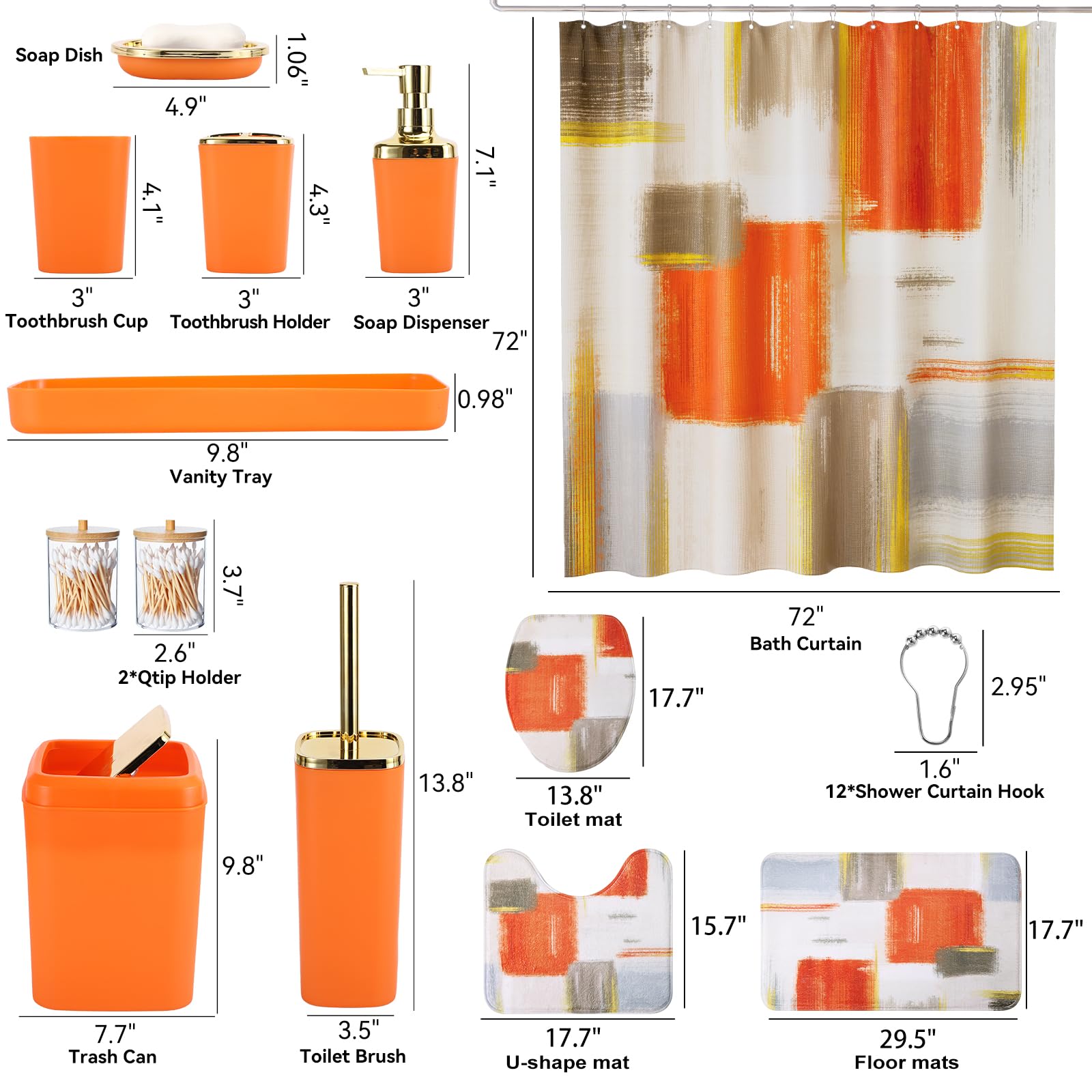 XLHOMO Bathroom Set - Orange Bathroom Accessories Set, Bathroom Sets with Shower Curtain and Rugs, Orange Shower Curtain Set with Bathroom Trash Can, Soap Dispenser, Soap Dish for Home Decor