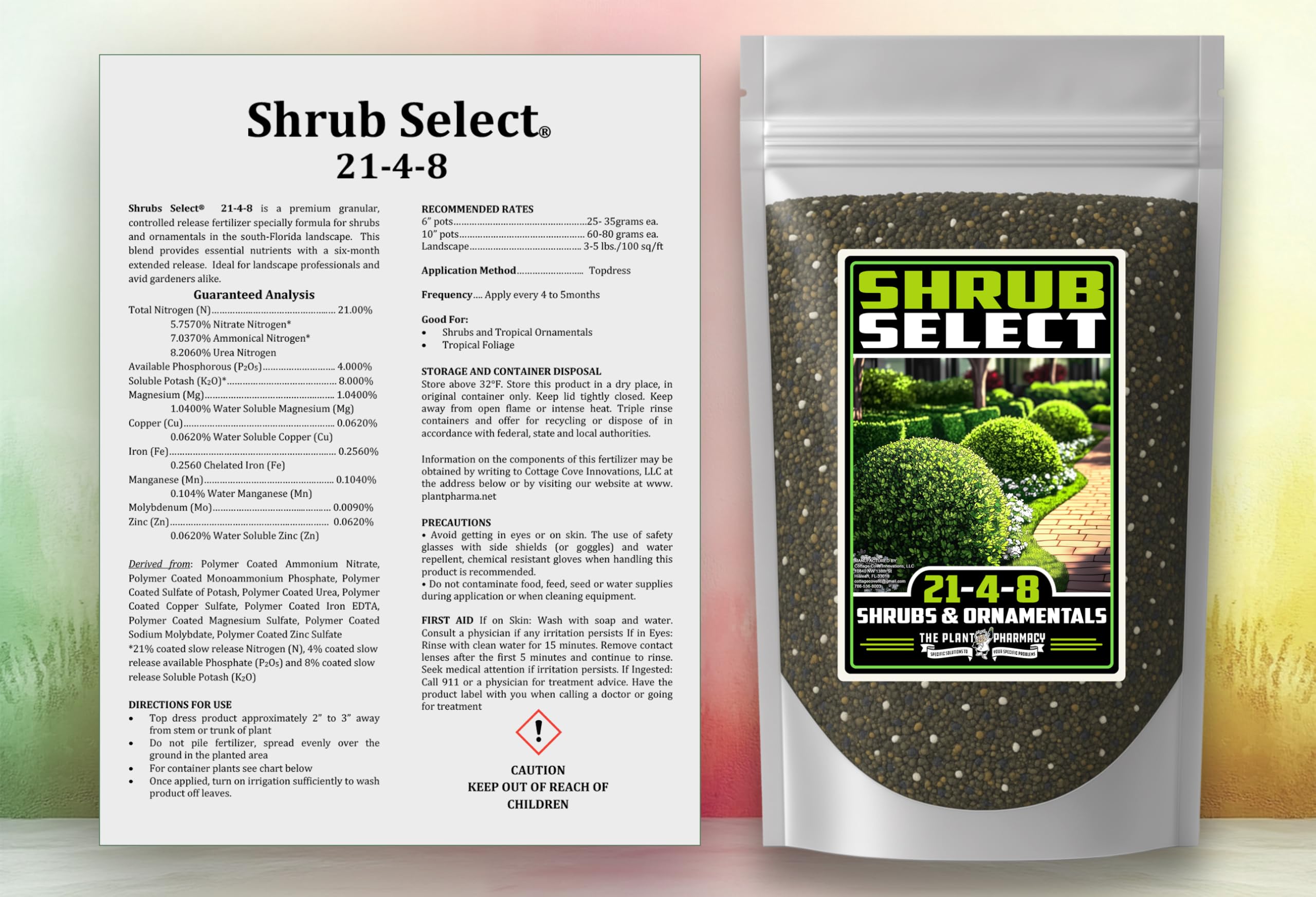Shrub Select 23-4-7 is a custom blended two-stage fertilizer designed to deliver both an upfront starter boost and long-term controlled release nutrition for your shrubs and tropical ornamentals. With a balanced NPK ratio of 23-4-7, it provides essential macronutrients for robust plant growth, while the chelated micronutrients support overall plant health and vitality. This slow-release formula offers a steady supply of nutrients over 5-6 months, ensuring your plants remain nourished and vibrant through the growing season. Perfect for landscape applications and container plants, Shrub Select ensures your plants thrive without the need for frequent reapplications. This all-purpose fertilizer is simple to applyÑjust top dress the product evenly around the plantÕs trunk or stem, making sure not to pile it on. Once applied, irrigate the area to ensure complete nutrient absorption. With its long-lasting nutrition, Shrub Select is a convenient and reliable choice for gardeners looking for consistent growth and health in their shrubs and ornamentals. Keep your plants flourishing with this premium, slow-release blend.