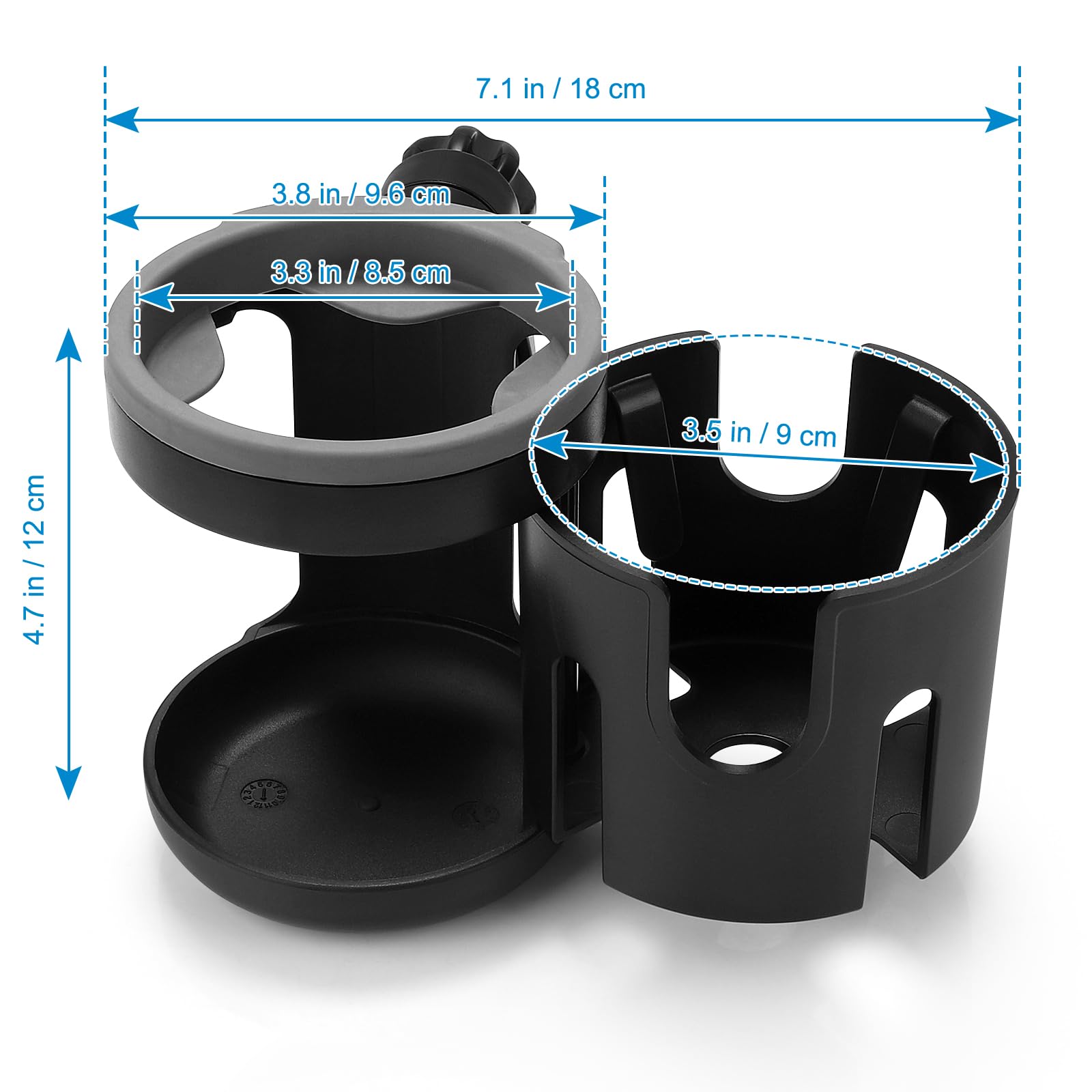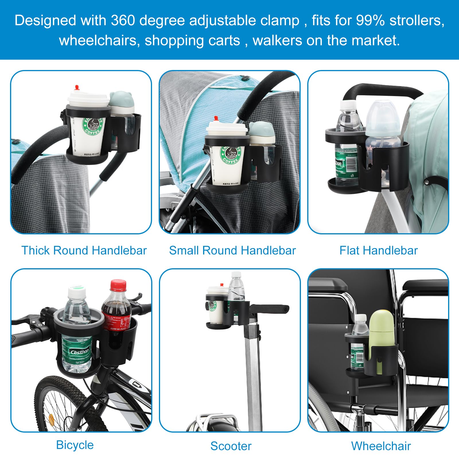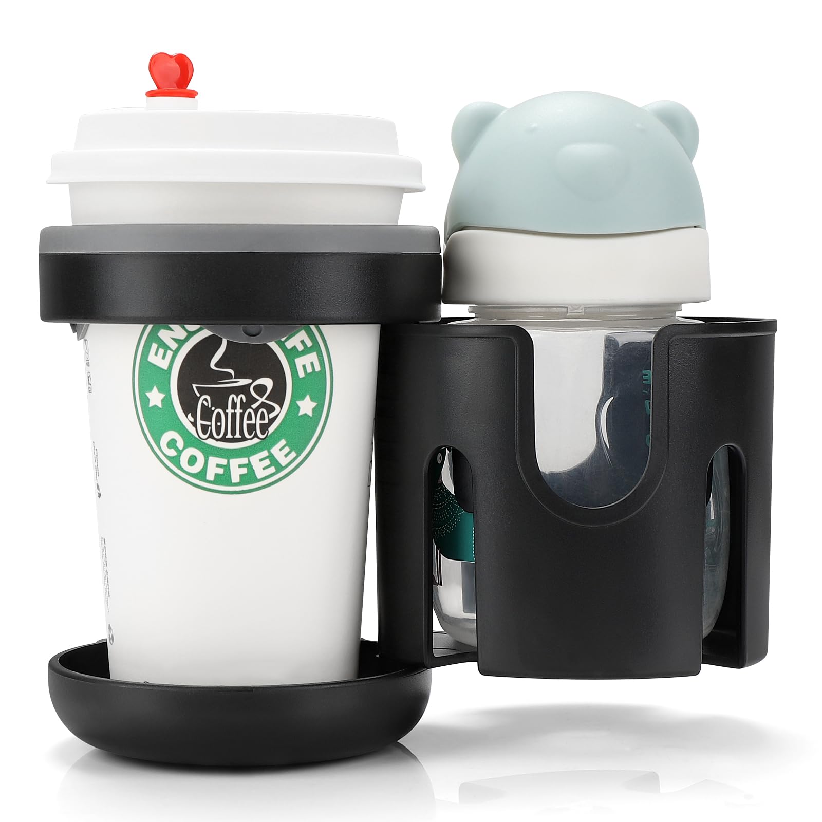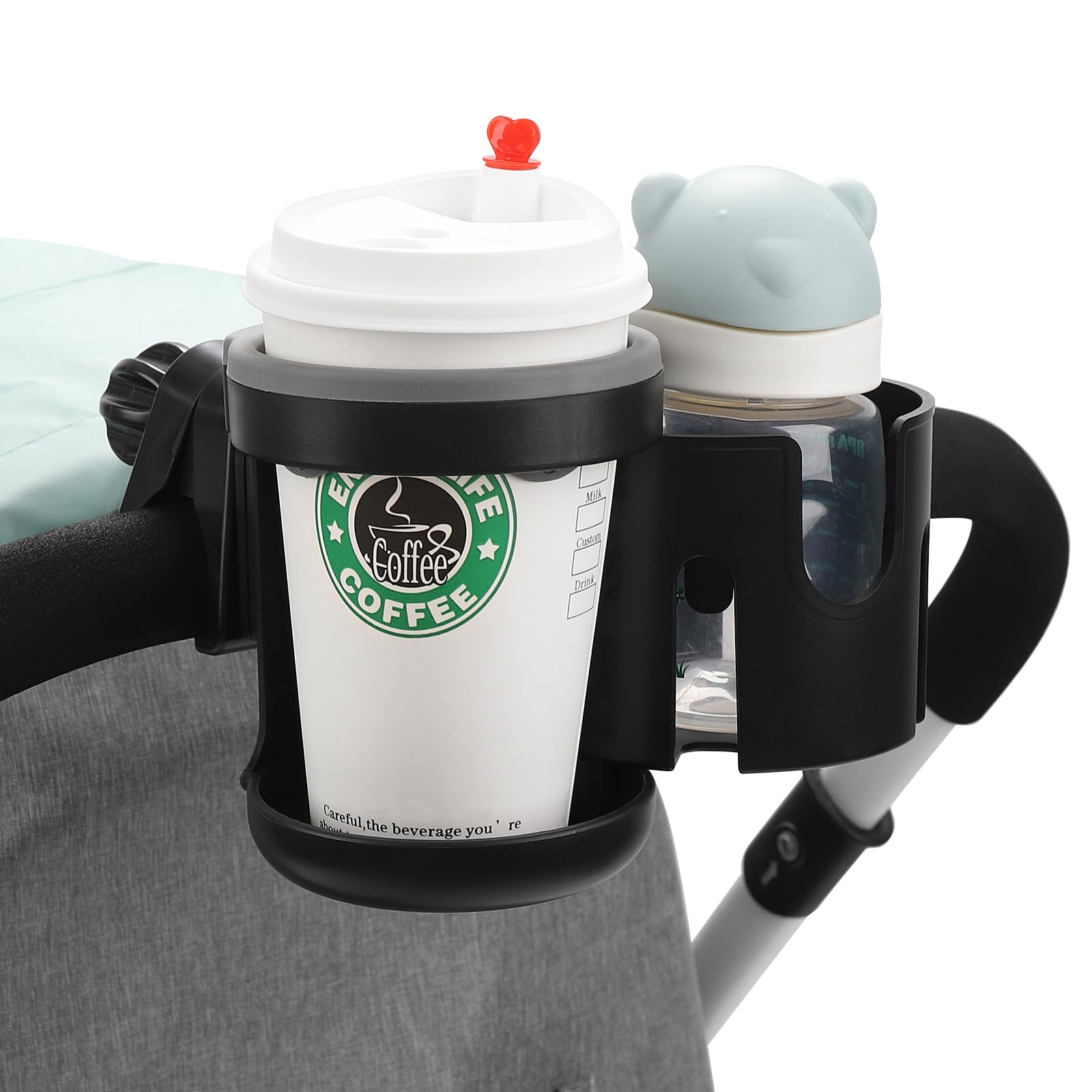 This cup holder compatible with most bottles of different sizes. And the open sides accommodate bottles with handles. This cup holder fits for baby bottles, water bottles, coffee mug, drink bottles, beverage cups etc.