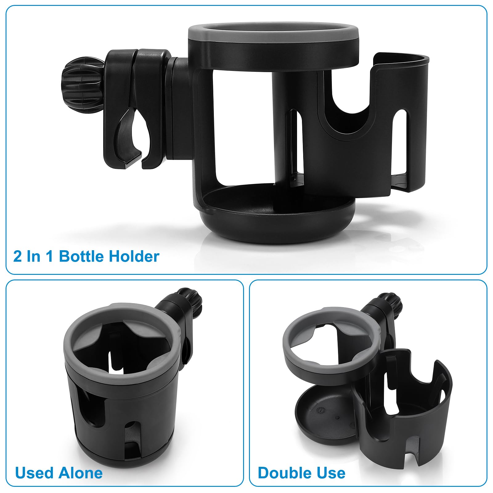 2-in-1 Convertible Cup Holder: The holder body of this cup holder can be separated or combined. You can use it as a single cup holder, or unfold it to hold two bottles. (Compatible with cups/bottles with a diameter under 3.1 inches.)