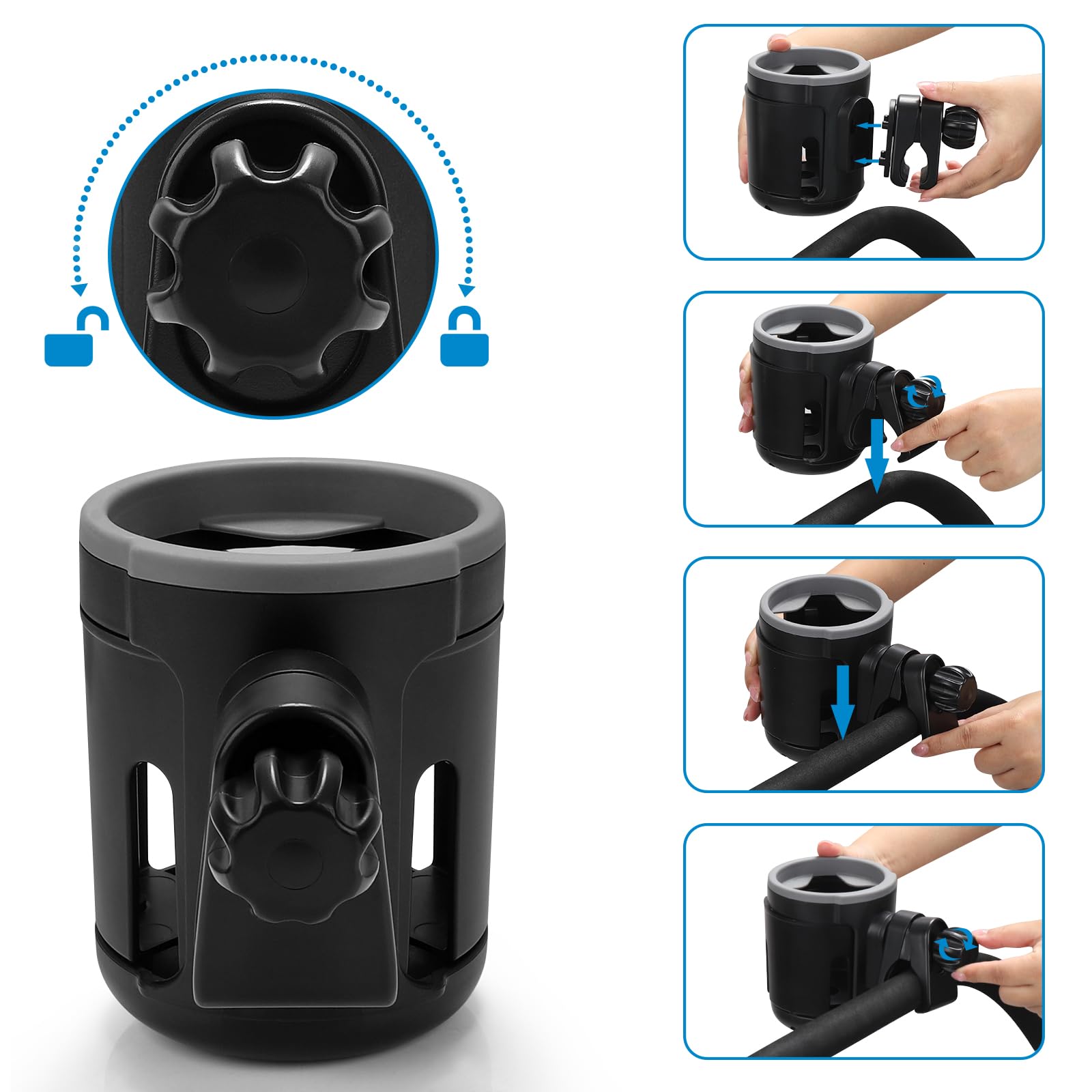 This universal cup holder helps free your hands. It designed to hold bottles on strollers, walker, wheelchair, scooter and so on.