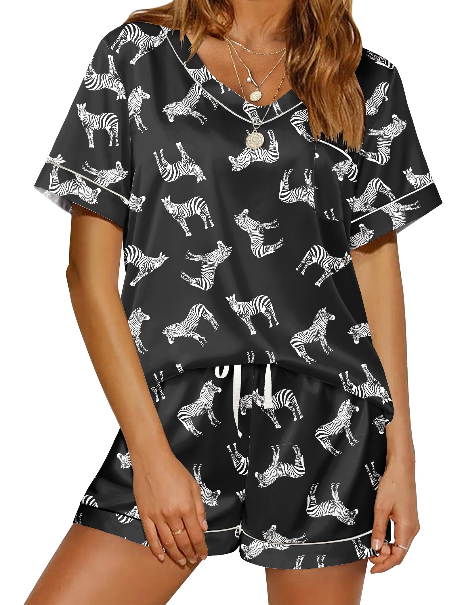 Short Sleeve Top: V neck, cute patterns and solid color, smooth satin top with chest pocket. The loose cut can show your body curve while giving you a burden-free wearing experience
