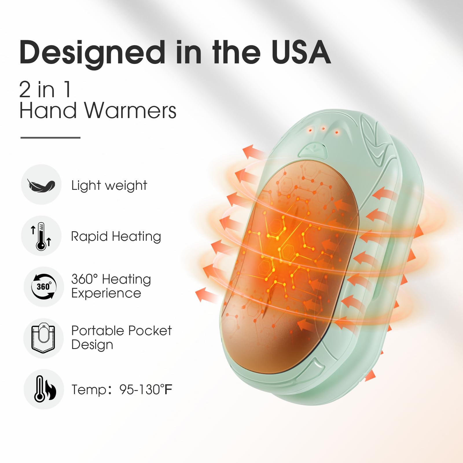2-in-1 Electric Hand Warmer - A set of 2 symmetrical hand warmers that can be combined into a palm-sized hand heater, providing 360-degree warmth for your hands. Alternatively, you can use them separately, each hand holding one, or share one hand warmers with a family. The portable pocket design is suitable for travel, hunting, golf, hiking, camping, skiing, and more