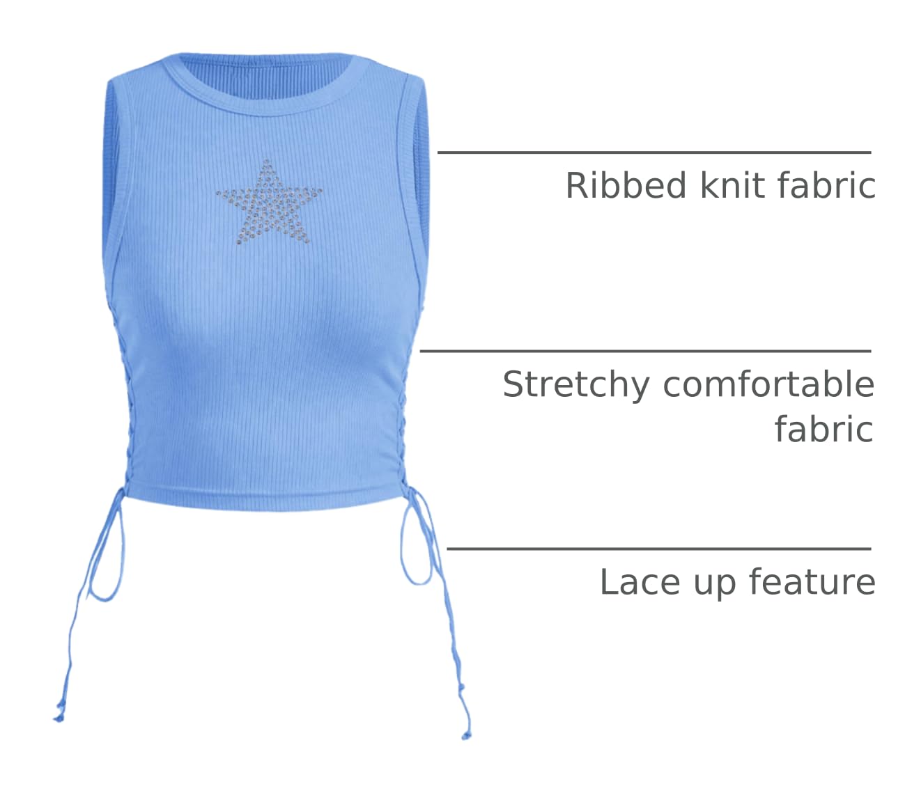 Feature: Star pattern, lace up, rhinestone, crewneck, slim fit, ribbed knit, concert outfits, vest tops for women, easy to pair with jeans, pants, shorts, etc