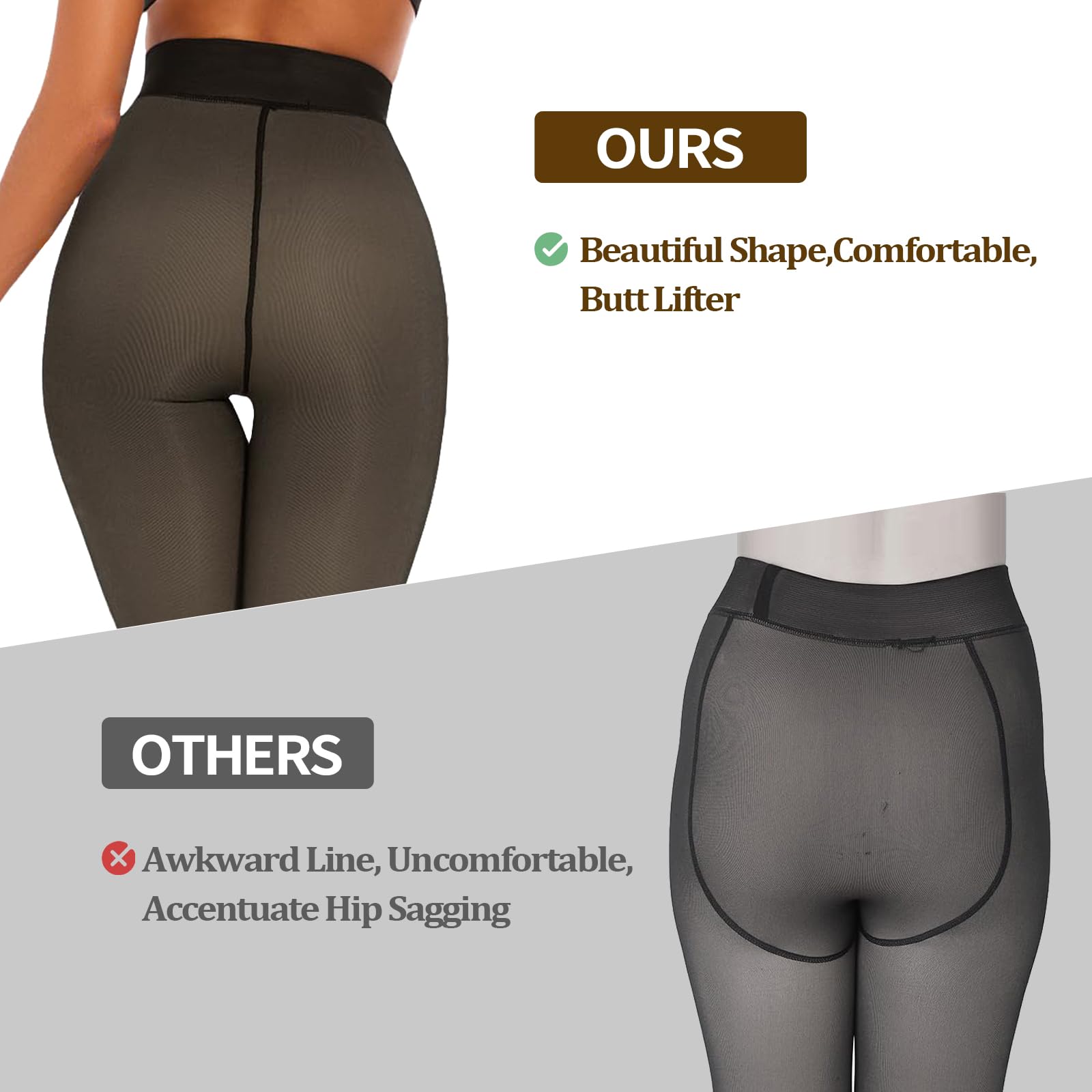 【Invisible Crotch Design Tights】 fleece lined tights women feature an invisible single line crotch design. Compared to most U-shaped hip designs on the market, thermal leggings for women avoid awkward hip lines and can better fit the skin, highlighting your hip curves and providing both beauty and comfort.
