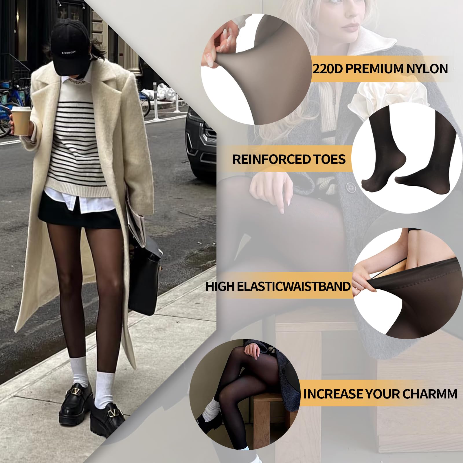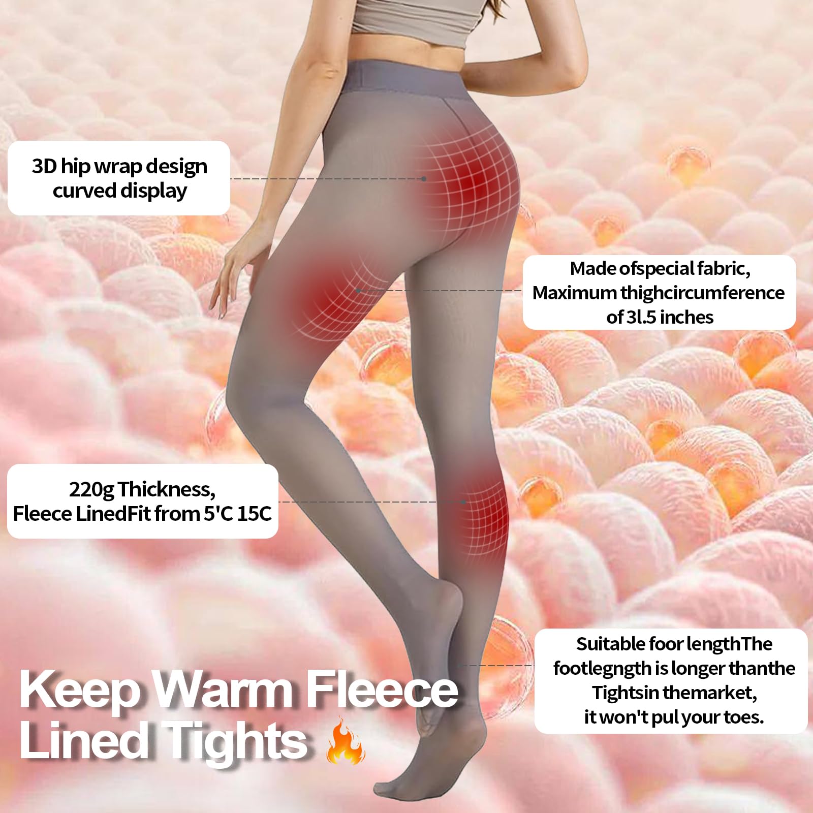 【All-Day Thermal Lock Technology Tights 】 220g Plush fleece lining traps body heat 2x better than basic tights, providing serious warmth down to -10°C (14°F) without restrictive bulk—stay cozy during winter commutes or snowy adventures. Micro-brushed fleece mimics luxury knitwear against skin. Hypoallergenic & thermo-regulating for irritation-free warmth in winter.