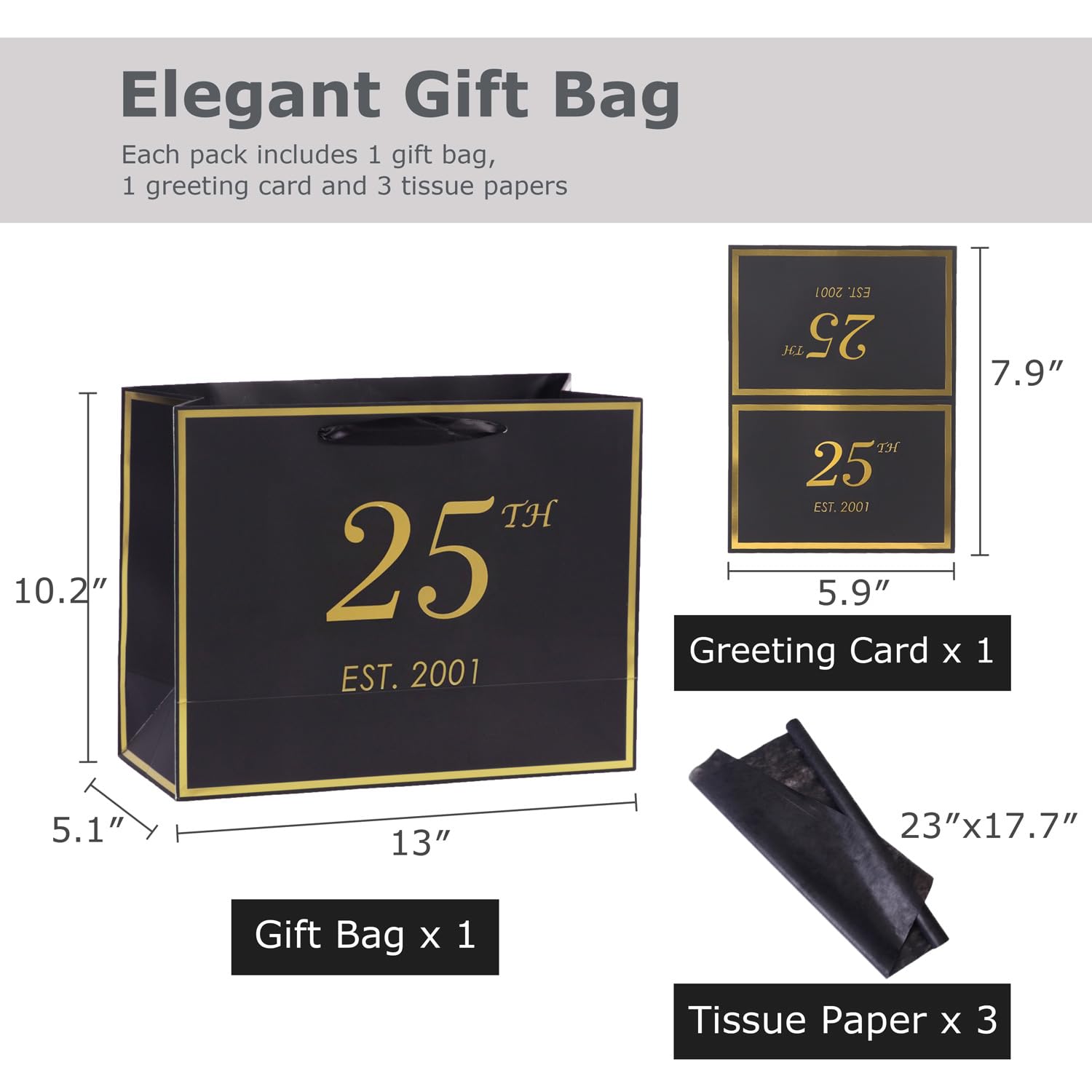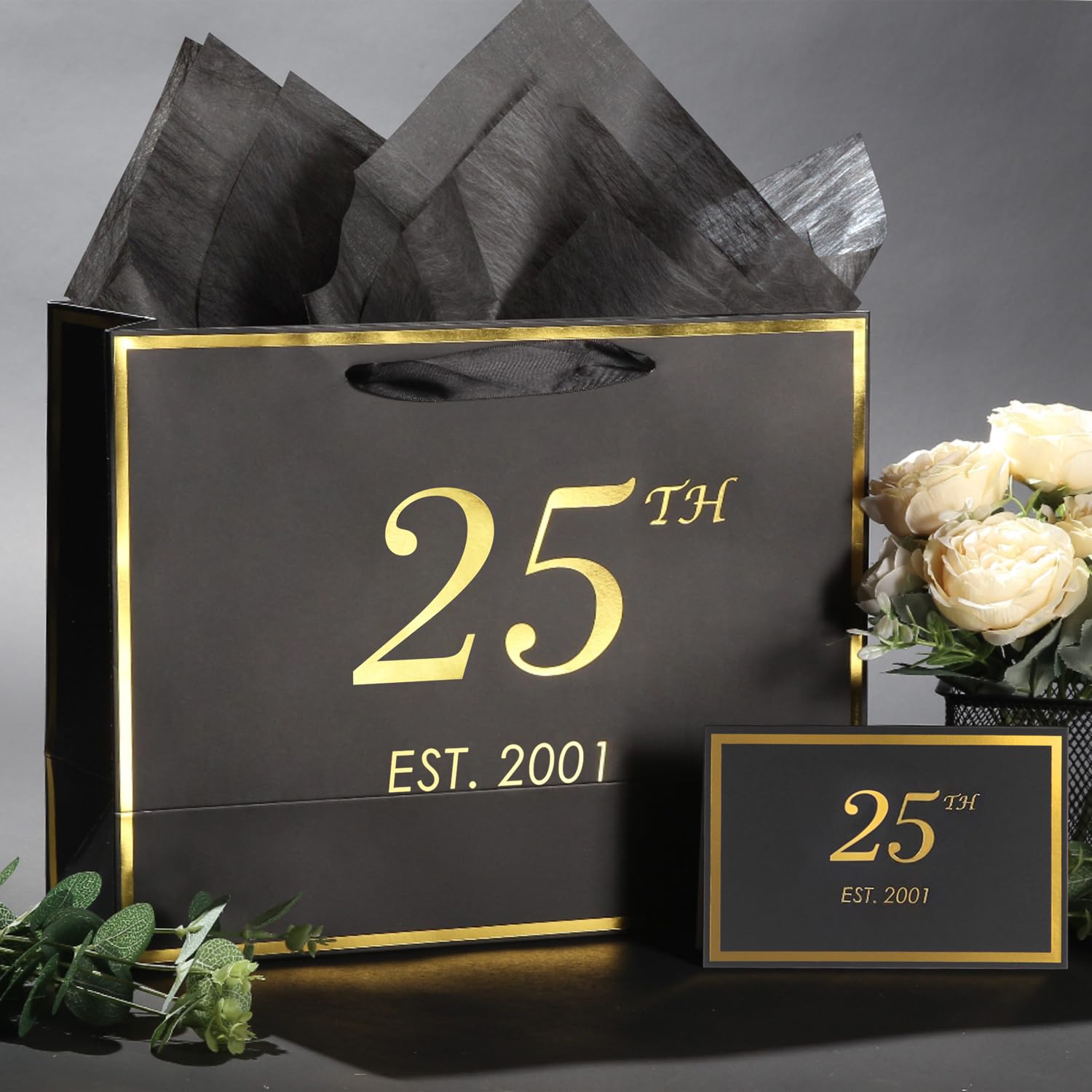 momoake 25th Birthday Gift Bag with Card and Tissue Paper for Men Women Him, 2001 25 Year Old 13" Elegant Black Gold Anniversary Keepsake Party Present Shopping Paper Bags for Gifts Wrapping (2001 25th)