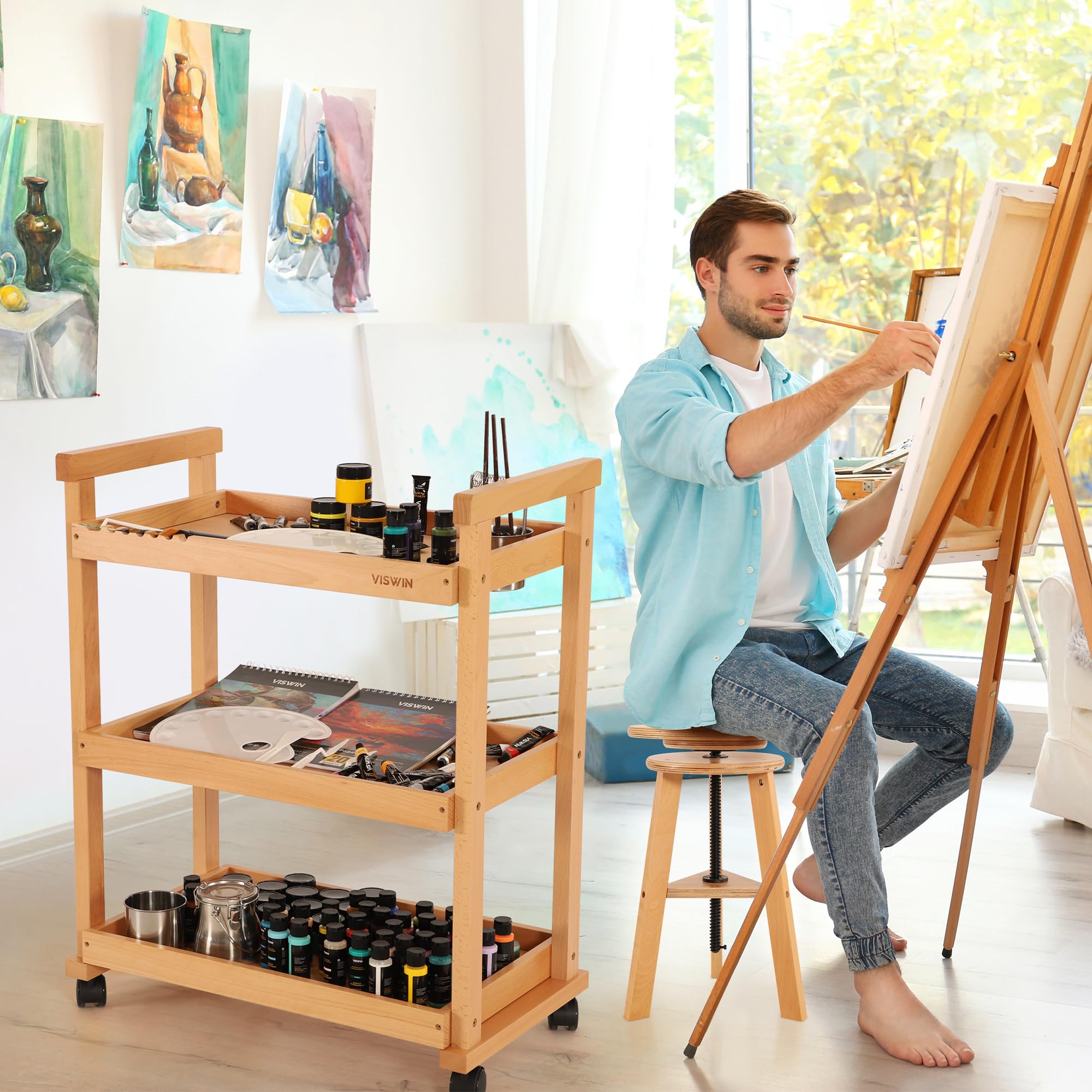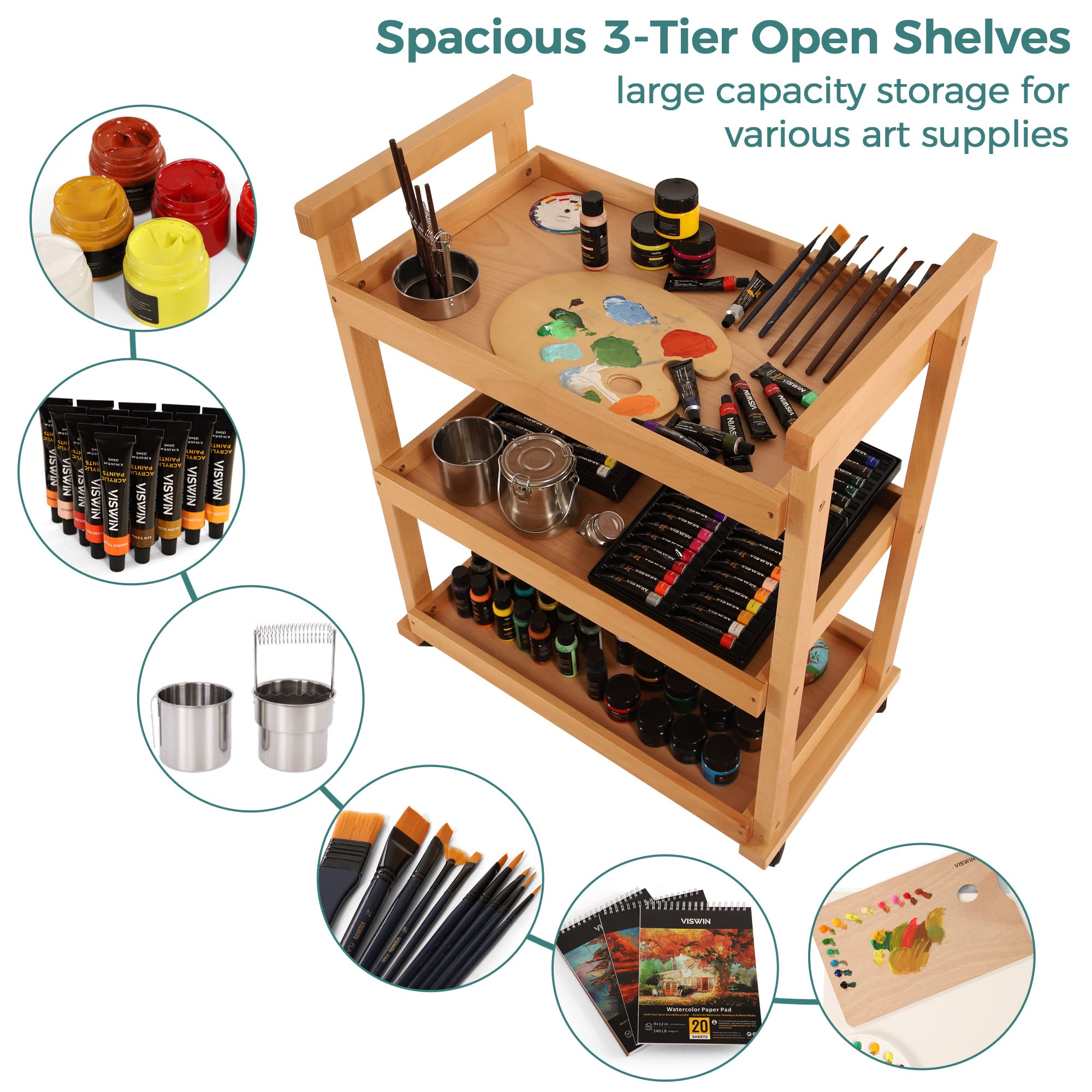 3-TIER SPACIOUS STORAGE CART: Our utility cart has 3 spacious open shelves to store your canvas, paintbrushes, paints, or other art supplies, even your daily necessities. This large capacity rolling cart allows you to focus on your artwork and is designed to keep all of your creative supplies organized and easily accessible
