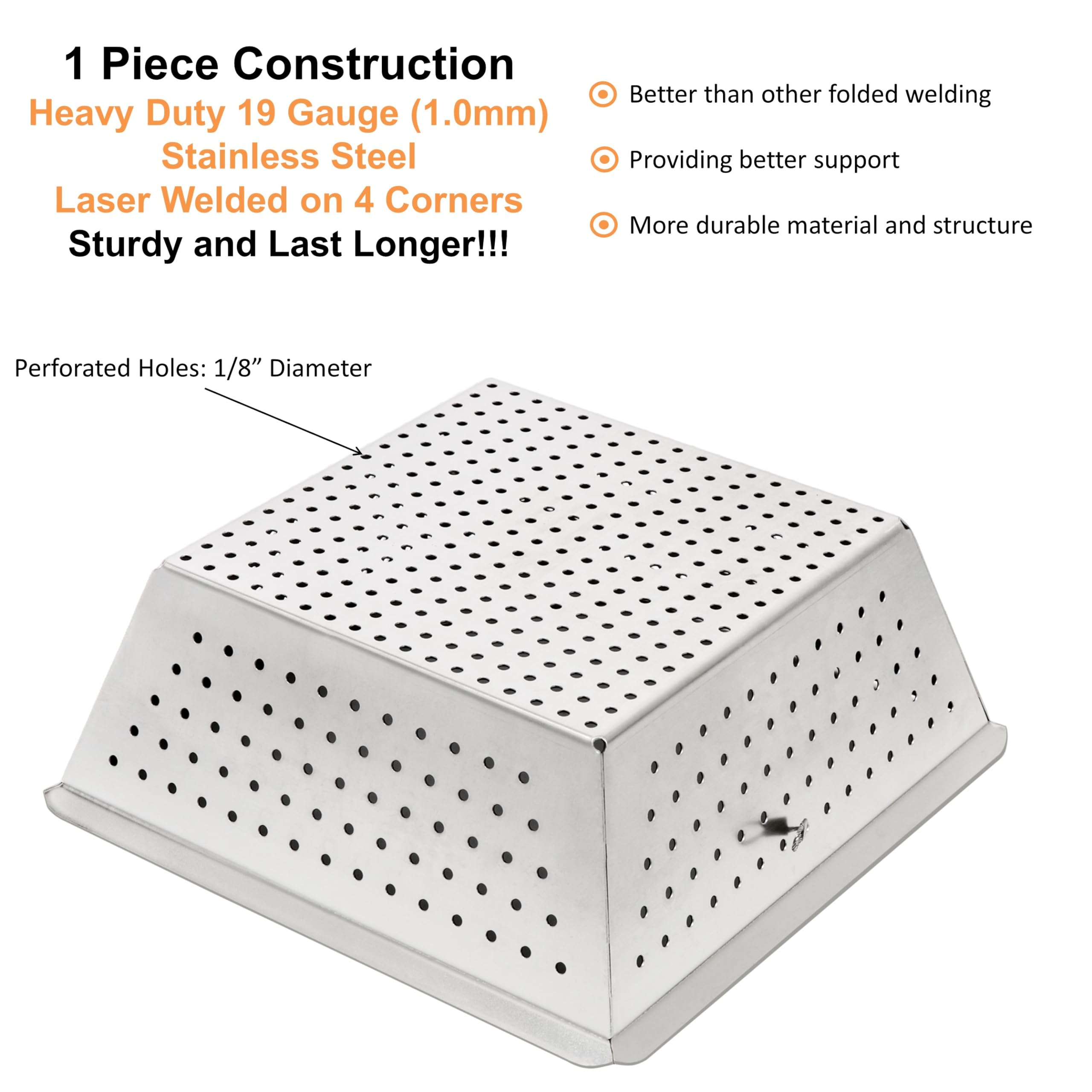 [Dimensions and Weight] - Perforate diameter: 1/8”. Overall dimensions: 8-1/2”W x 8-1/2”D x 3-1/8”H. Bottom dimensions: 6-1/8"W x 6-1/8"D (Refer to the pictures for detailed dimensions) . Net weight: 1.35 lbs.
