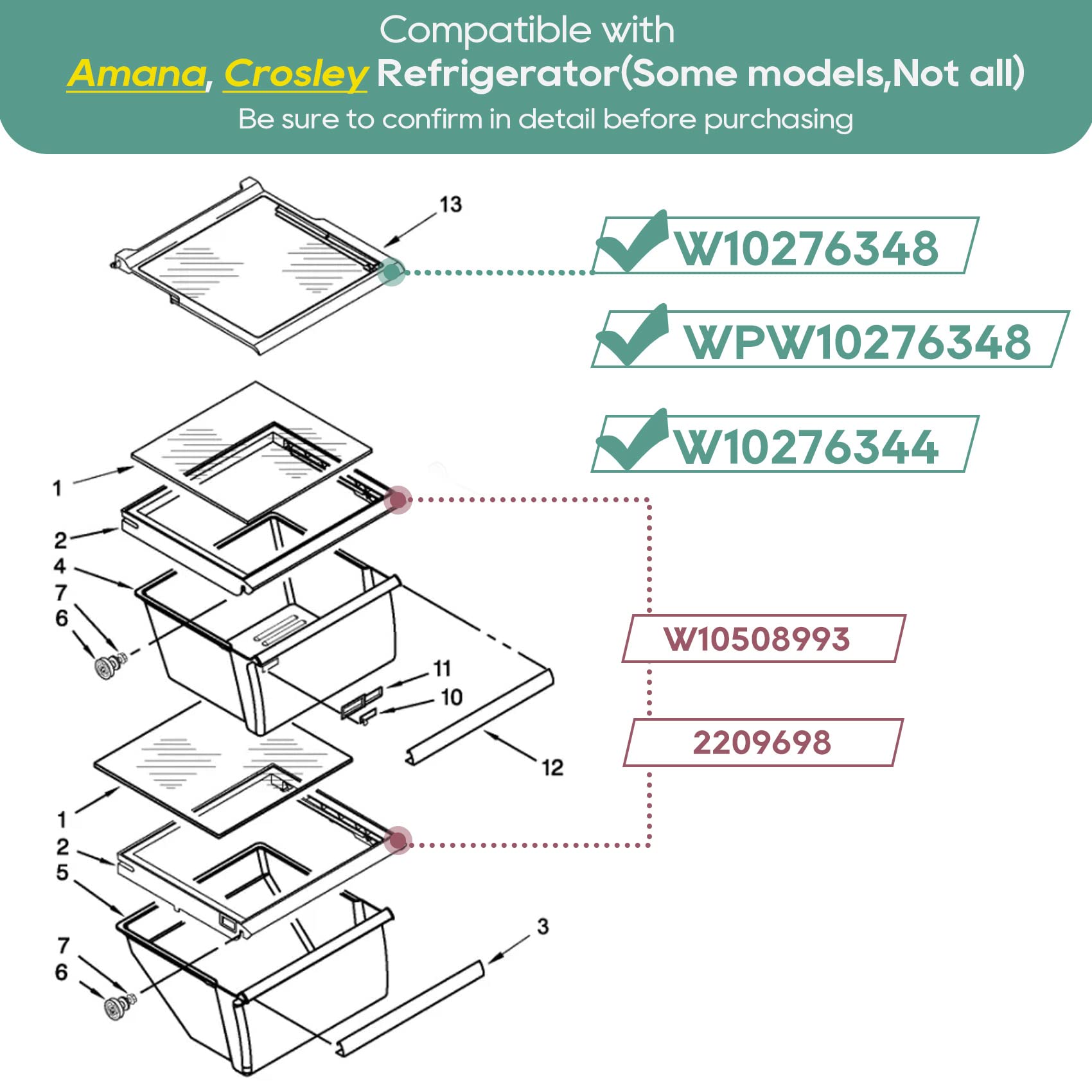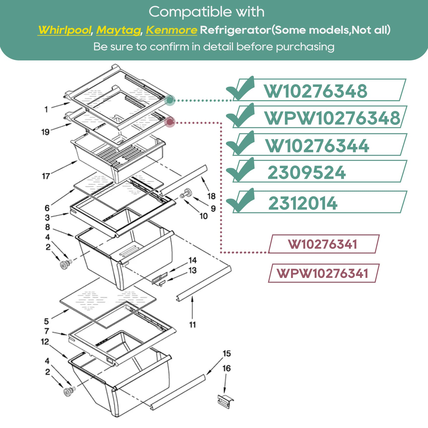 Purchase Notes: W10276348 Glass Shelf is only compatible with some models of whirlpool, kenmore, maytag, amana, crosley, etc, Refrigerator, Instead of all, Be sure to confirm in detail before purchasing, Our pictures and detail pages have very detailed instructions.