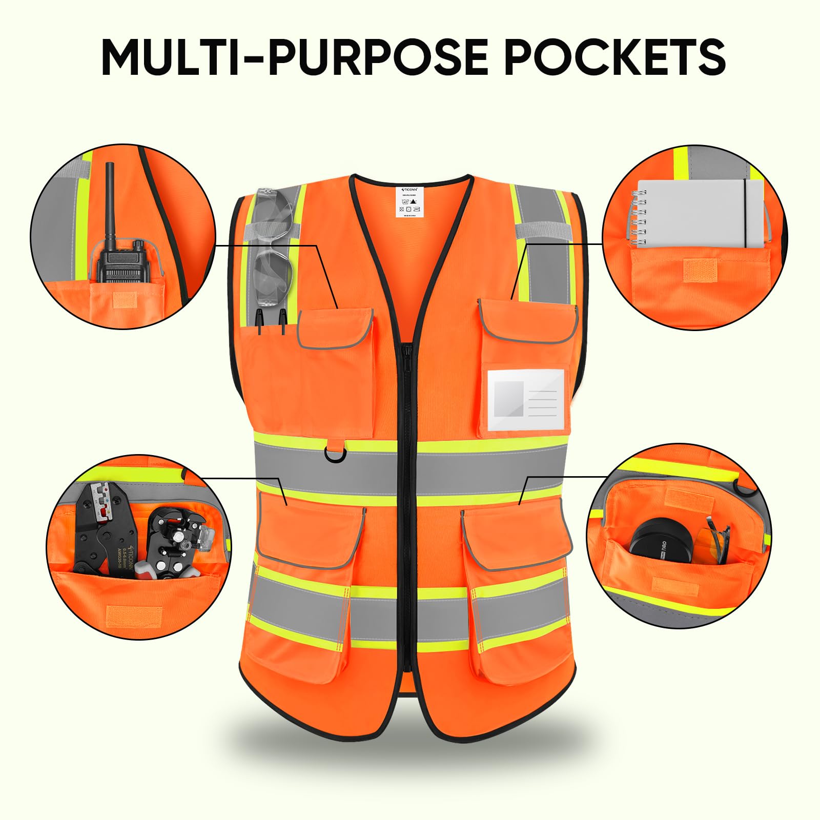 [MULTI-PURPOSE POCKETS] This high visibility vest has functional pockets built-in including a Transparent ID pocket, pen holder, radio pocket, and the 2 large pockets that can hold your tools and gloves.
