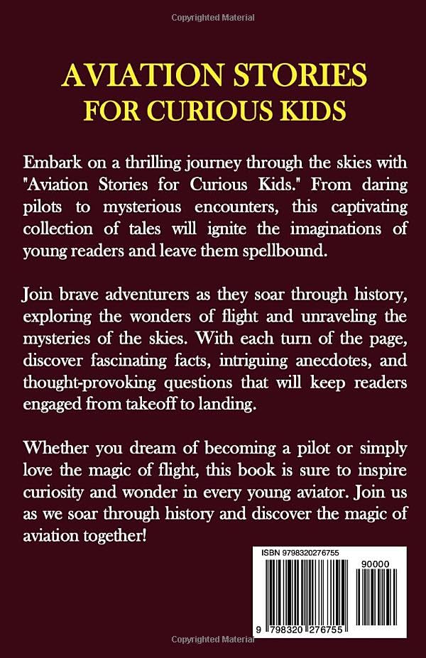 Embark on a Journey Through Aviation History! In "Aviation Stories for Curious Kids," you'll: Discover the thrilling tales of pioneer pilots who dared to defy gravity and conquer the skies Uncover the secrets of legendary airplanes that changed the course of history and captured imaginations worldwide. Explore the mysteries that have puzzled generations, from the Bermuda Triangle to the enigmatic disappearances of Flight 19. Learn about the courageous heroes who risked it all to push the boundaries of flight and explore the unknown. Ignite your curiosity and inspire your imagination with captivating true stories that will leave you eager to learn more. Ready to Take Flight? Join us on an unforgettable journey into the clouds! Get your copy of "Aviation Stories for Curious Kids" today and let your imagination soar.