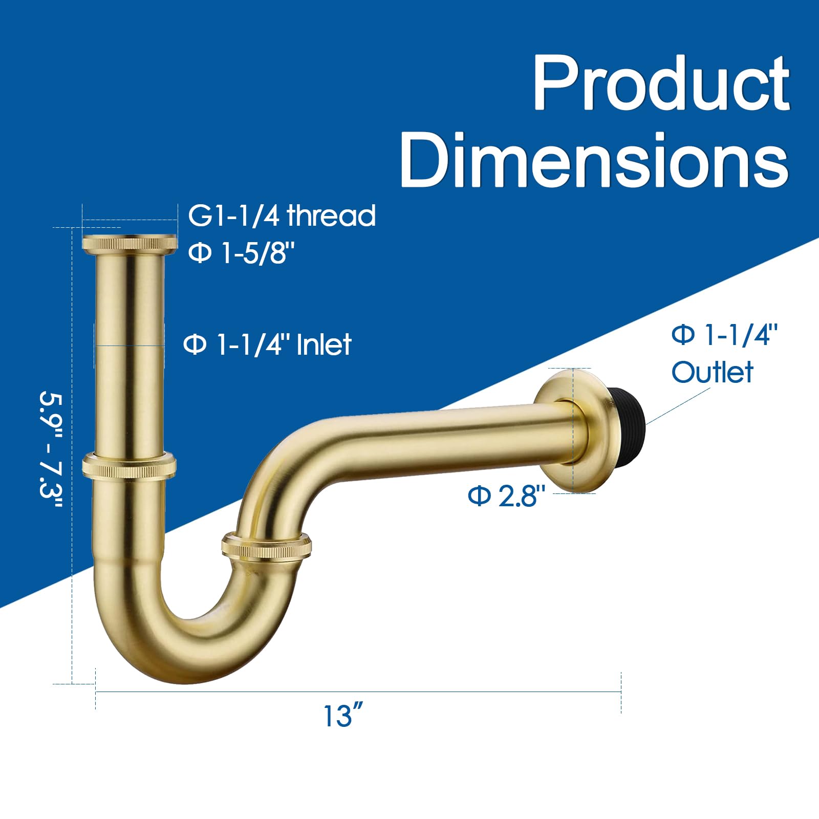 Product Name: Basin Bottle P-Trap Creating a Healthy Environment The P-Trap with Slip Joint Extension Tube is an essential addition to any bathroom. It features a u-shaped design that promotes a high flow rate and efficient drainage. Say goodbye to worries about blockages and unpleasant odors, as this product ensures your plumbing works smoothly. Height Adjustability This sink trap provides great versatility with its adjustable height and vertical pipe design. You can easily customize the setup to match your installation environment for a perfect fit. While the length of the wall drainpipe remains fixed, it can be easily trimmed to accommodate the desired horizontal length. Durable Material The P-Trap is constructed from stainless steel and boasts a sleek gold finish, ensuring both longevity and an attractive appearance. Modern and Stylish Design Specifically designed for wall-mounted sinks, this P-Trap offers a decorative alternative to traditional exposed P-trap fittings. It adds a touch of elegance to your restroom, enhancing its overall aesthetic. Bottle P-Trap Dimensions Adjustable height: 5.9 - 7.3 inches Length (Fully Assembled): 13 inches Fits 1.25" Diameter Inlet Pipe (standard 1 1/4" connections to basin waste) Flange Diameter: 2.3 inches