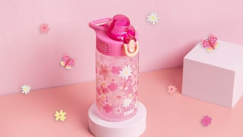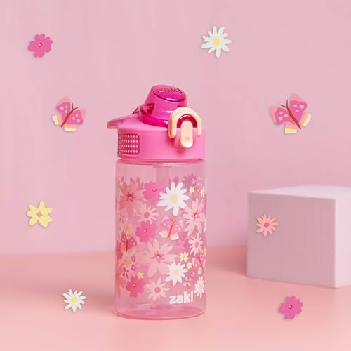 "Let kids enjoy hydration with a fun water bottle by Zak Designs! Reusable and Durable Material: Reusable water bottles will last wash after wash—good news for you and the environment! The 16 oz water bottle is made of PP plastic, durable enough for kids to use every day and bring on any adventure. Leak-Proof Lid: The lid screws on securely and won't leak when the spout is closed, though water flows for easy drinking when the spout is open. The easy-open button has a flip-up lock to keep it from activating accidentally. On the Go: The water bottle has a built-in carrying loop on the lid for easy transportation, and with the spout cover to keep the spout clean and closed, it can be tossed into a bag for worry-free travel. Specifications: 16 oz capacity. Made of durable plastic. BPA-Free - Zak is committed to safety. Dishwasher safe, do not microwave. Length: 4.33-inch, Width: 2.78-inch, Height: 7-inch. Design: Flower Power."