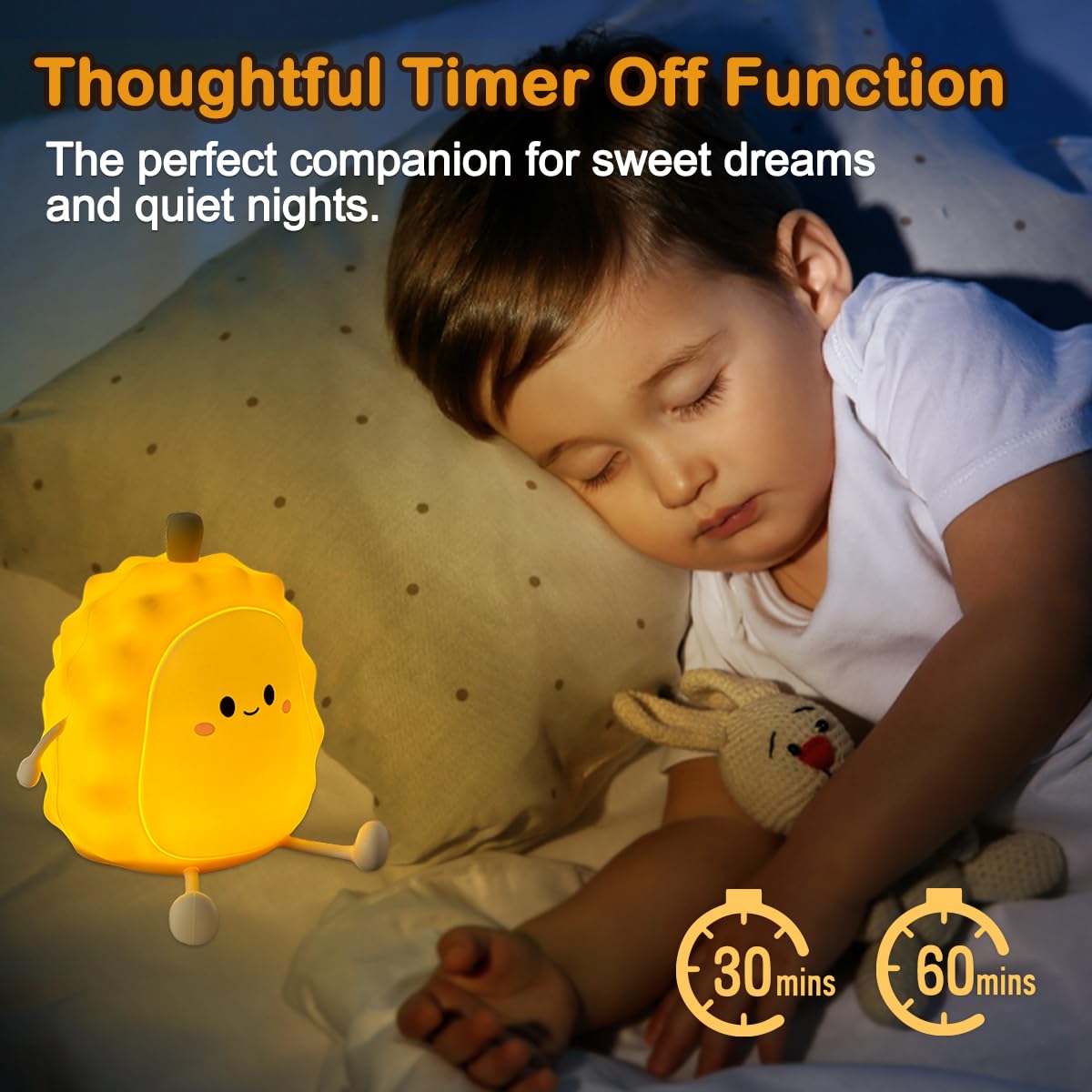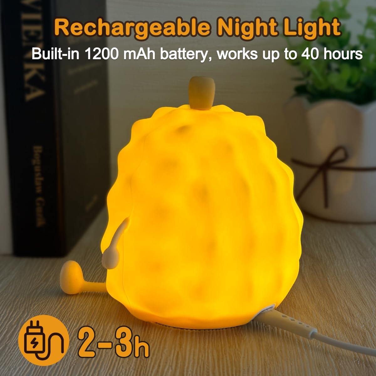 【USB rechargable &portable】1200mAh rechargeable Battery operated lazy Durian night lights can be powered with the micro USB outlet plug in for charging,use time Max 15hours, kids can bring the nursery night lights with them when traveling.