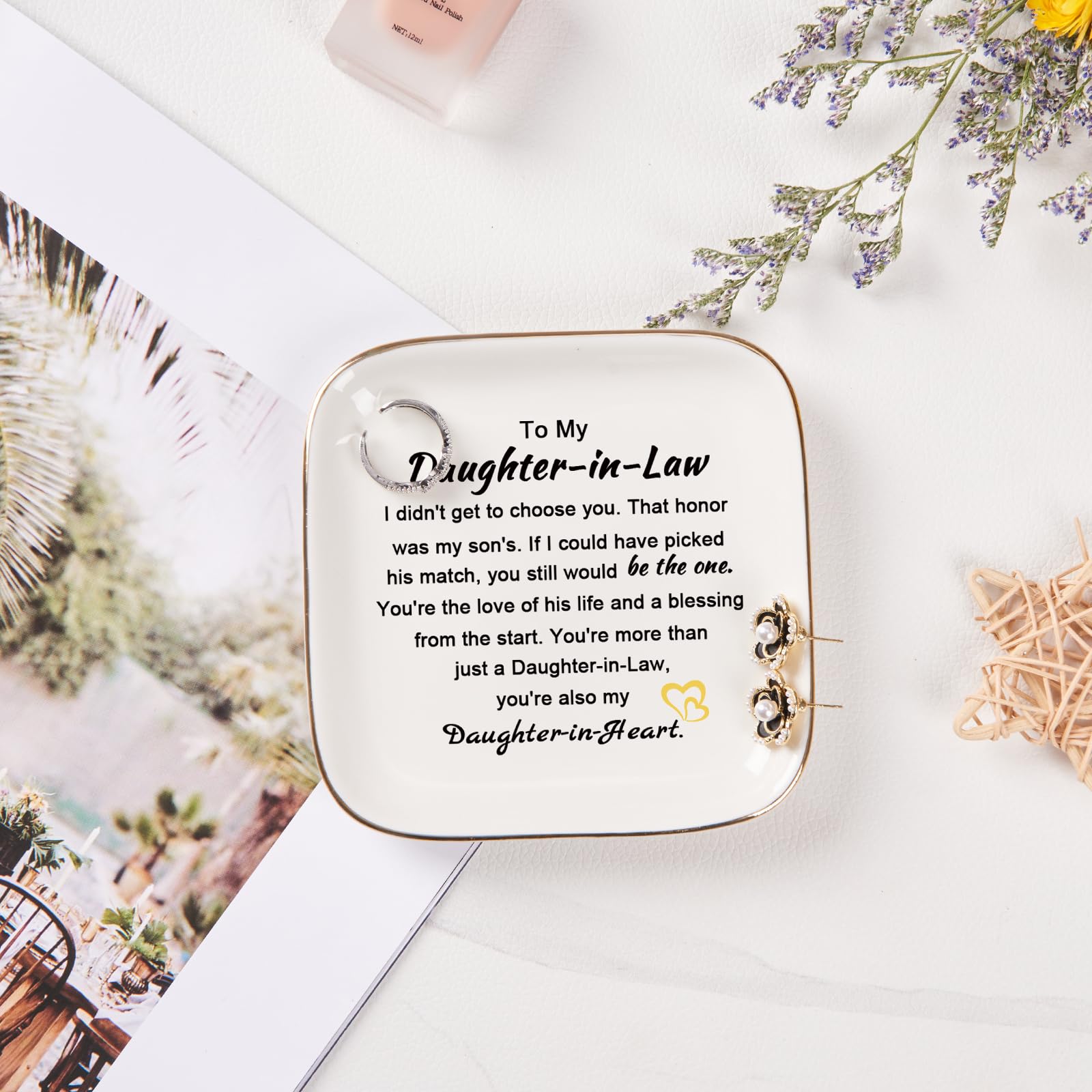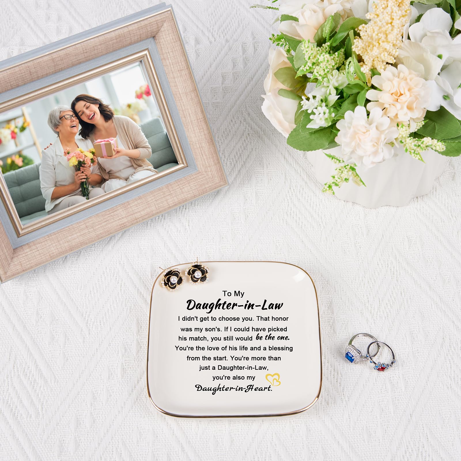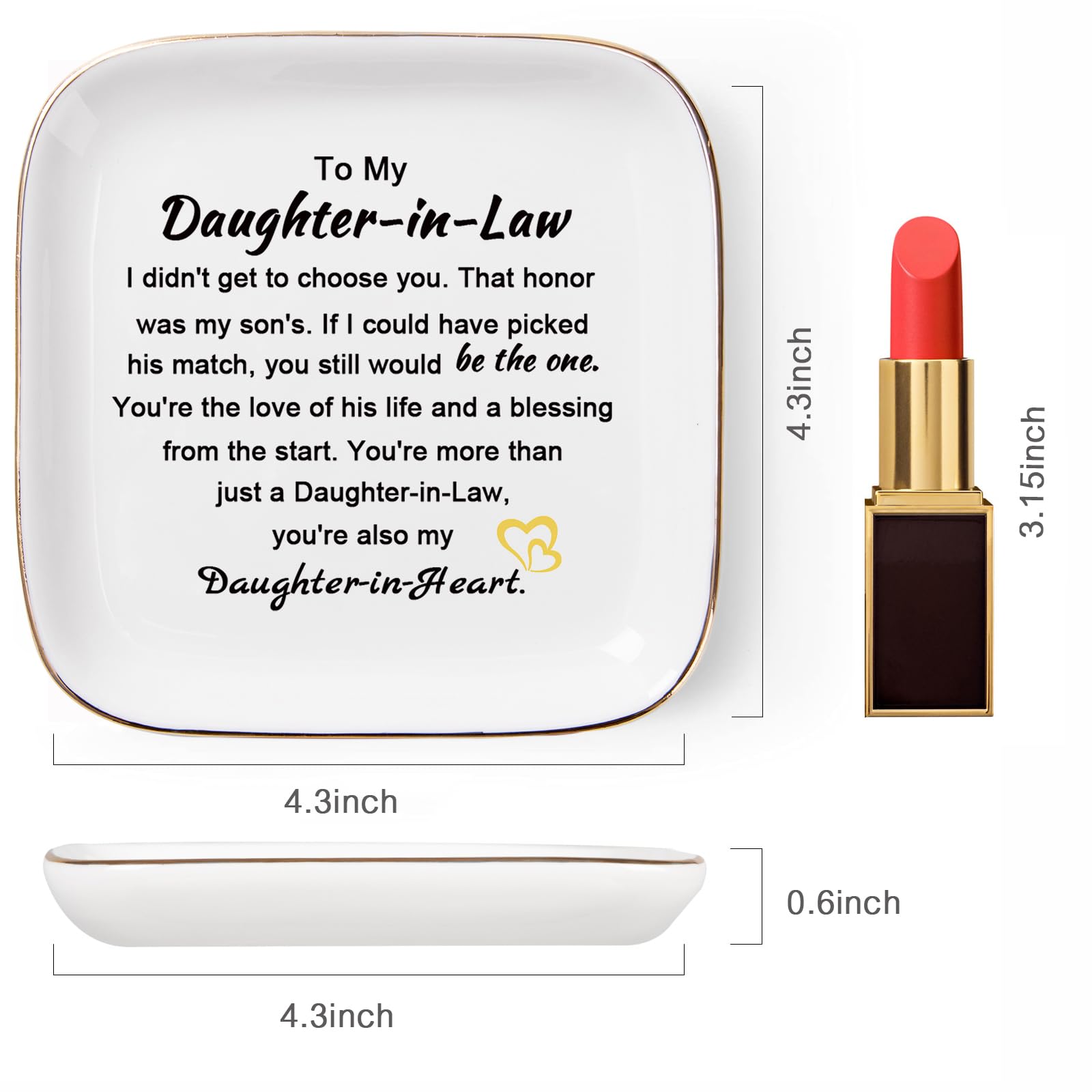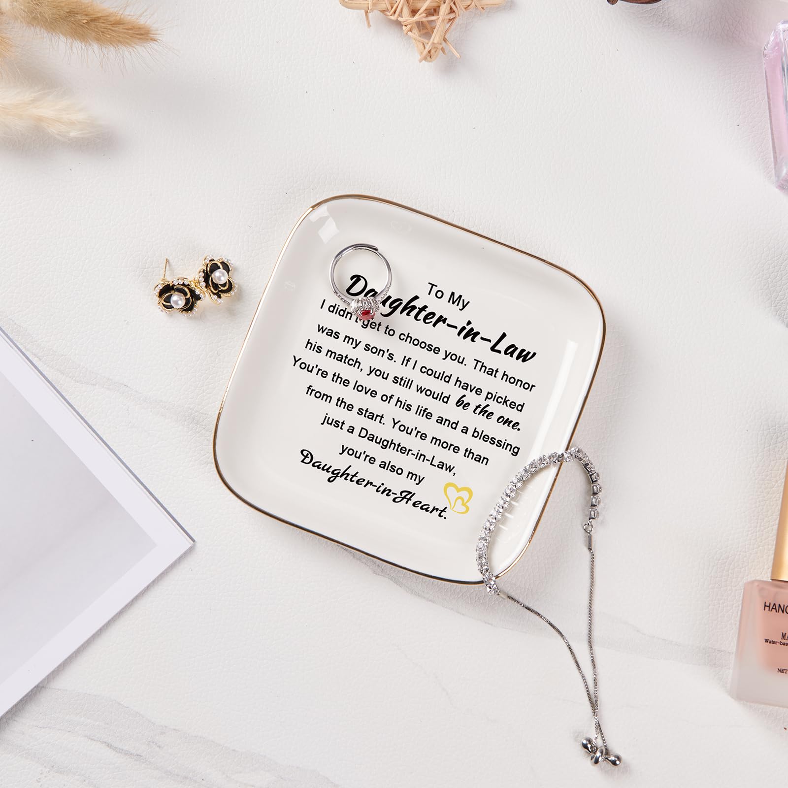 【Daughter in Law Gifts】"To my daughter-in-law, I didn't get to choose you. That honor was my son's. If I could have picked his match, you still would be the one. You're the love of his life and a blessing from the start. You're more than just a Daughter-in-Law, you're also my Daughter-in-Heart." Special designed Daughter-in-Law-themed trinket dish gift for daughter-in-law, whose birthday, wedding, Christmas, Valentine's day, Mother's day, or new year.