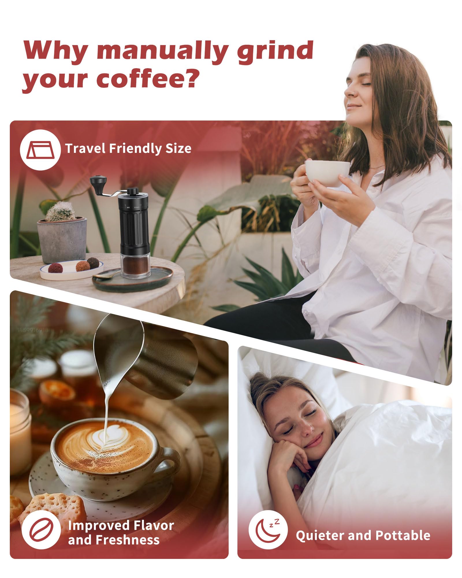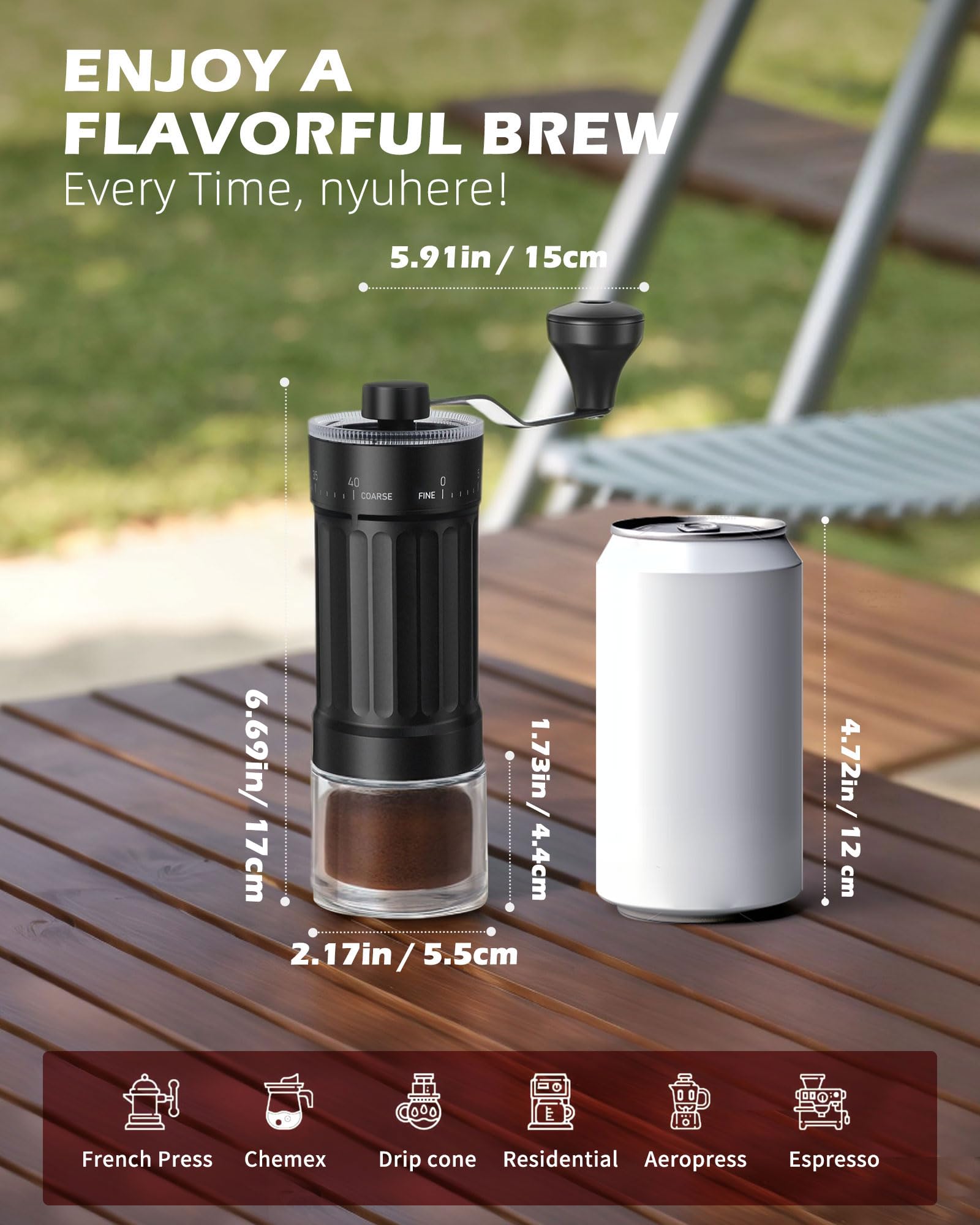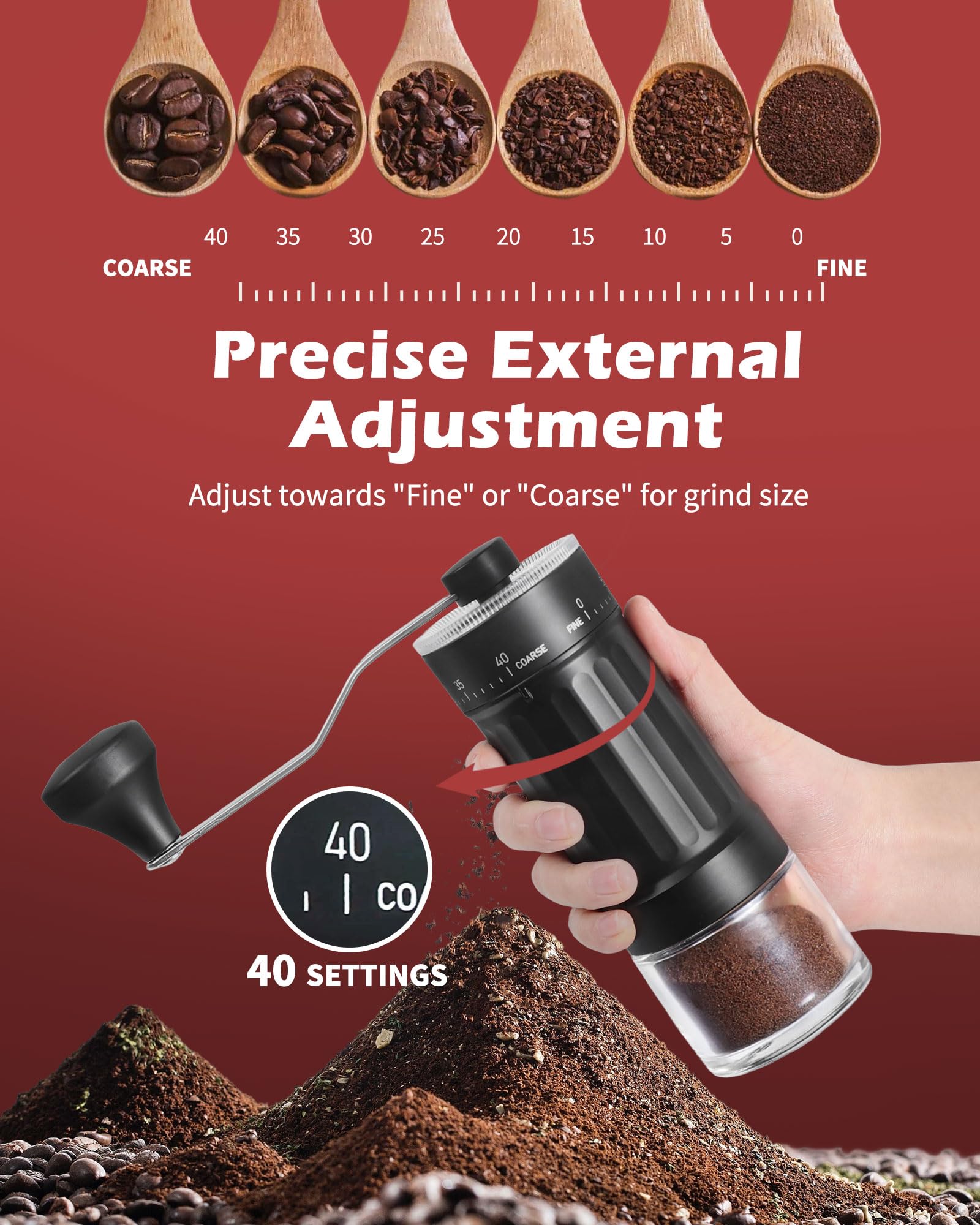 Experience the rich flavors of freshly ground coffee with the GCCTXC Manual Coffee Grinder. This hand grinder features 40 external adjustable grind settings, allowing you to tailor your coffee to the perfect consistency for French press, cold brew, espresso, and more.