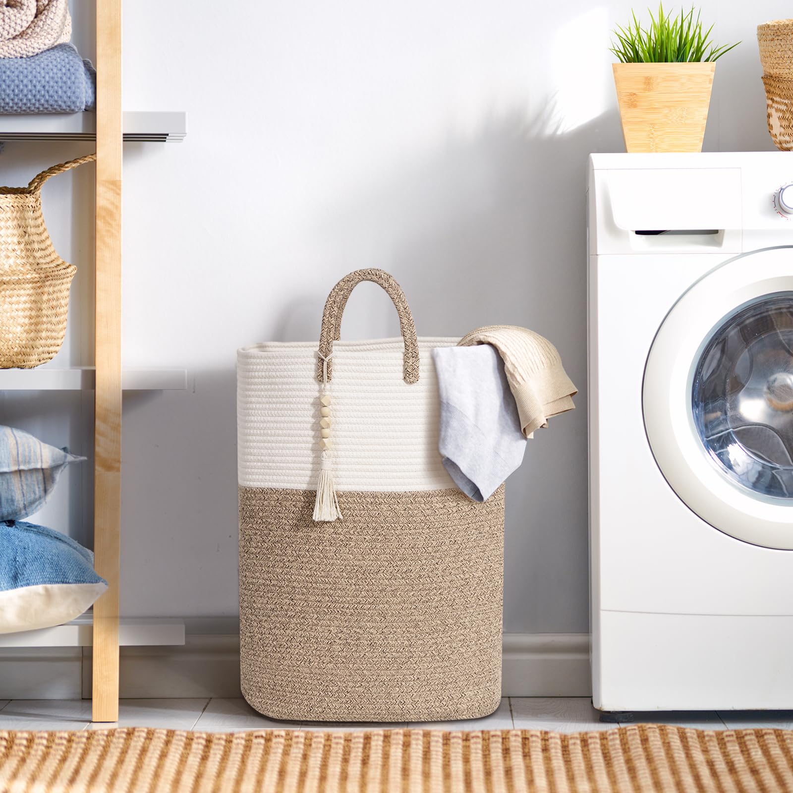 🌈[DURABLE, BREATHABLE & SKIN - FRIENDLY COTTON]: Made of sturdy and odor-free rope cotton, woven laundry basket has a solid addition to any space. Tall laundry basket quite sturdy and spacious, capable of holding a good amount without losing its shape, which adds to its practicality.