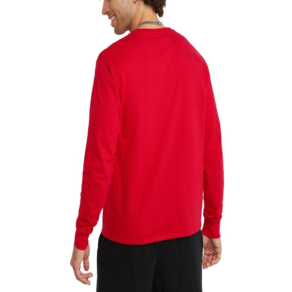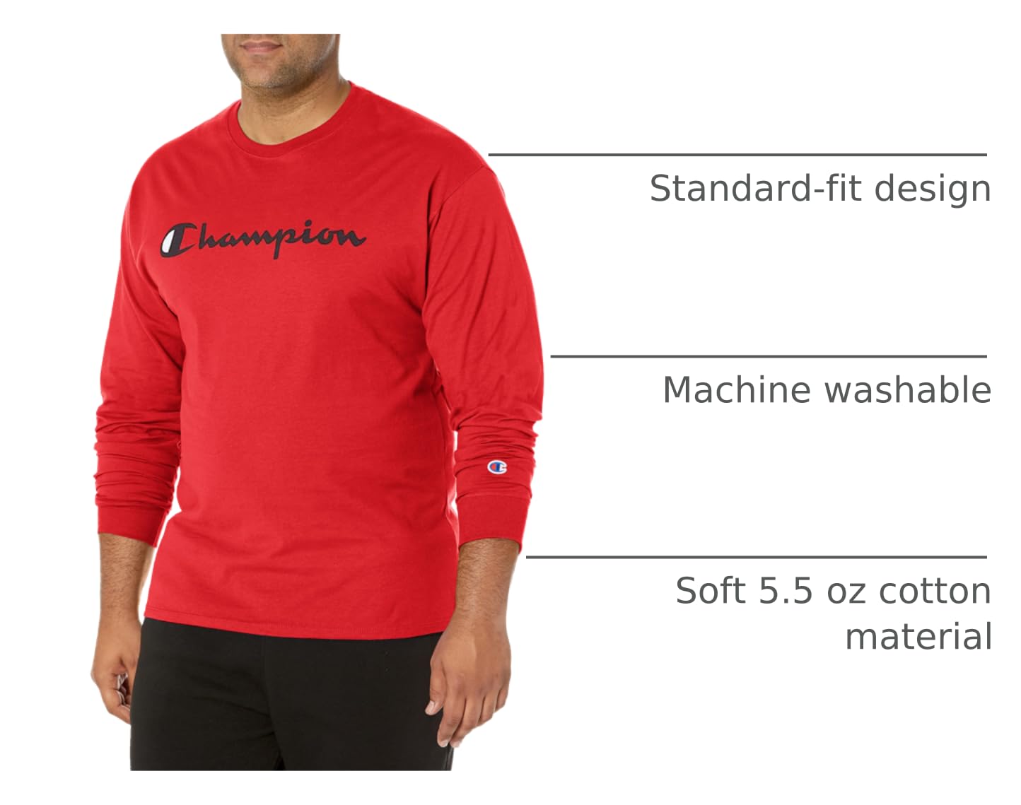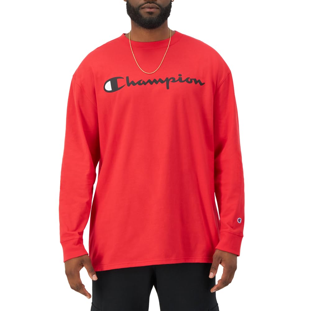 Description A STAPLE FOR ALL SEASONS. A good-to-go long-sleeve shirt is an ideal addition to your year-round wardrobe. Rock this Big & Tall men's long-sleeve T-shirt solo on a breezy night or layer it under your favorite Champion jackets and hoodies for styled warmth. This versatile tee has a soft, worn-in texture you'll love and the cut is made for a Big & Tall frame. The iconic C patch on the chest and sleeve gives that Champion look you trust. From red to black options, there's a look to match your every vibe.