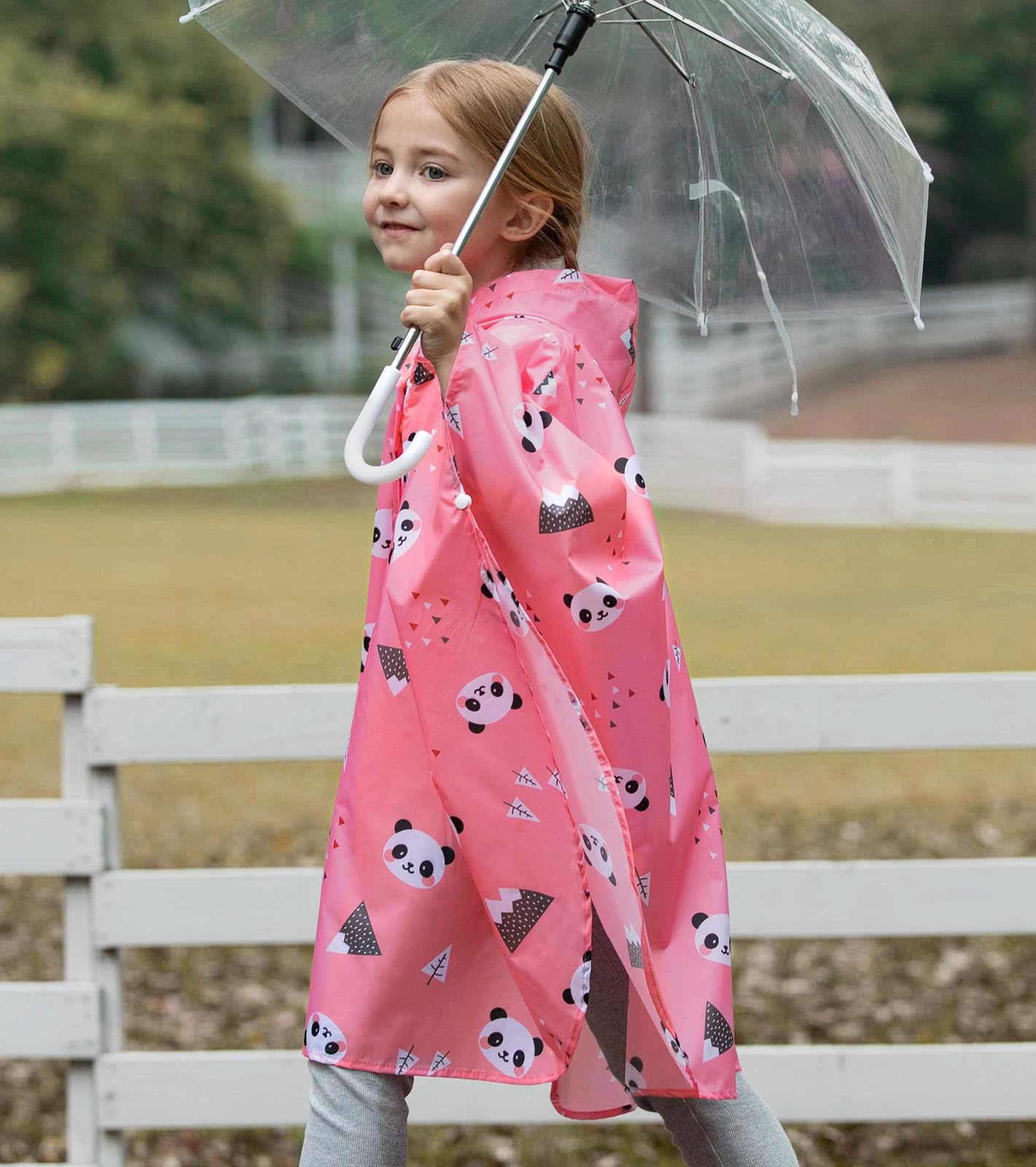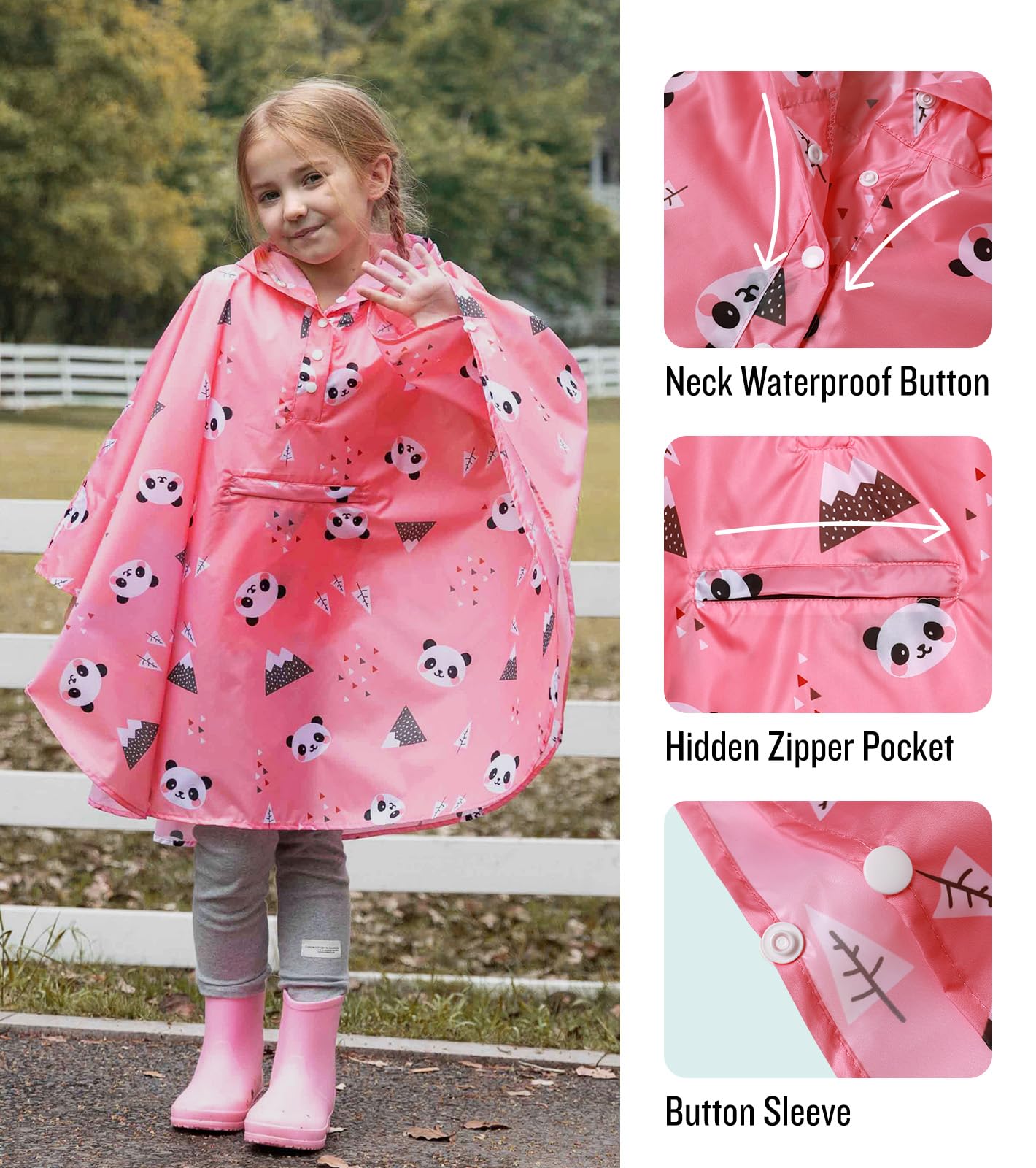[Design]: Full rain poncho cover, with snaps on hood / Zippered front pocket, for daily necessities items / Various colors and cartoon patterns, bring joy to kids