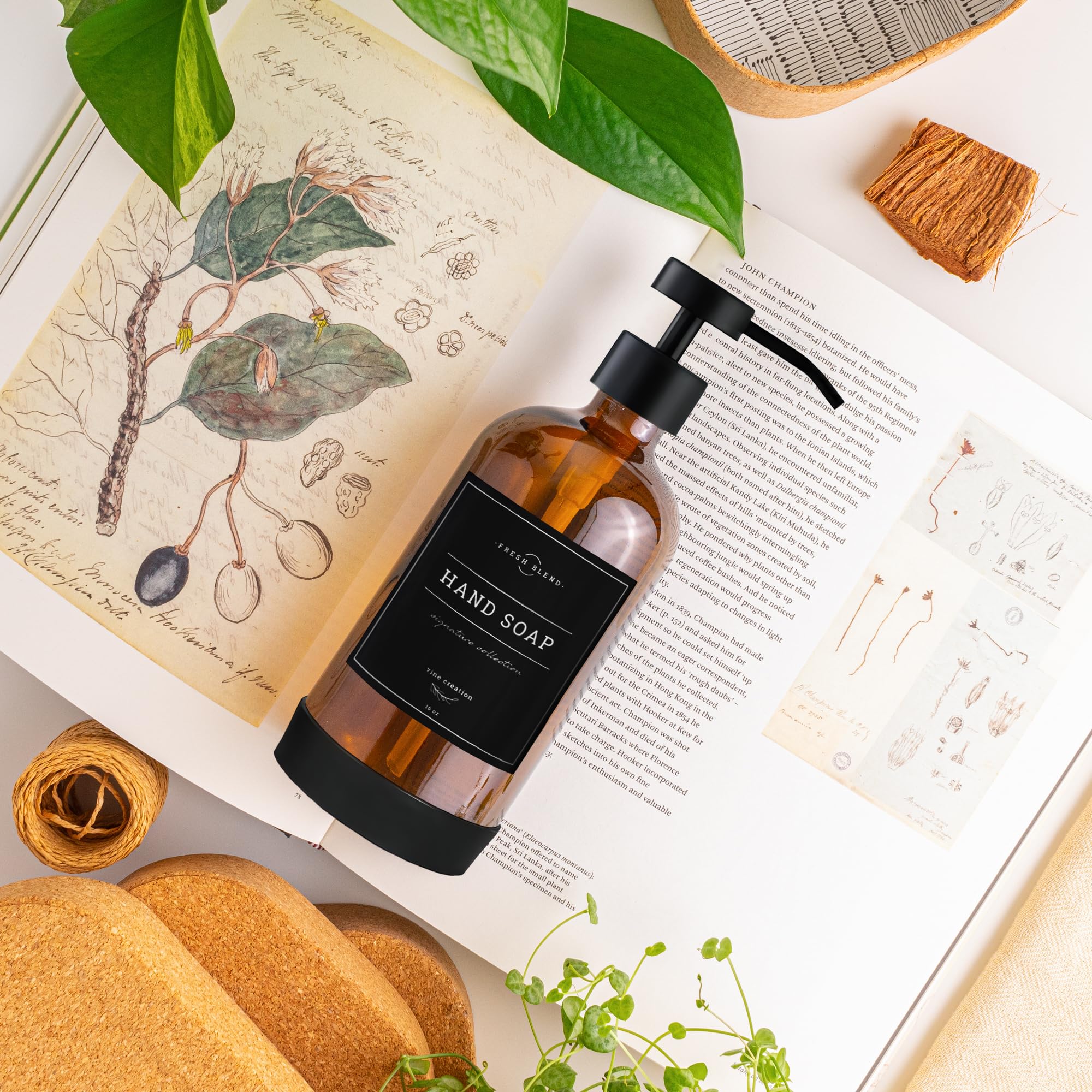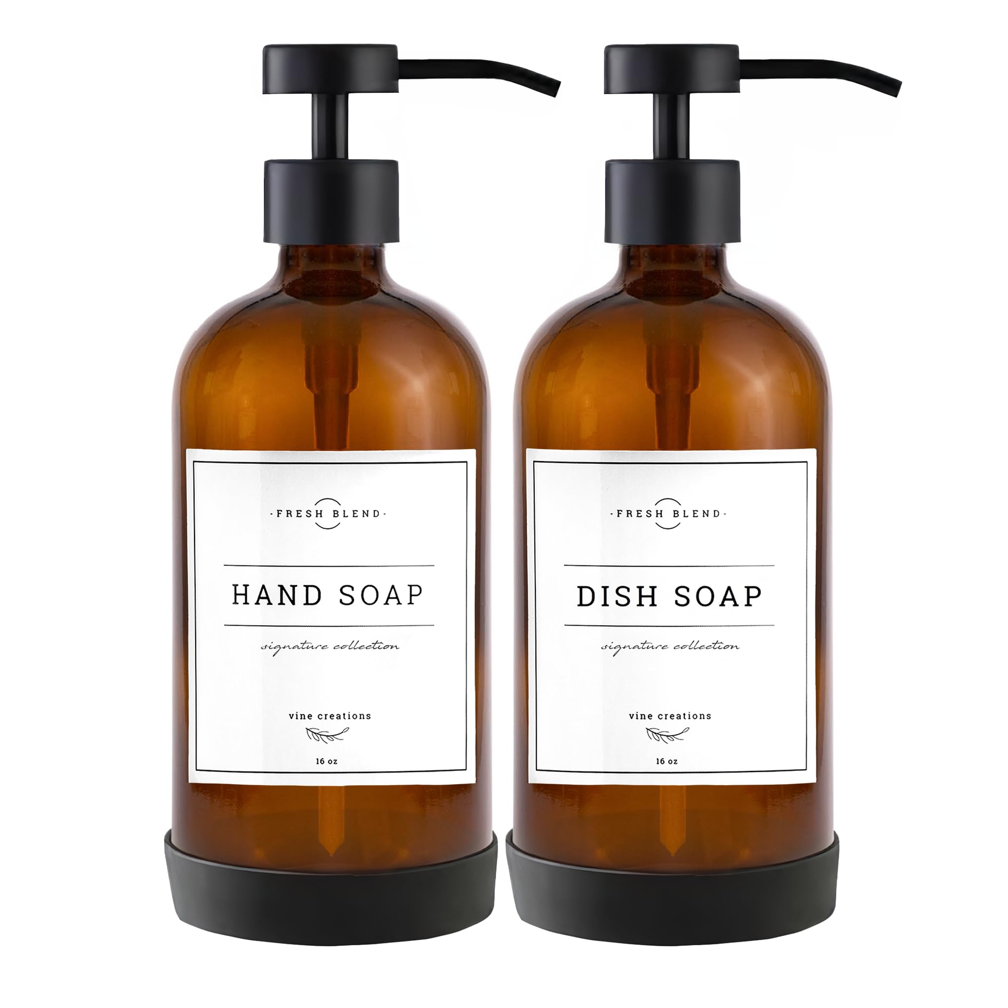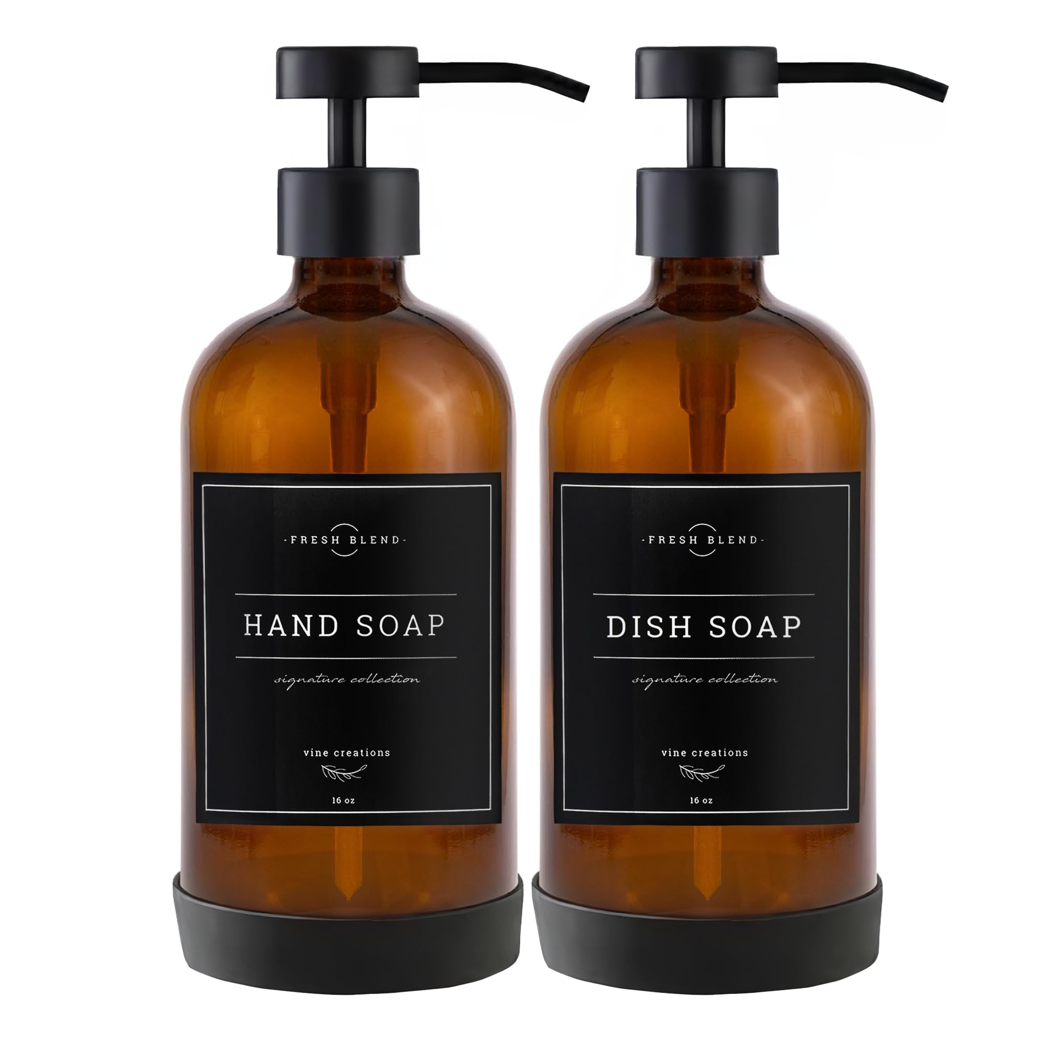 UNRIVALED CONSTRUCTION - Set of 2 premium glass soap dispenser with pump. 16 Oz fortified amber bottles, refillable soap dispenser for daily use. Vine Creations soap dispensers are Lead-free.