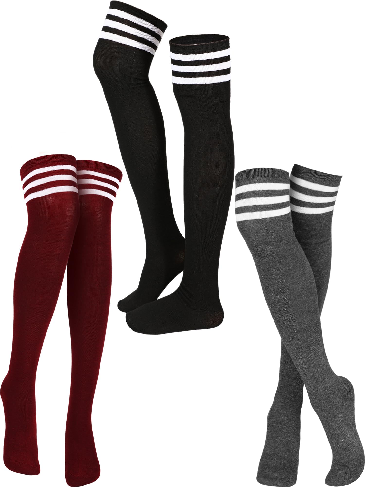 Quantity and Size: package includes 3 pairs of classic stripe over the knee socks, 3 colors are available (as the picture shown); Each striped thigh high sock measures approx. 64 cm/ 25 inches in length, and can be stretched over the knees, one size fits for most women and girls