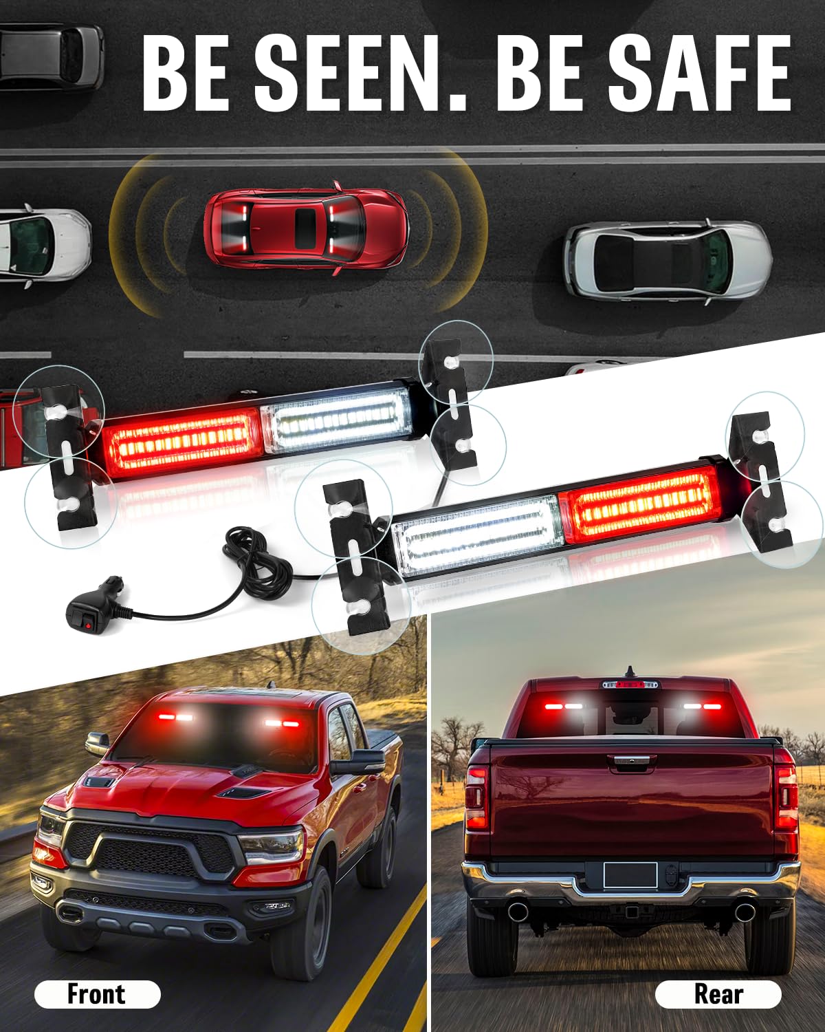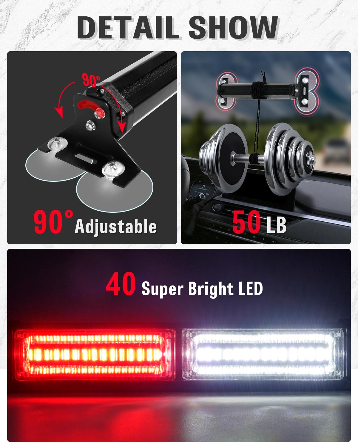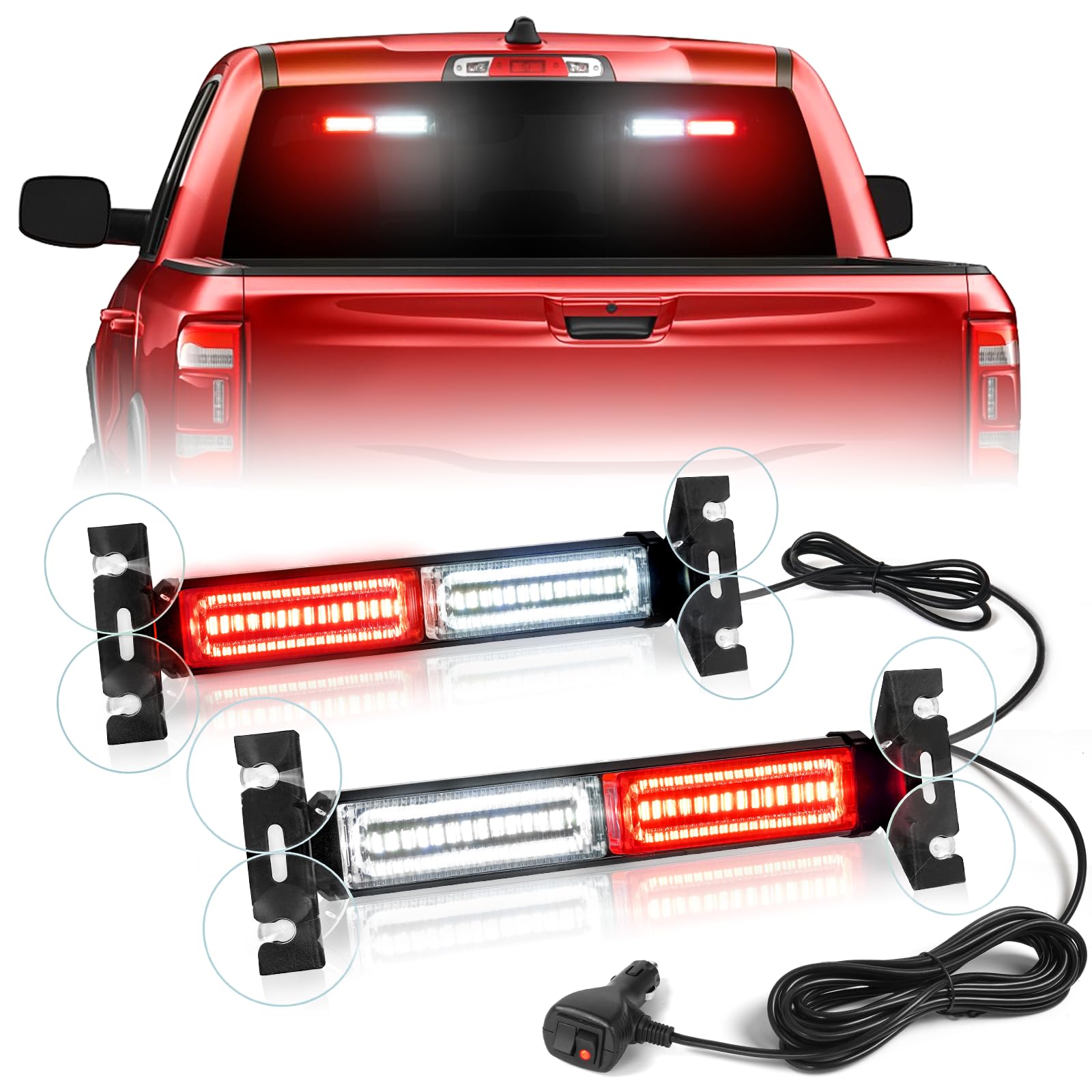 【EASY TO INSTALL】: Equipped with 4 and 90° adjustable strong and stability suction cups brackets, 8 strong suction cups, and 16.4ft long cable, you can easily install this 2 in 1 windshield emergency strobe lights on your rear/front windshield, and exterior of vehicles