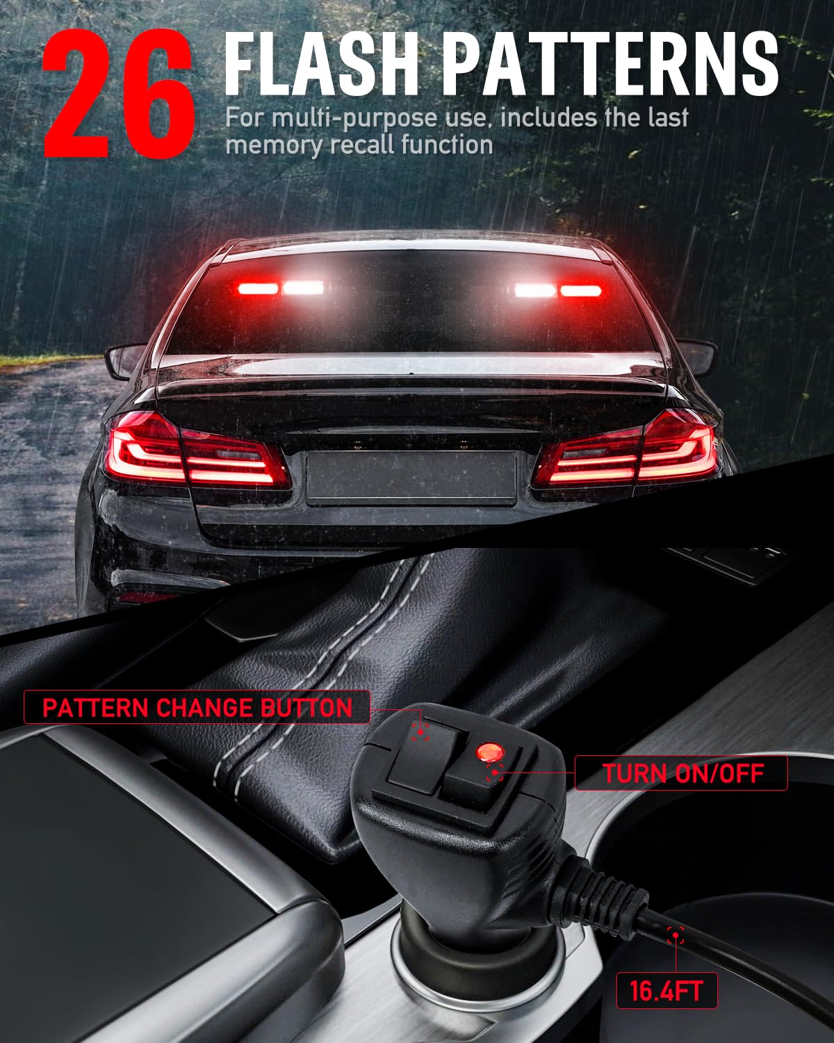 【26 FLASHING PATTERNS WITH LAST MEMORY RECALL】: Just plug in the 12V cigarette lighter, and choose the strobe mode you need. This LED strobe light bar can be widely used for Hazards Warning, EMS, Law Enforcement, First Responders, Emergency Vehicles, Construction Vehicles, Police, Tow/Work Truck, Snowplow, Postal and City Service Workers, etc
