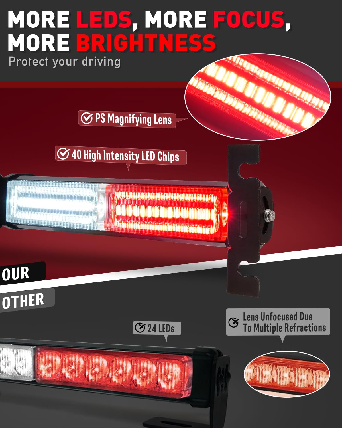 【MORE LEDS, MORE FOCUS, MORE BRIGHTNESS】: HLauto 1002L traffic advisor strobe light bar is designed with 40 high-intensity LEDs and PS magnifying lens, making it brighter than the other 24 LEDs traffic advisor strobe light bars. Ensuring your safety in any driving conditions