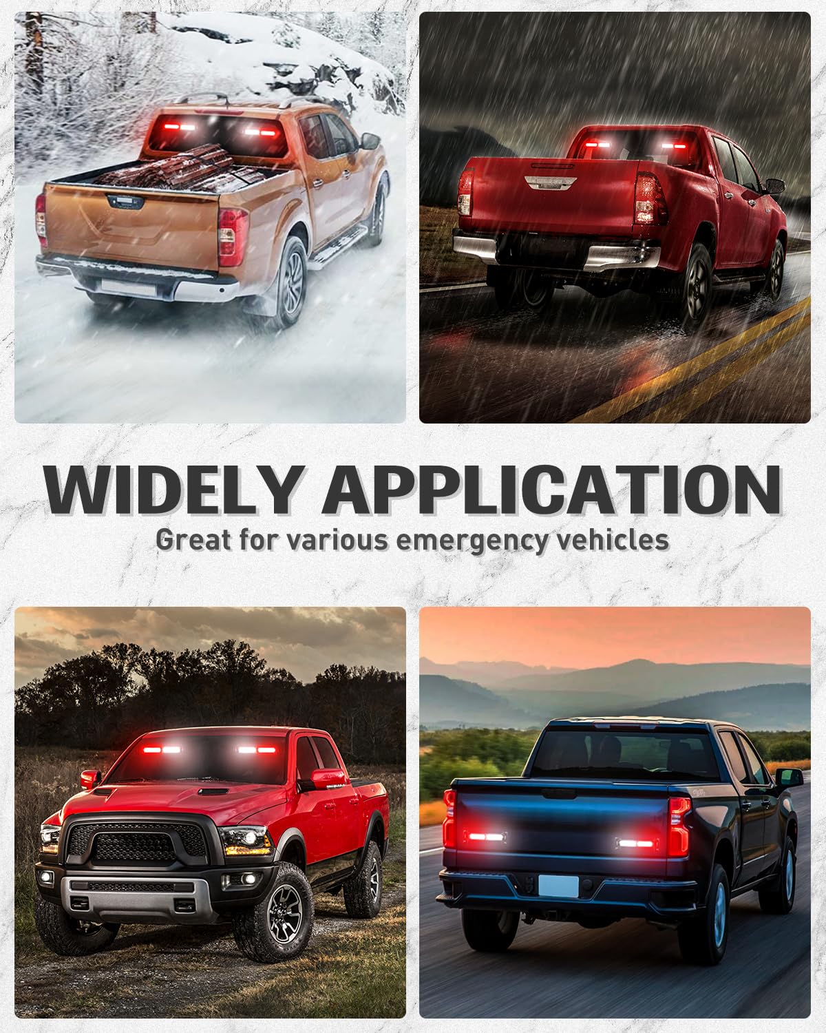 【BUILD TO LAST】: HLauto 1002L emergency warning lights bar is made of heavy-duty aluminum housing for superior heat dissipation. IP67 Water-resistant rating, great for withstand various weather conditions, such as rain, fog, dust storms, snow, mud, and wind seasons, making the light visible from thousands of feet away. Lifespan up to 50,000 Hours