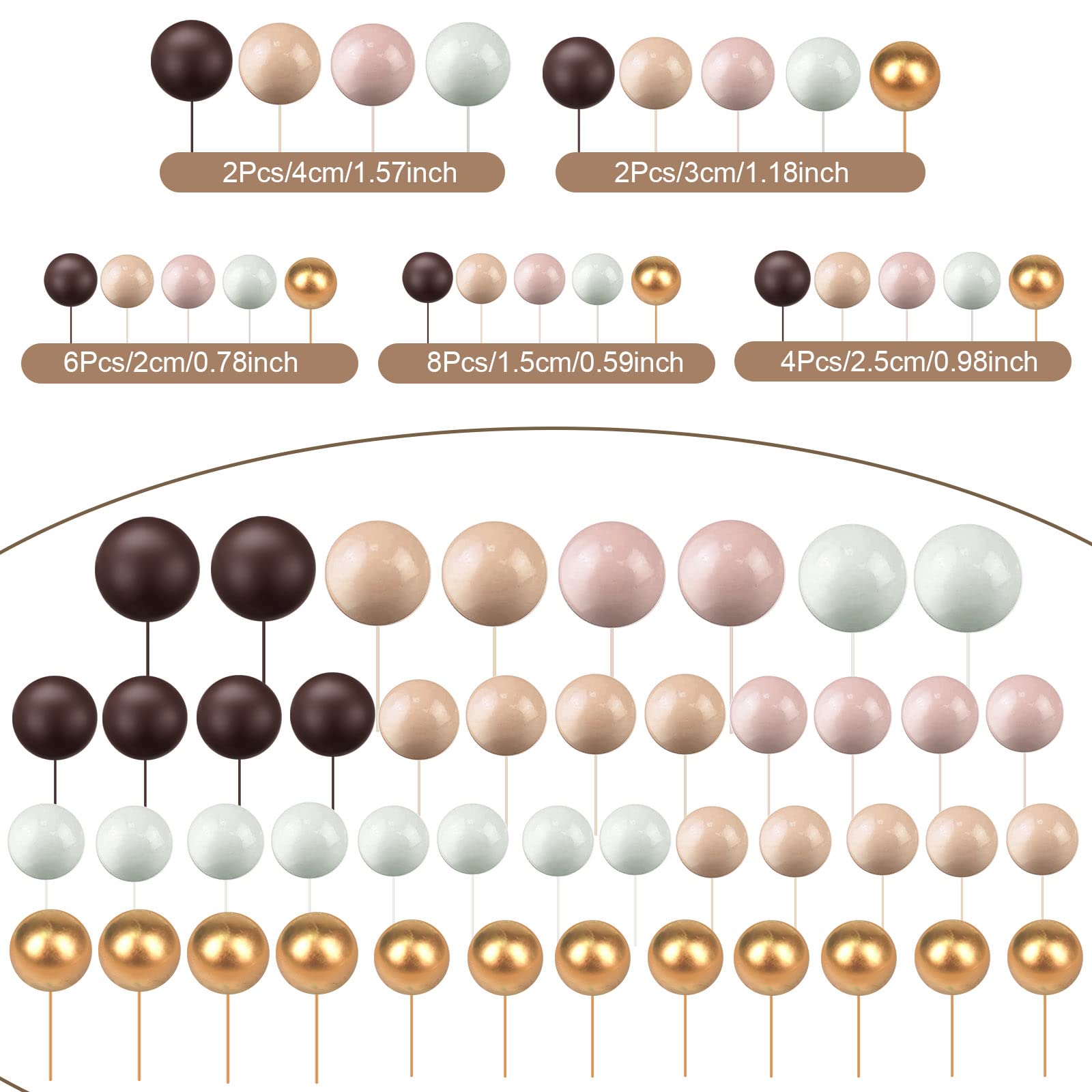 Various Sizes: these ball cake toppers come in 5 different sizes, including 4 cm/ 1.57 inch, 3 cm/ 1.18 inch, 2.5 cm/ 0.98 inch, 2 cm/ 0.79 inch and 1.5 cm/ 0.59 inch; You can make a proper position arrangement based on the size and shape of your cake, a variety of different sizes and different colors to suit your cake decorating needs