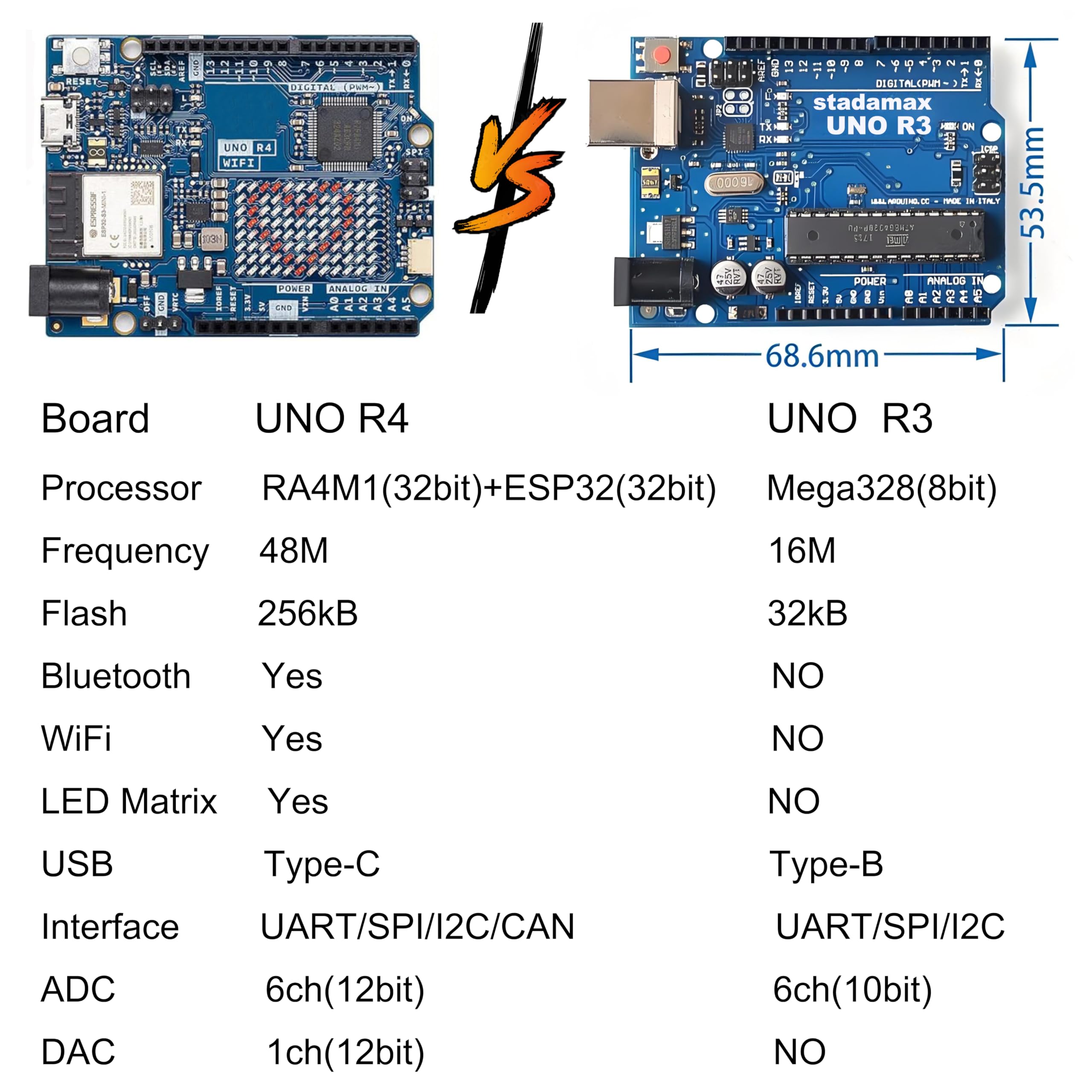 Latest UNO WiFi Board: Uno R4 WiFi Board Upgraded from the Uno R3. Double 32-bit Processor, more Advanced, and Built-in WiFi and Bluetooth, Enabling Connection to Third-party Apps. Satisfy remote IoT control.