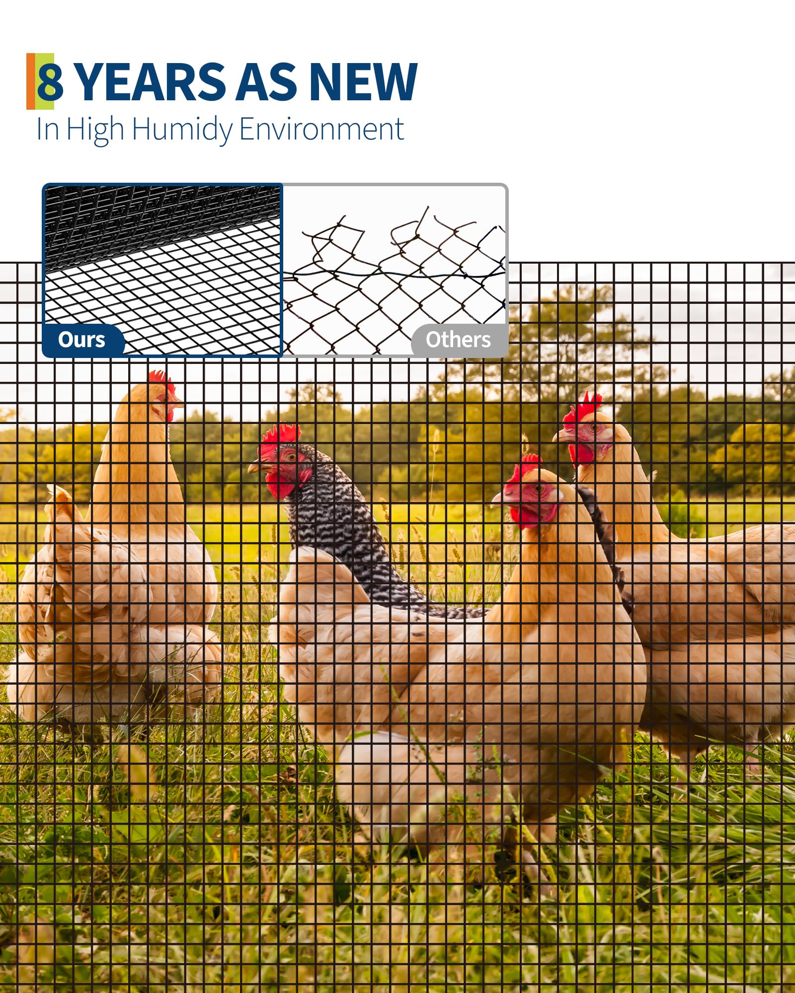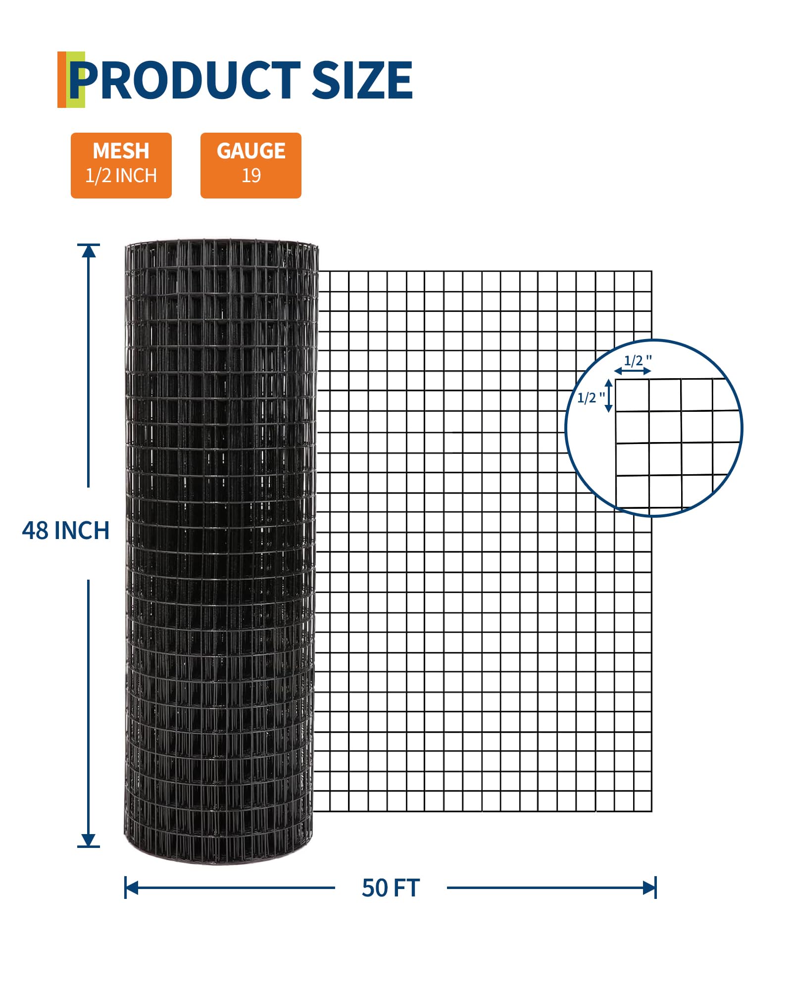 Product size:The size of chicken wire fencing is 1/2 in x 1/2 in square mesh, 48 in ×50 ft.Please purchase the appropriate width and mesh according to your needs.