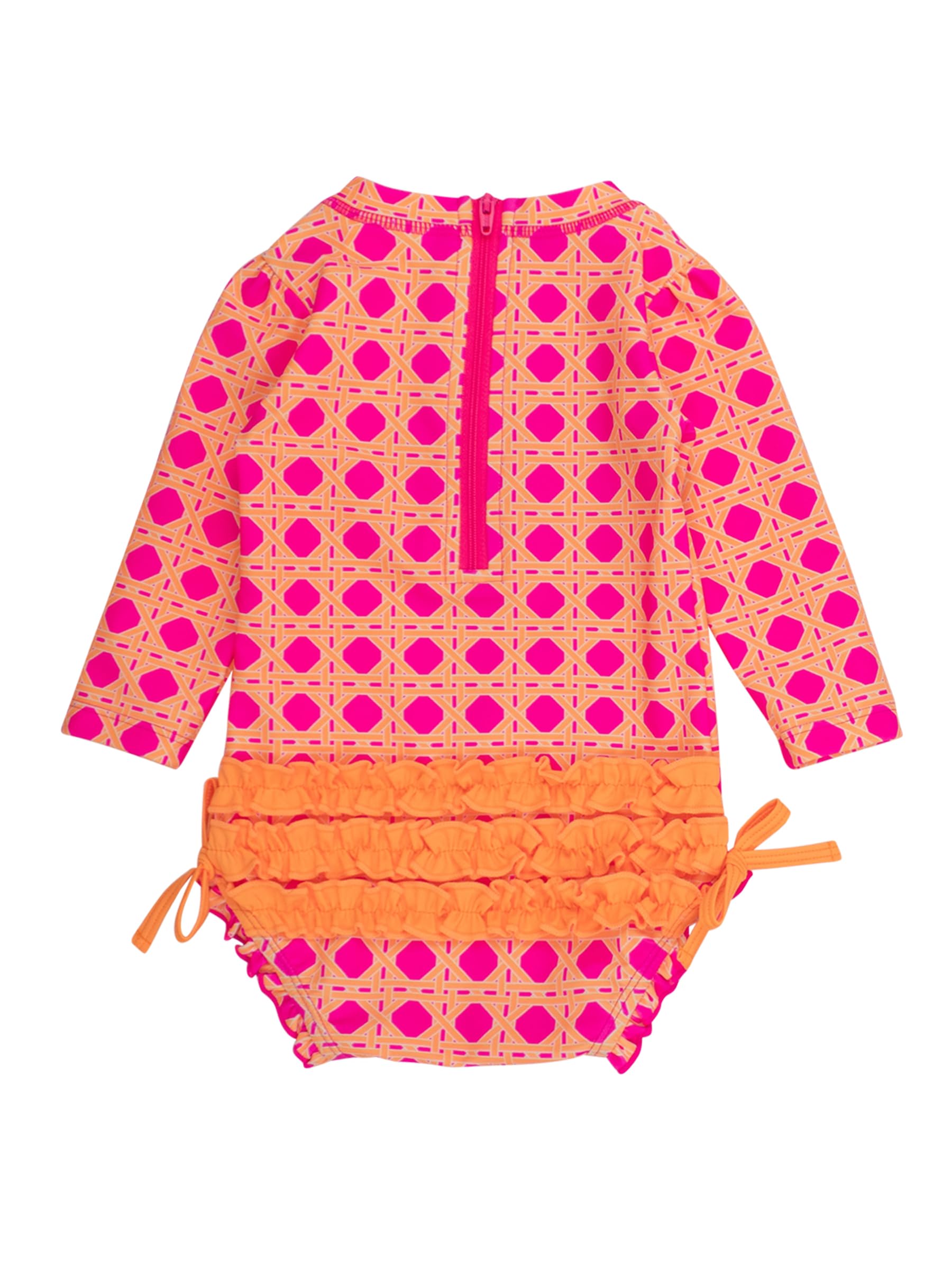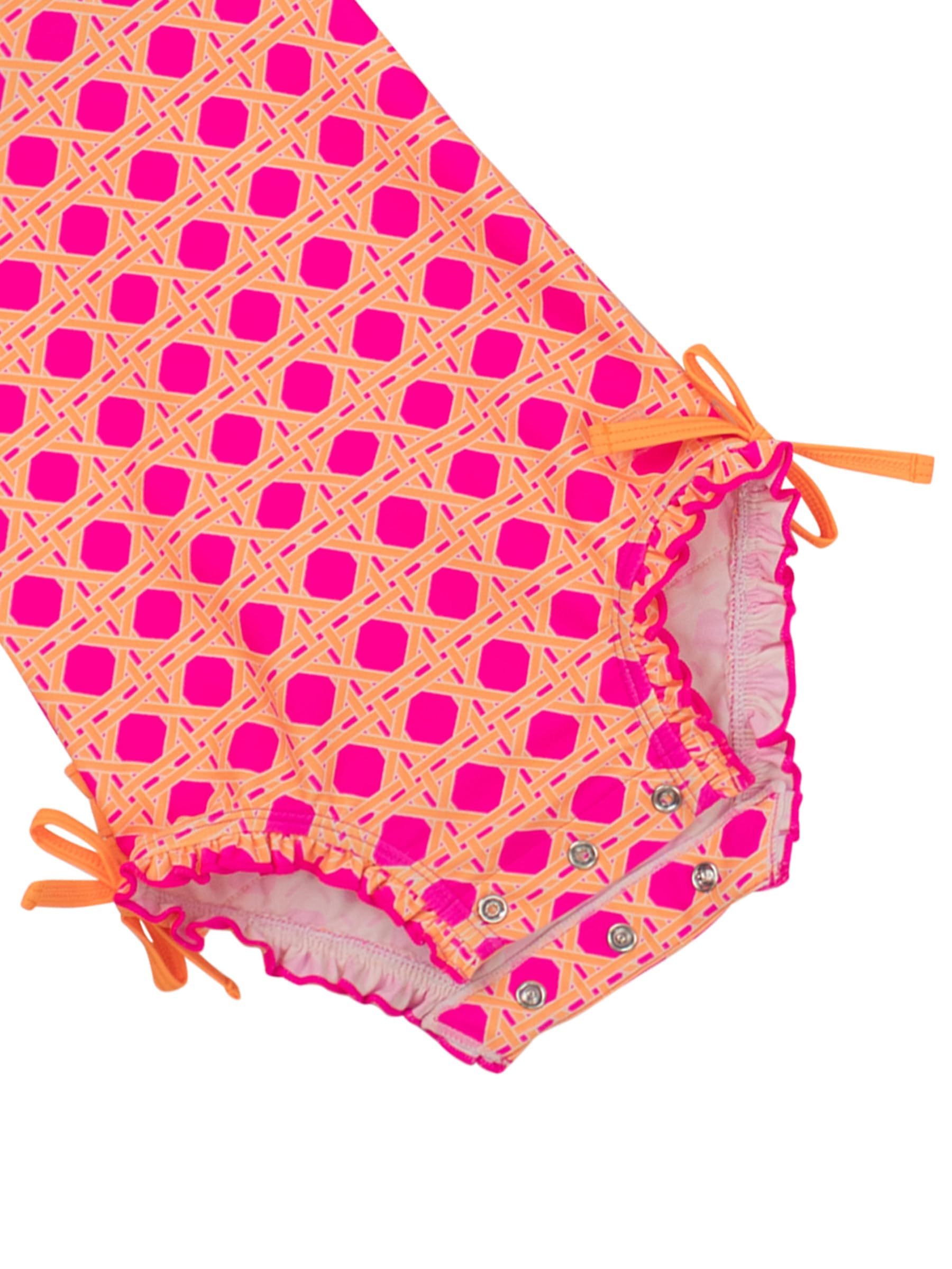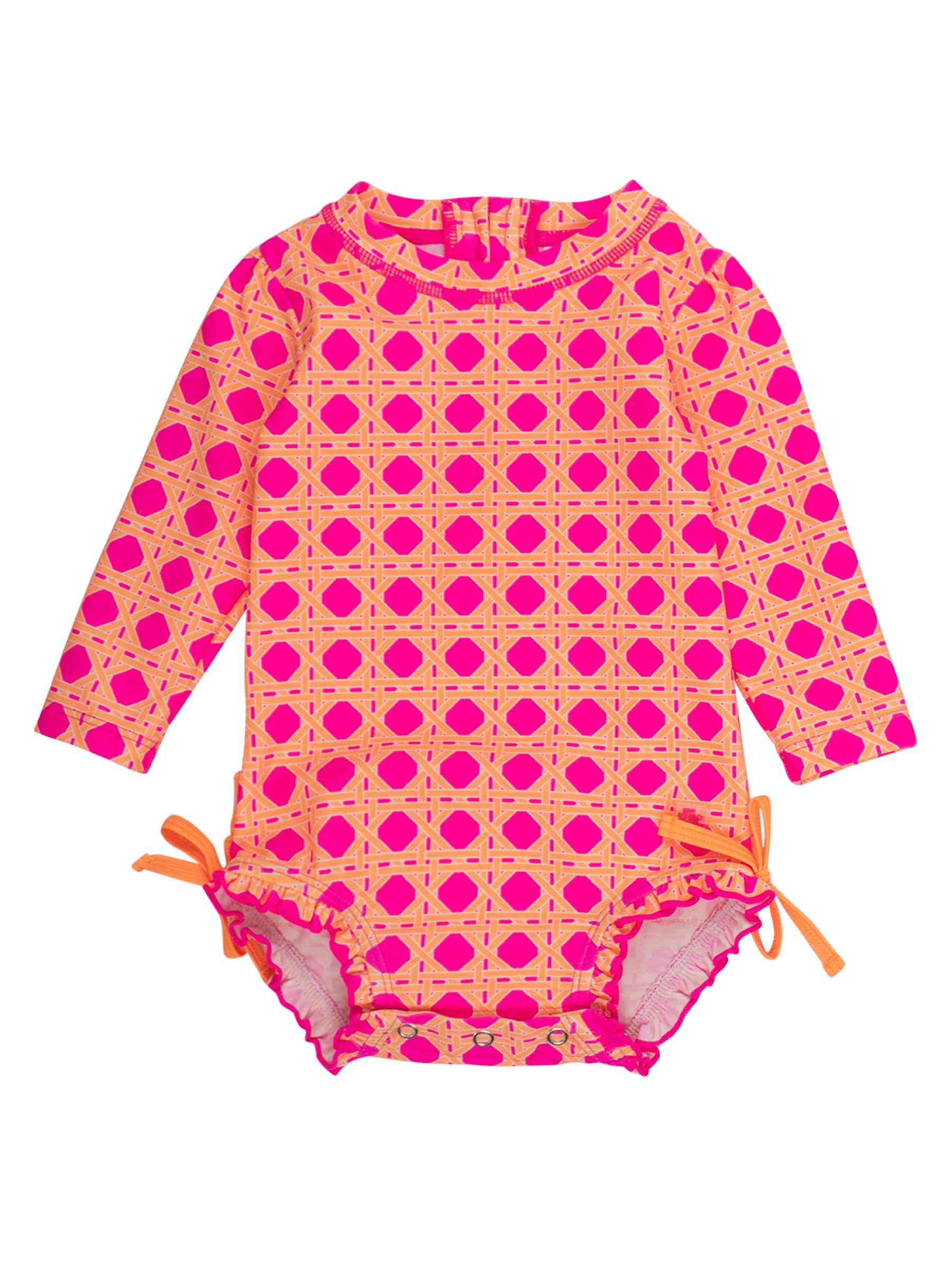 Description A wonderful addition to your little girl's swimwear, this Tropical Baby One Piece Rash Guard is comfort and style rolled into one. Unlined with snaps at bottom that make for easy changing. Made with sun protected fabric for all day protection and comfort.