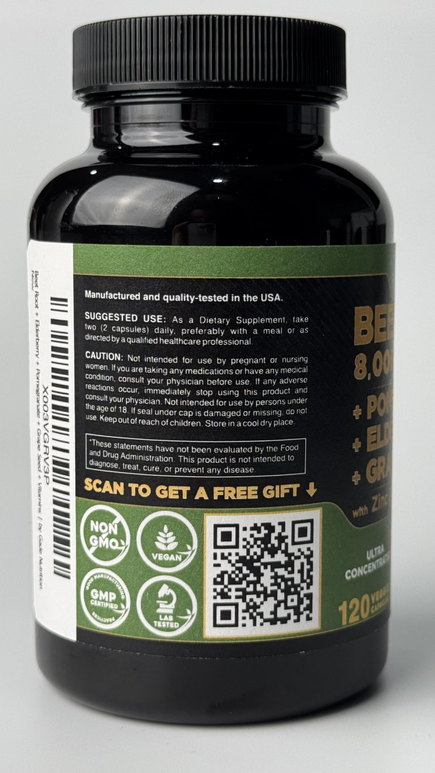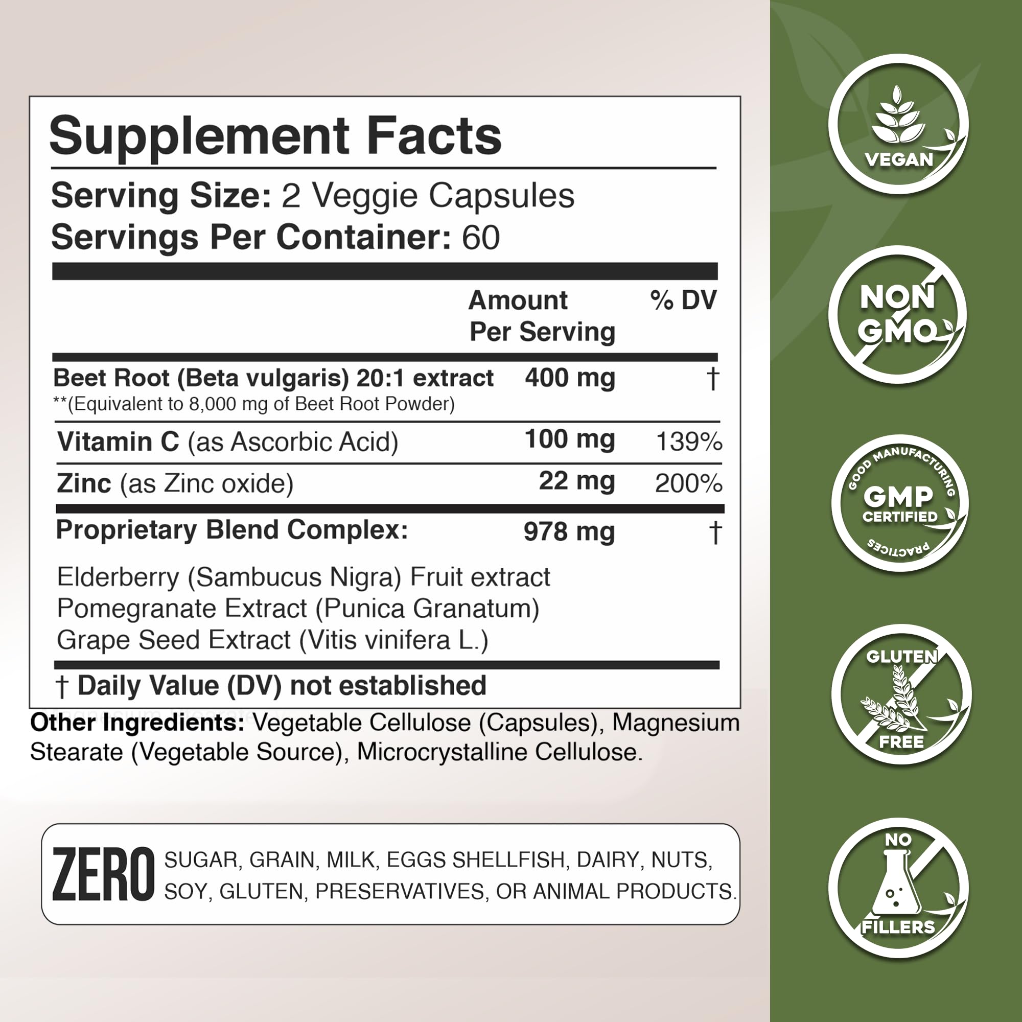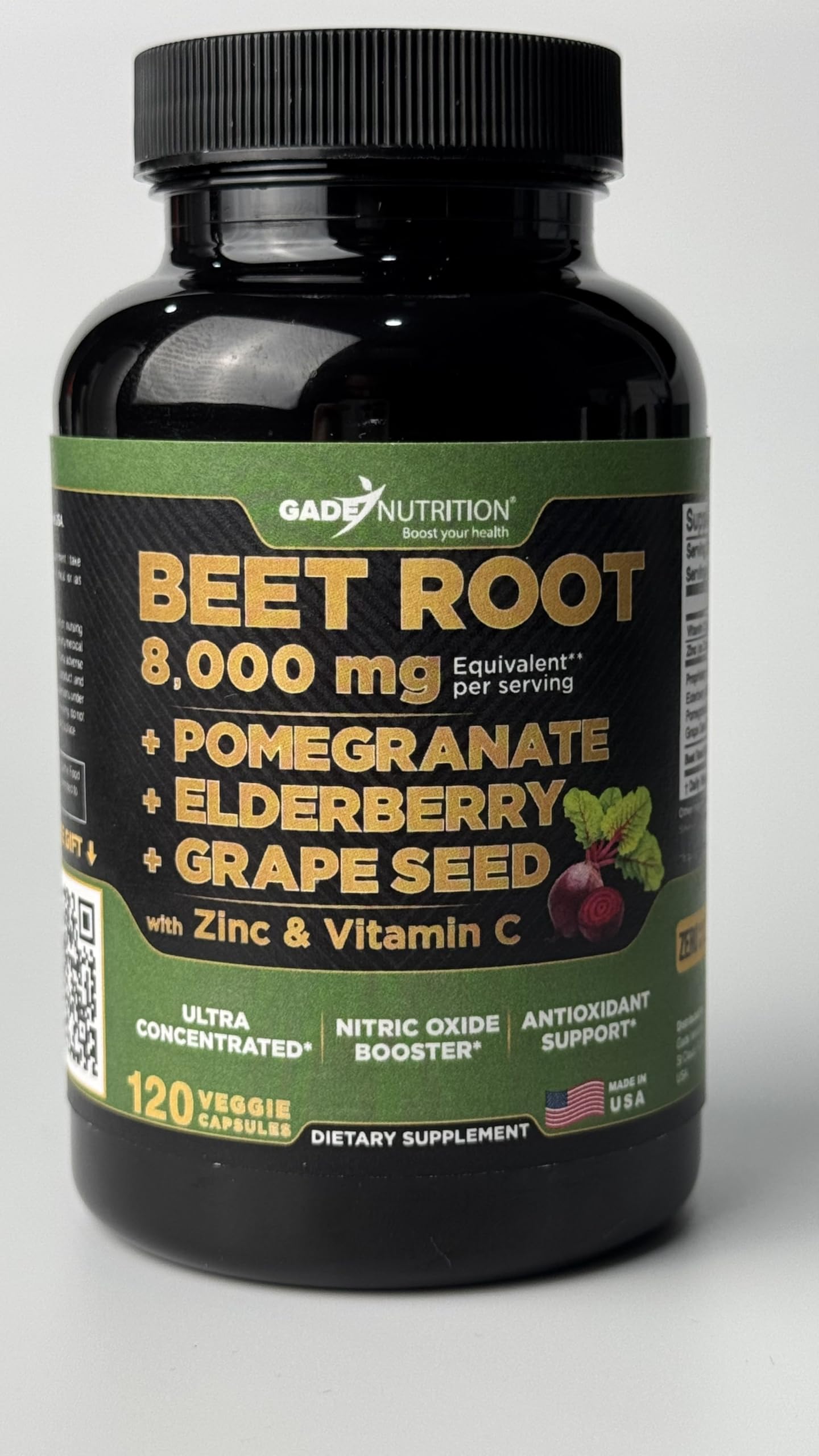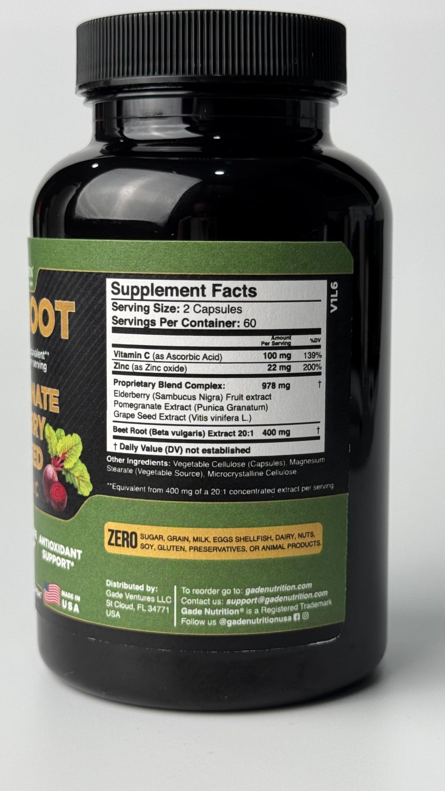 EXTRA STRENGTH FORMULA: Gade Nutrition Beet Root capsules naturally contain beneficial nitrates that boost nitric oxide levels and improve overall circulation and blood flow. Our supplement is enriched with Sambucus Elderberry, Pomegranate, Grape Seed powder, Vitamin C, Vitamin A and Zinc. It’s a powerful compound to promote heart health, improve cognitive function, improve performance, and boost overall good health and well-being