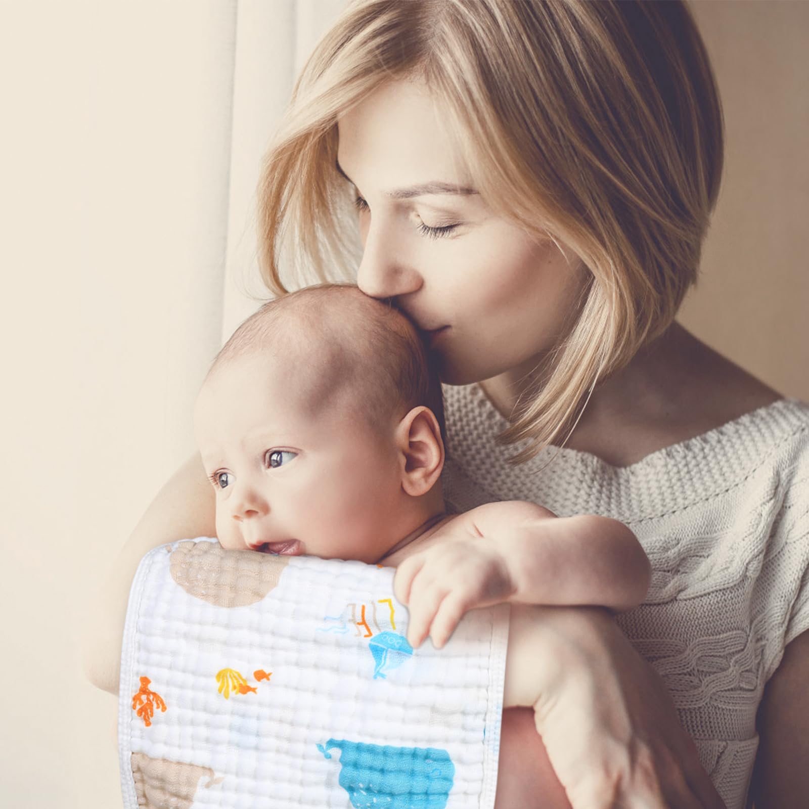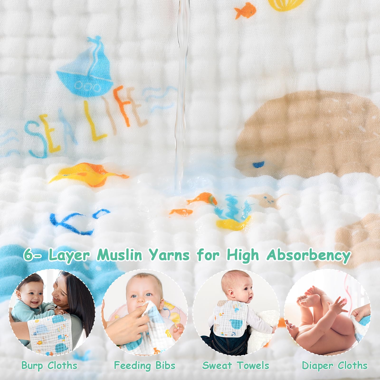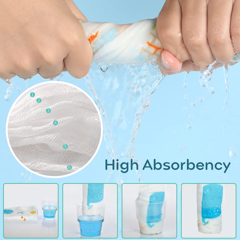 EXCELLENT ABSORBENCY - With 6-Layer thickening design fabric, these face cloths provide premium softness, breathability and durability. Soft material features its super liquid-absorbing and quick-drying nature, giving baby's skin perfect care.