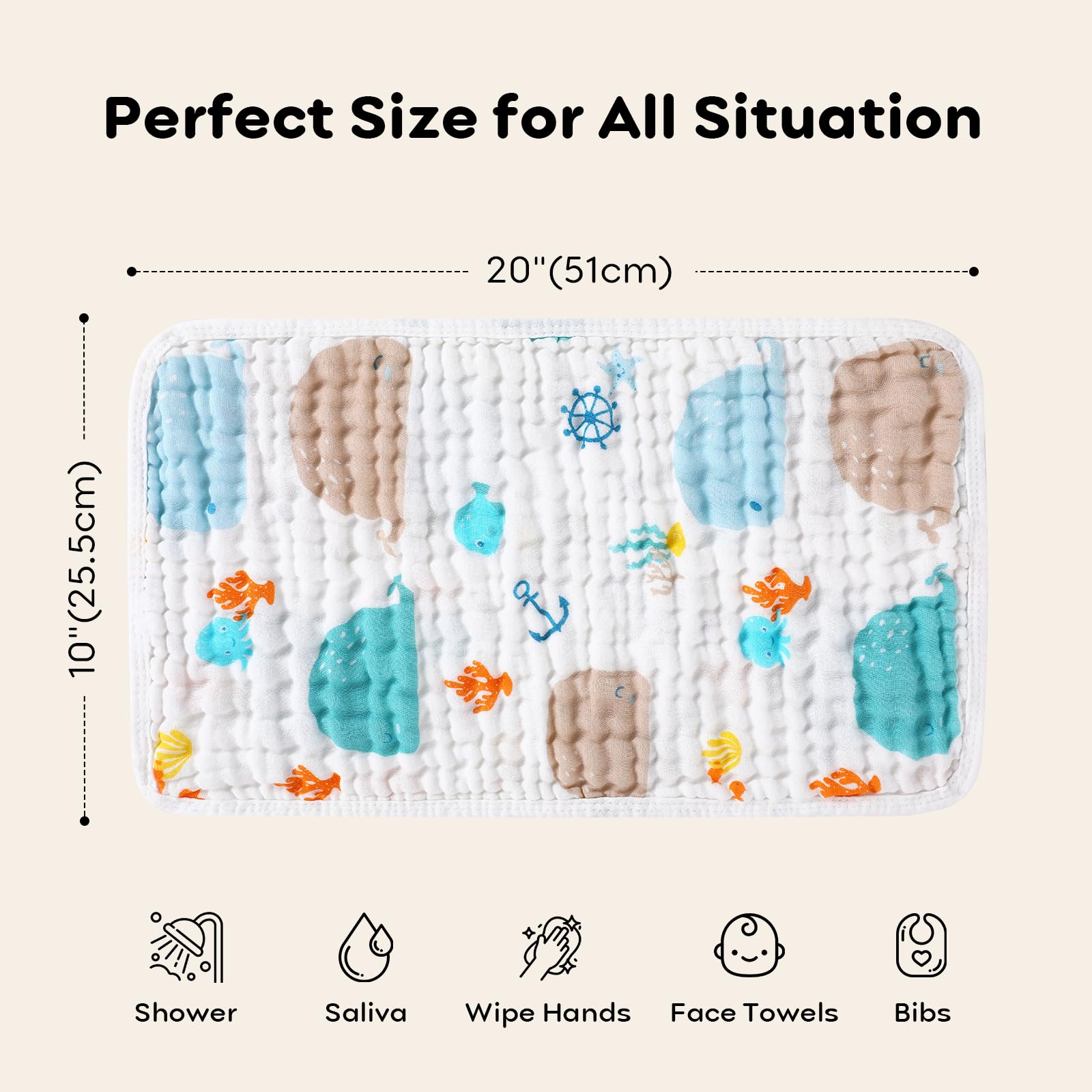 MULTI-FUNCTION - 20x10 inches, our muslin washcloths will be your favorite daily essentials as reusable baby wipes, burp cloths, baby face towels, cloth diapers, body washcloths, adult face towels and anything else that's available. Perfect 6pcs meet your baby's different need.