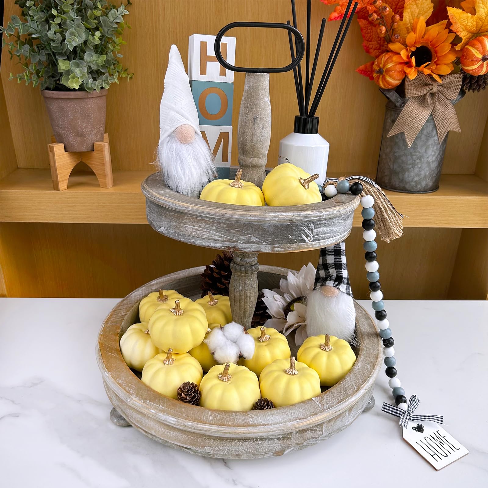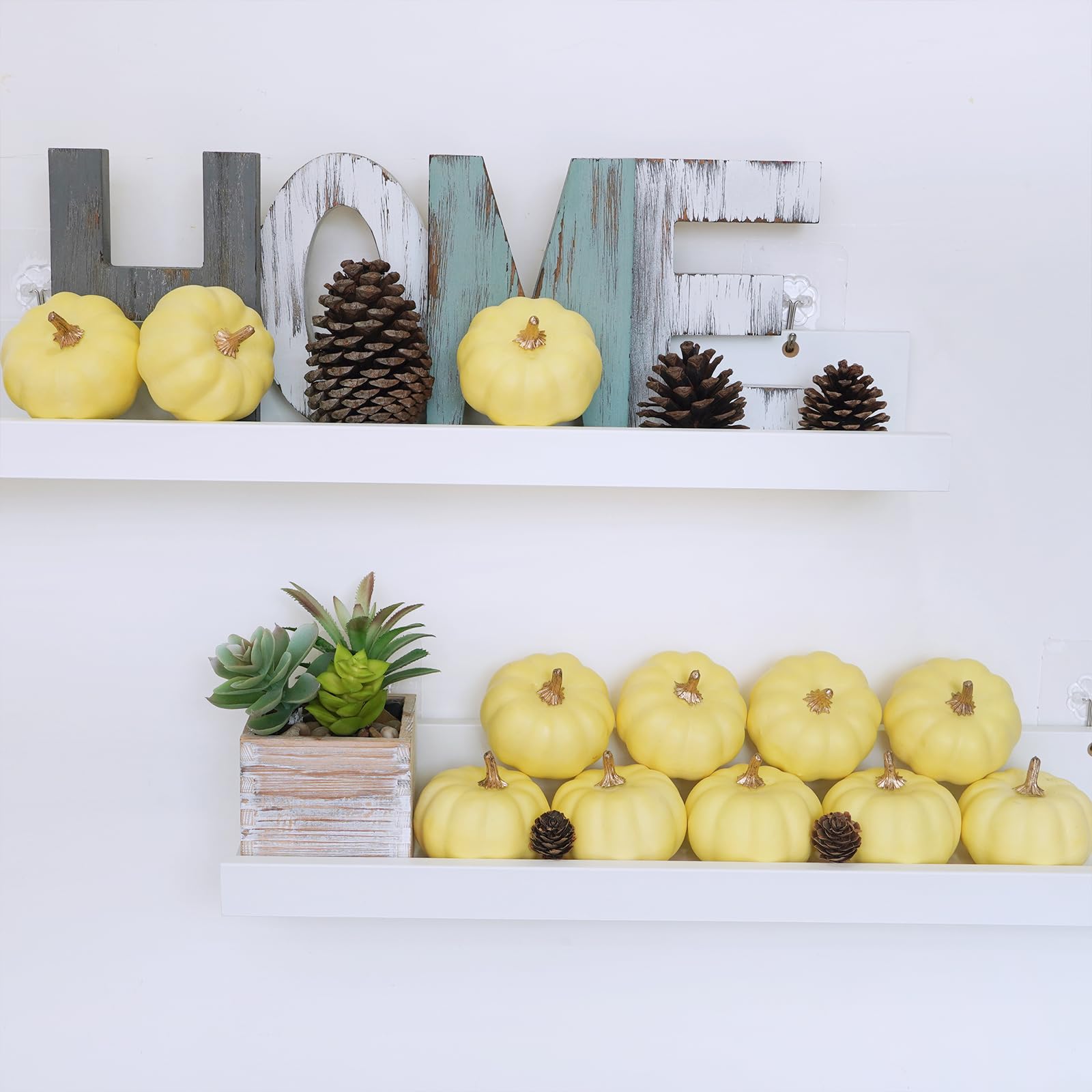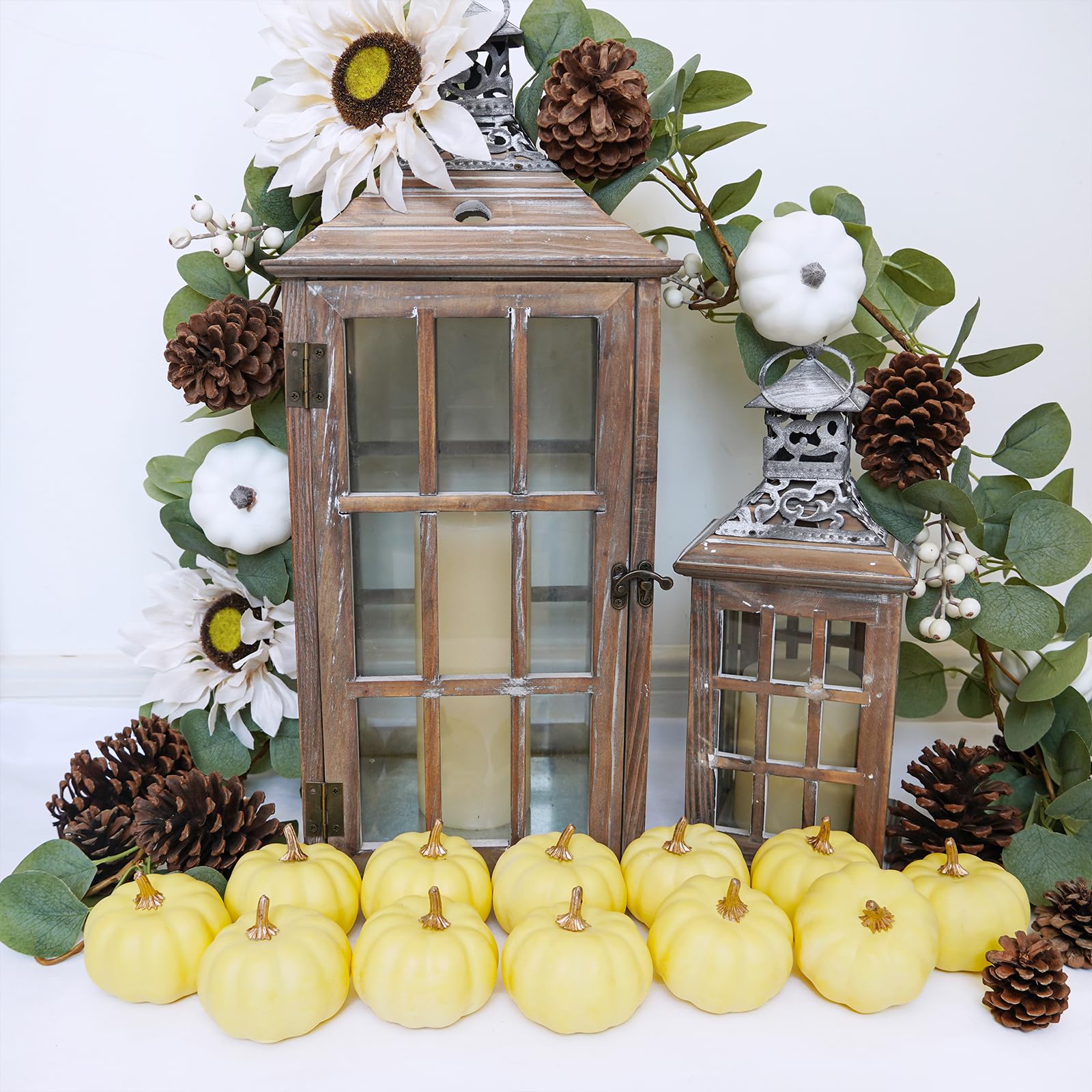Size: Each artificial pumpkin measures about 3" wide and 2.7" tall. Warm yellow color that is eye-catching in fall displays. You can mix these small faux pumpkins with your existing fall decor to display all over your home or add your own personal touches. Their perfect small sizes make them perfect to be used as bowl or tray fillers, table scatters, tiered tray decor, or added to wreaths, garland, swags, centerpieces, and floral arrangements.