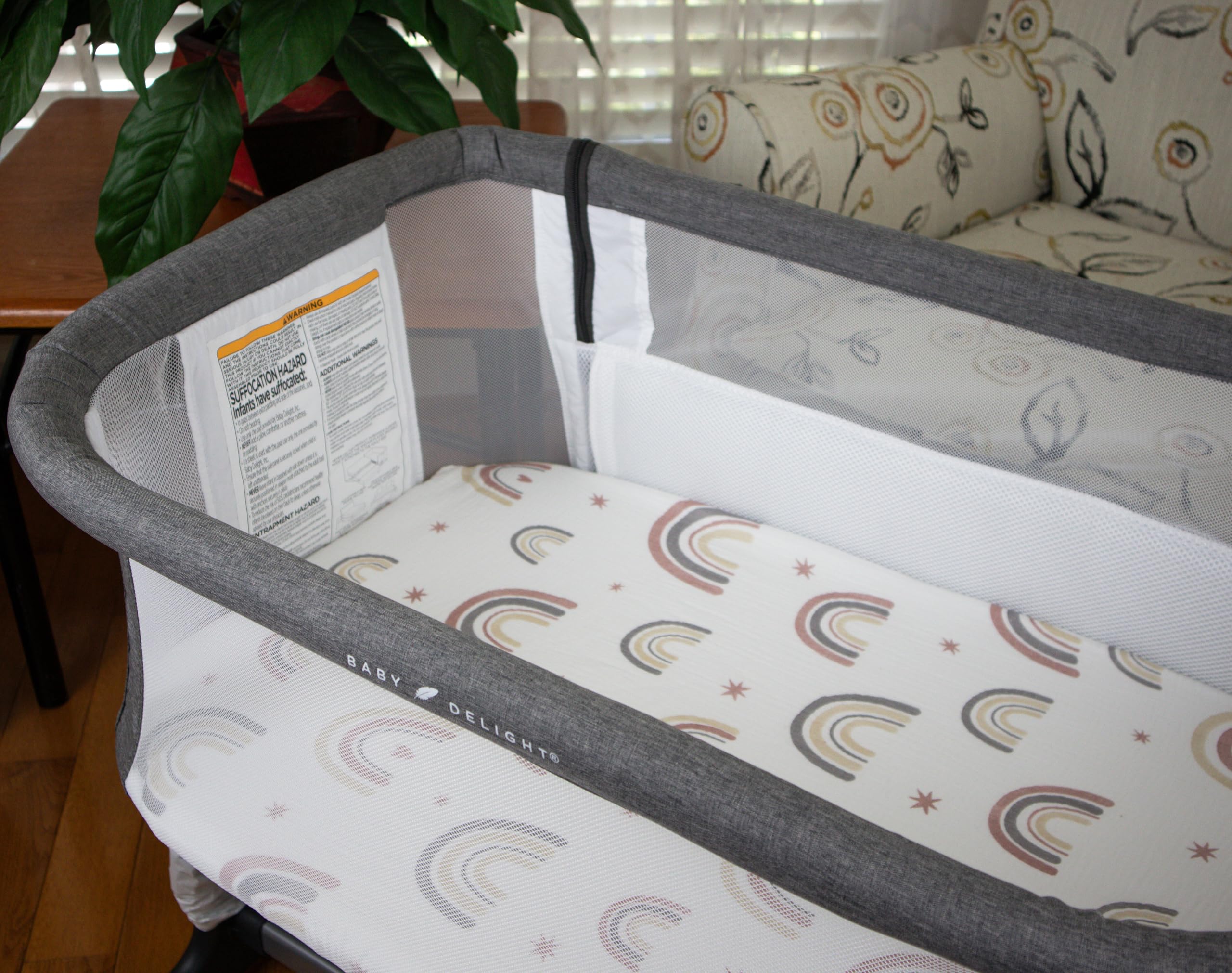 Keep Your Baby Warm, Cozy & Comfy with Tansy Panda Baby Bassinet Sheets! You want your baby to sleep soundly through the night without any interruptions and we want to help make it happen. At Tansy Panda, we use breathable and soft muslin cotton fabric to bring you a fitted bassinet sheet that both baby and parents will love. Tansy Panda portable bassinet fitted sheets keep your baby warm and dry while they sleep and stay firmly in place no matter how much your little one wiggles. Each pack comes with 3 organic bassinet sheets that are easy to clean and maintain. Just the right fit with the adorable rainbow pattern for bassinet bedside sleepers. We use adorable, modern designs that look equally cute on all bassinets for newborn babies including travel bassinet. Unlike the rest, we don’t use any dyes to make sure our newborn bassinet sheets are safe to use and gentle on your baby’s sensitive skin. Our sheets measure in at 21 x 32 inch making these ideal for use with rectangle, bedside, hourglass, and oval mattresses and compatible with Chicco LullaGo, Dream On Me, Cloud Baby, Yacul bassinet mattresses. The 360-Degree elastic coupled with the smooth fabric makes sure no lumps get in the way of your baby’s comfort. More Features You’ll Love: - The bassinet cover are machine washable and fade resistant - They don’t lose their softness even after multiple washes - Each pack has 3 sheets so you always have a fresh sheet ready to use - Our universal size with 360-degree elastic band ensures the perfect fit - The sheets are soft and breathable so you can use them around the year - Makes a thoughtful baby registry gift and baby shower gift Maintain Your Baby’s Comfort Around the Clock So They Can Sleep & Dream with Tansy Panda Bassinet Sheet Set!