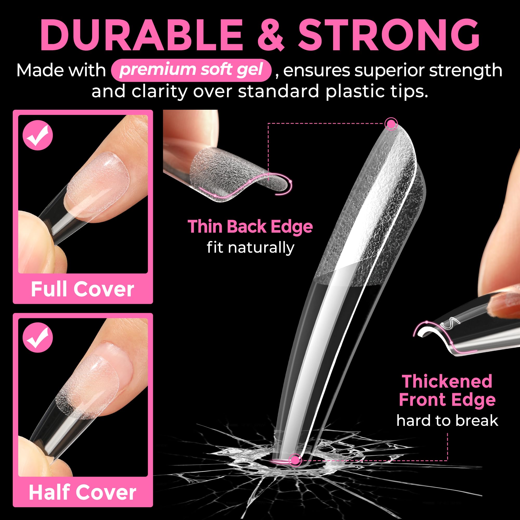 ❀️Wide Application Full Tips Coffin :This full cover nail tips is the popular style fake nails, which is gelly soft tips and will make no trace even bend, bright clear you can more easily press, trim, paint square straight false nails to make your dream nails shape. Real DIY manicure gel tips.. perfect to be used on wedding, prom, dating. And they are also suitable for Halloween, Christmas, Valentine's Day and other festival party. Clear long size tips are very eye-catching showing unique charm.