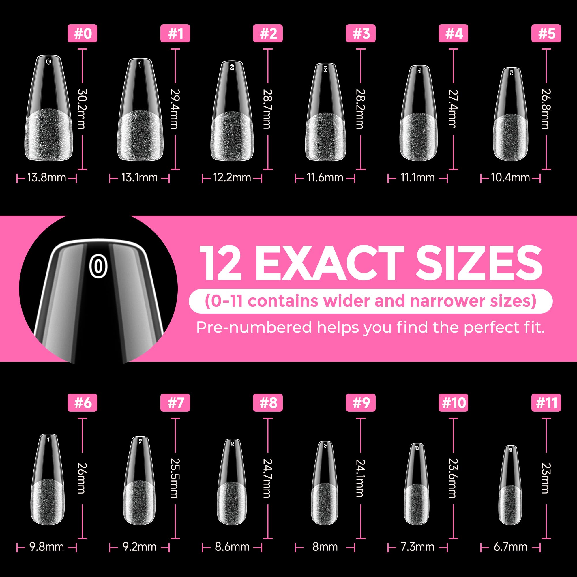 ❀️12 Sizes Tips Fit Your Nails: Out clear long coffin tips contain 12 sizes with size number on the top of the tips can easy pick proper tips for your nail. And 2 extra size can suit bigger or smaller nails, in case 10size can not fit few of your nails.