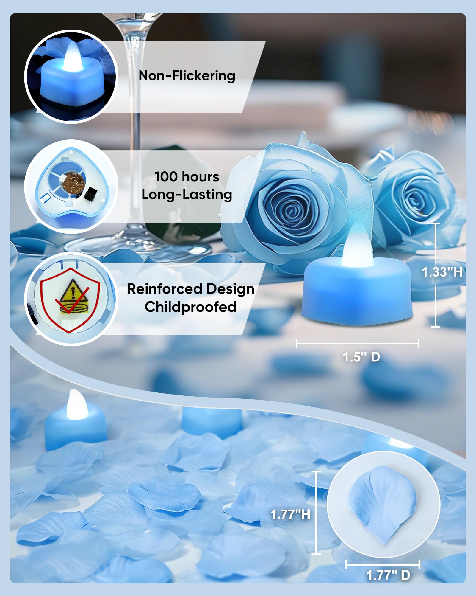 Perfect Size for Any Occasion: The petals measure 1.77x1.77 inches and the flameless tea lights are approximately 1.33" H x 1.5"D, making them ideal for flower girl baskets, wedding aisle, table decorations, or any romantic event you wish to enhance with warmth and charm