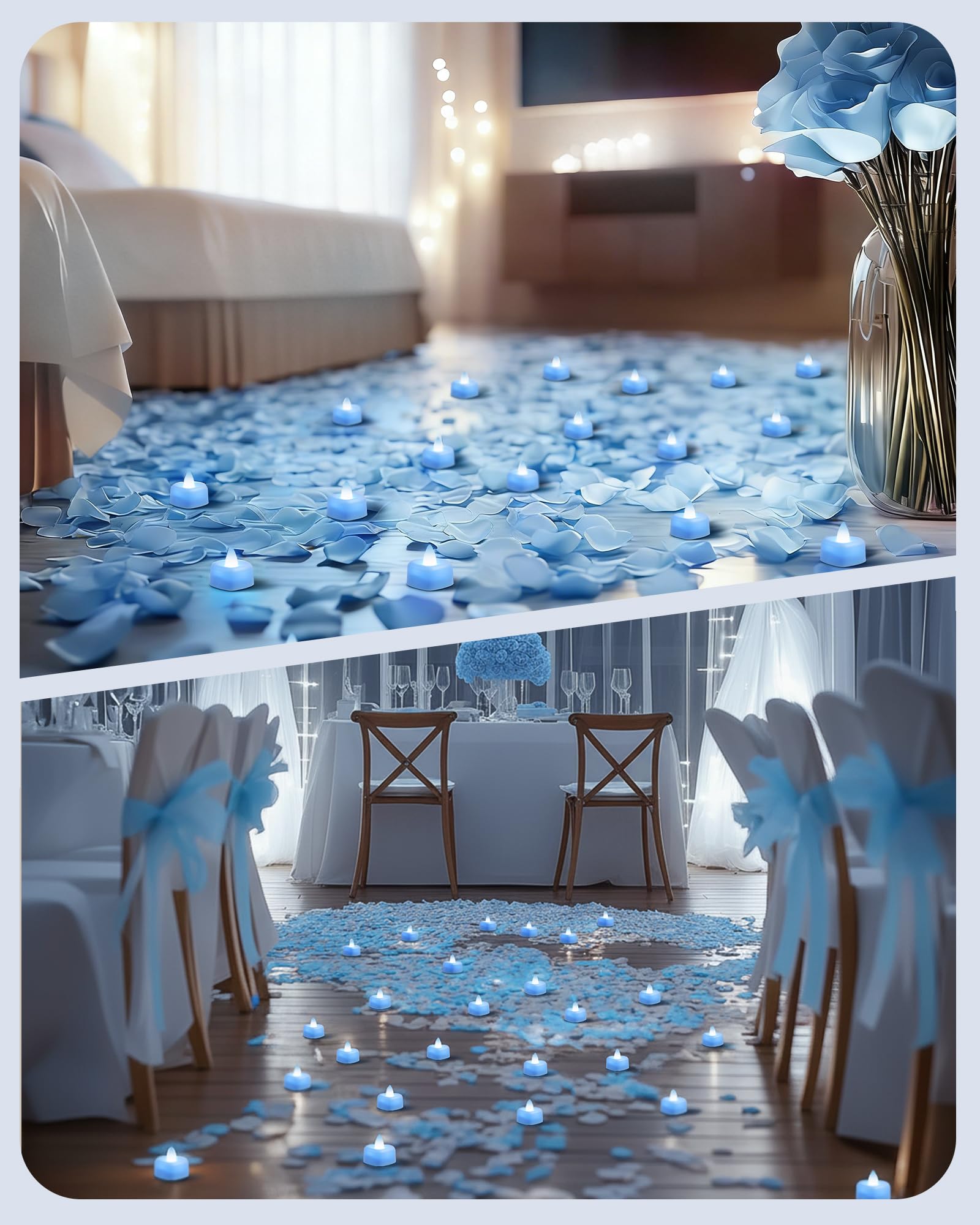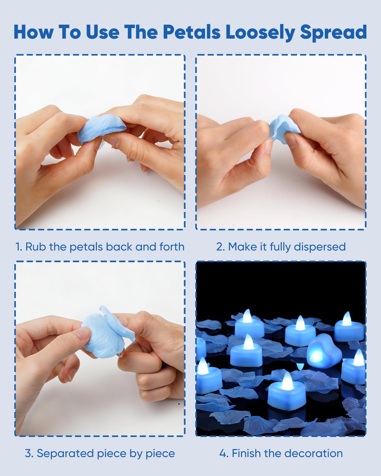 High-Quality Light Blue Artificial Rose Petals: Made from premium, non-toxic polyester, our light blue petals are not only realistic but also easy to clean and odorless. Perfect for blue party decor, weddings, dates, Valentine's Day, and proposals, just separate the petals to set the stage for love