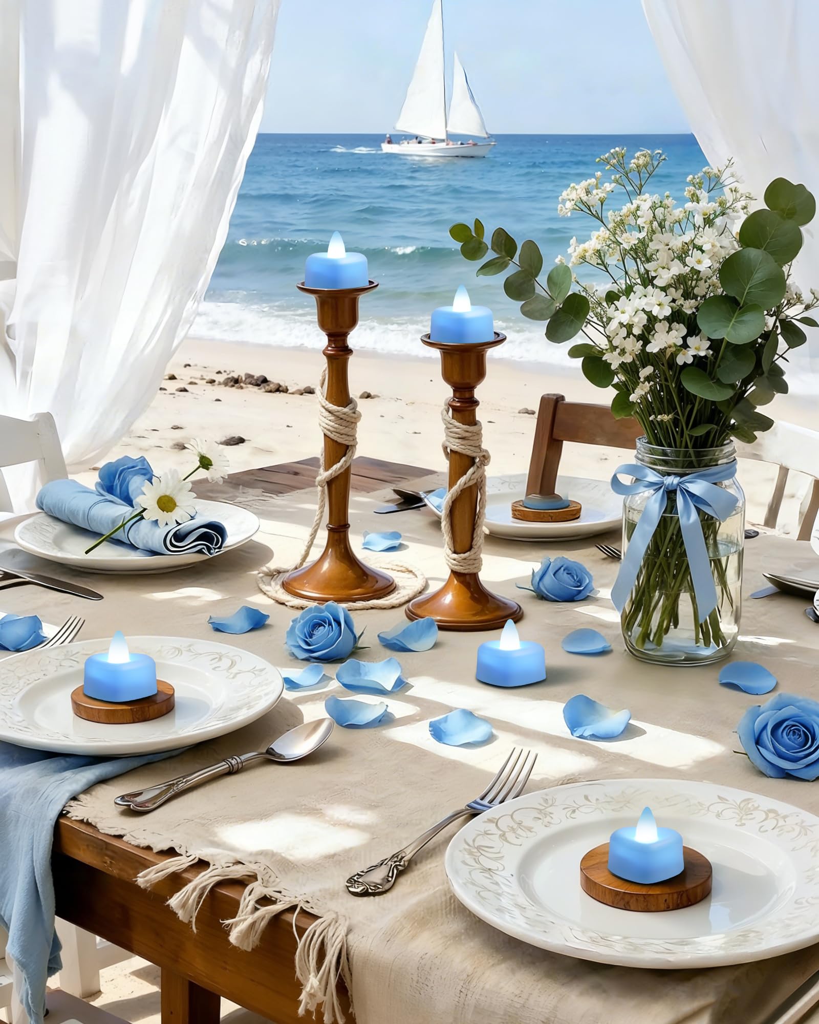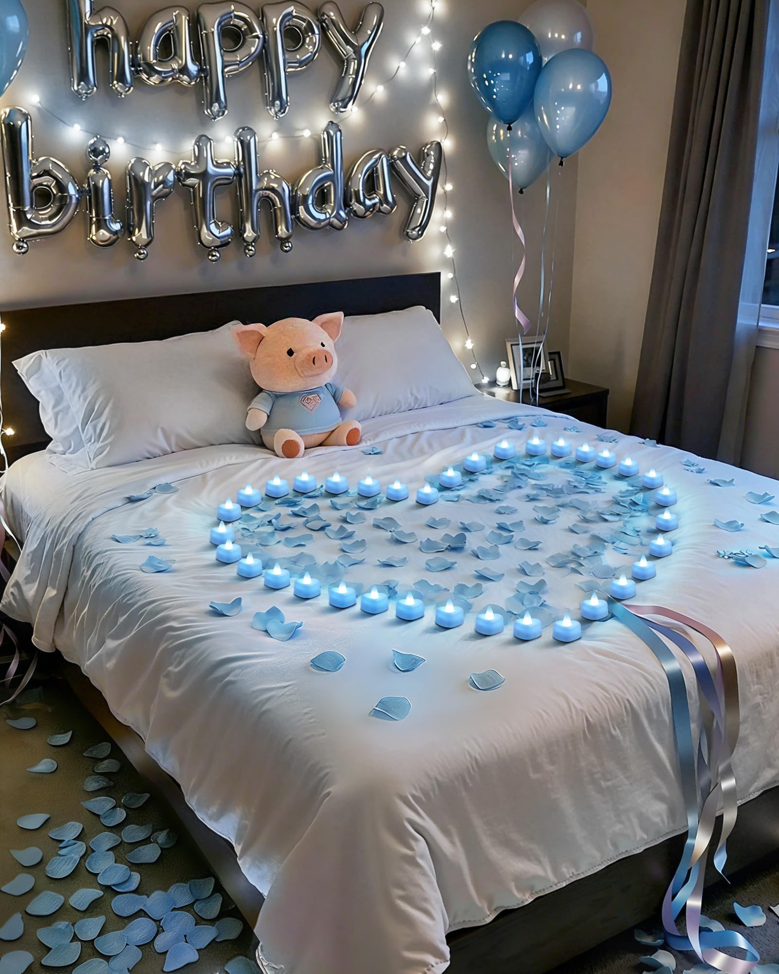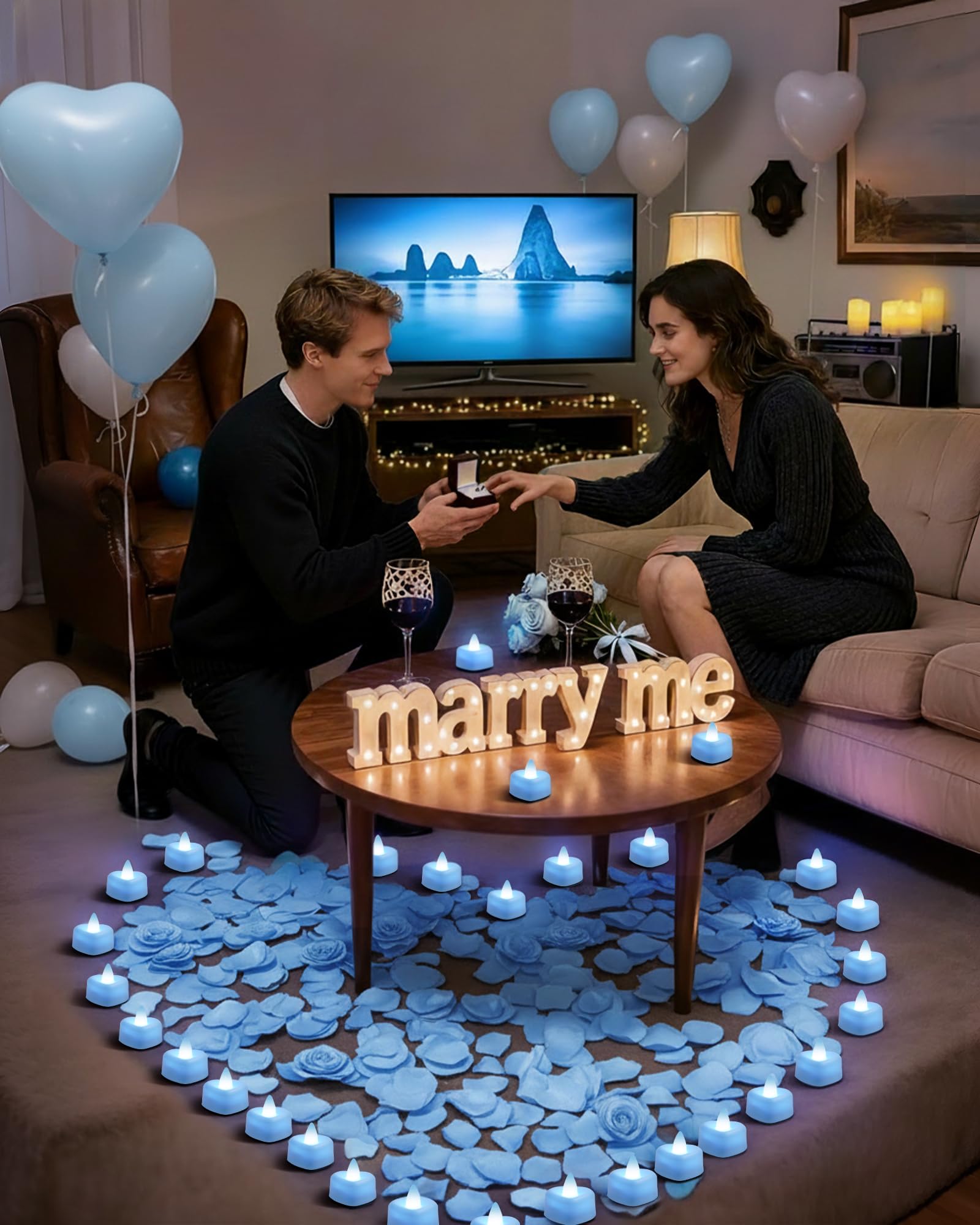 Light Blue Heart-Shaped LED Tea Candles: These enchanting electronic tea lights emit a warm, bright purple glow, effortlessly transforming any space into a romantic haven without the worry of flames or mess