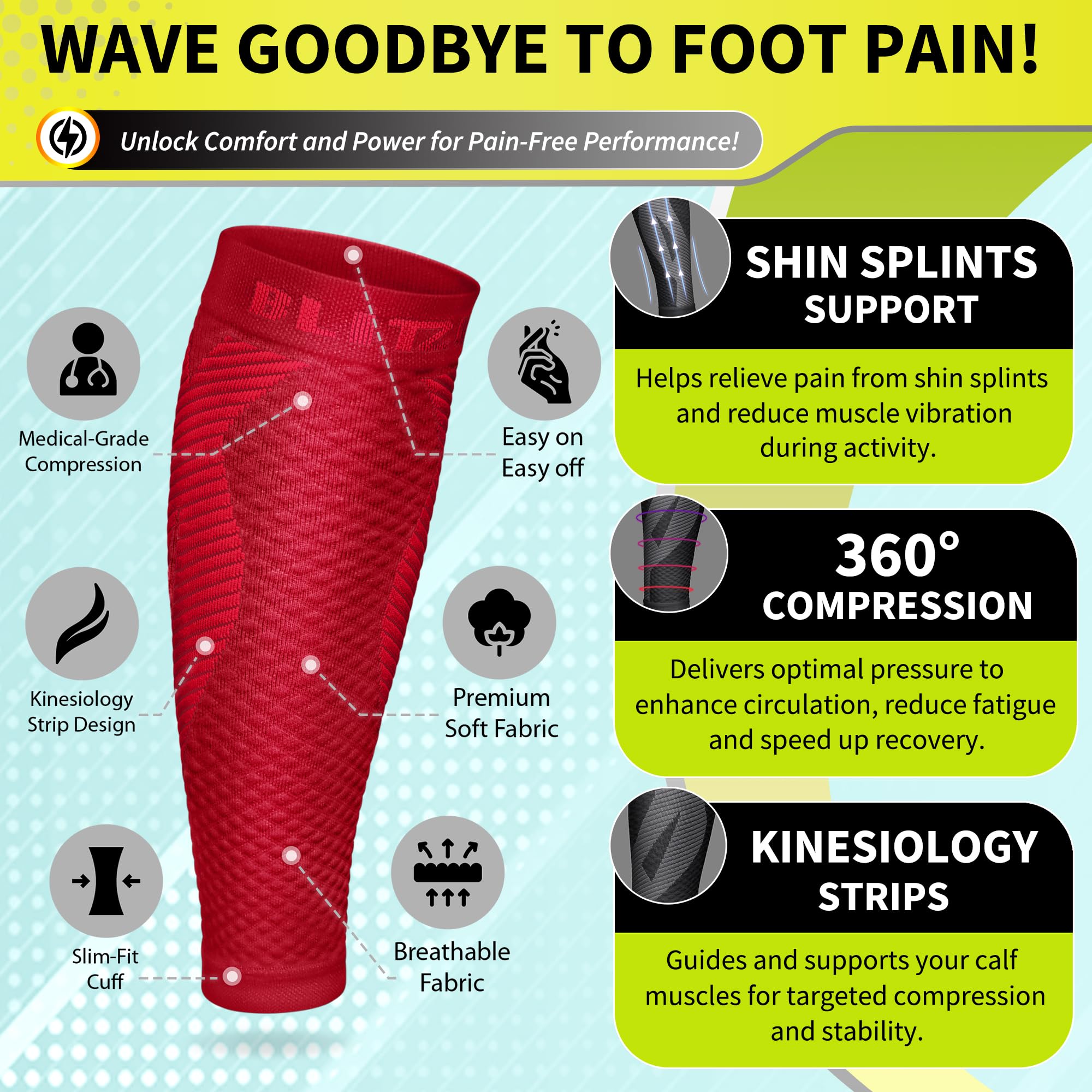Patented Kinesiology Strips for Targeted Pain Relief: Developed and patented in New York, our calf compression sleeves incorporate advanced kinesiology strips that provide superior support, stability, and pain reduction. Designed using the renowned kinesiology technique, these strips promote natural pain relief and accelerate recovery by improving muscle function and reducing fatigue.