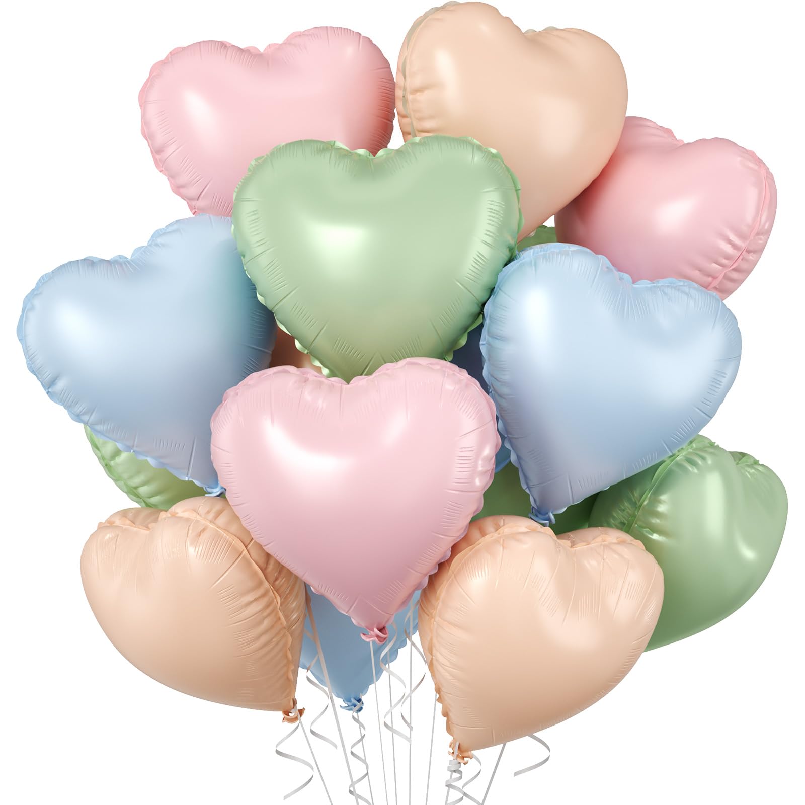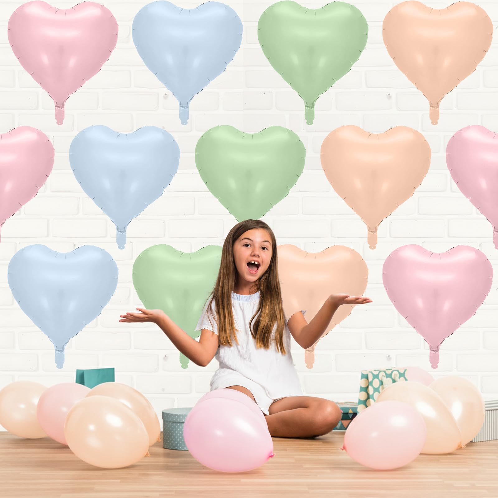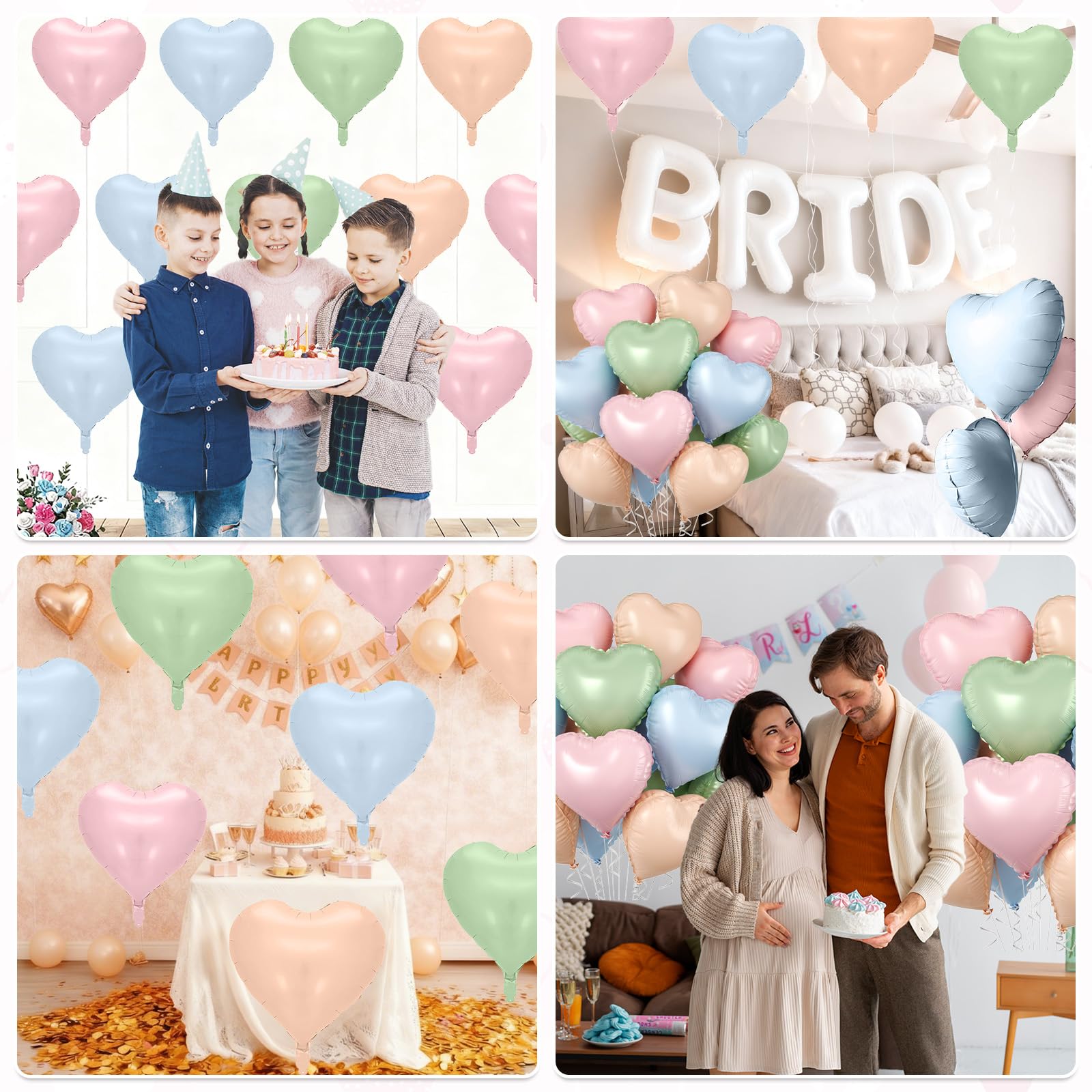 10 Pcs Pink Blue Green Heart Balloons: Our package includes 3 x 18 inch baby pink matte heart foil balloons, 2 x 18 inch baby blue matte heart foil balloons, 2 x 18 inch sage green matte heart foil balloons, 3 x 18 inch apricot matte heart foil balloons, 1 x straw for easy inflation, and 1 x white ribbon. These pastel heart shaped balloons bring soft, charming colors that add a sweet and stylish atmosphere to your party decoration.
