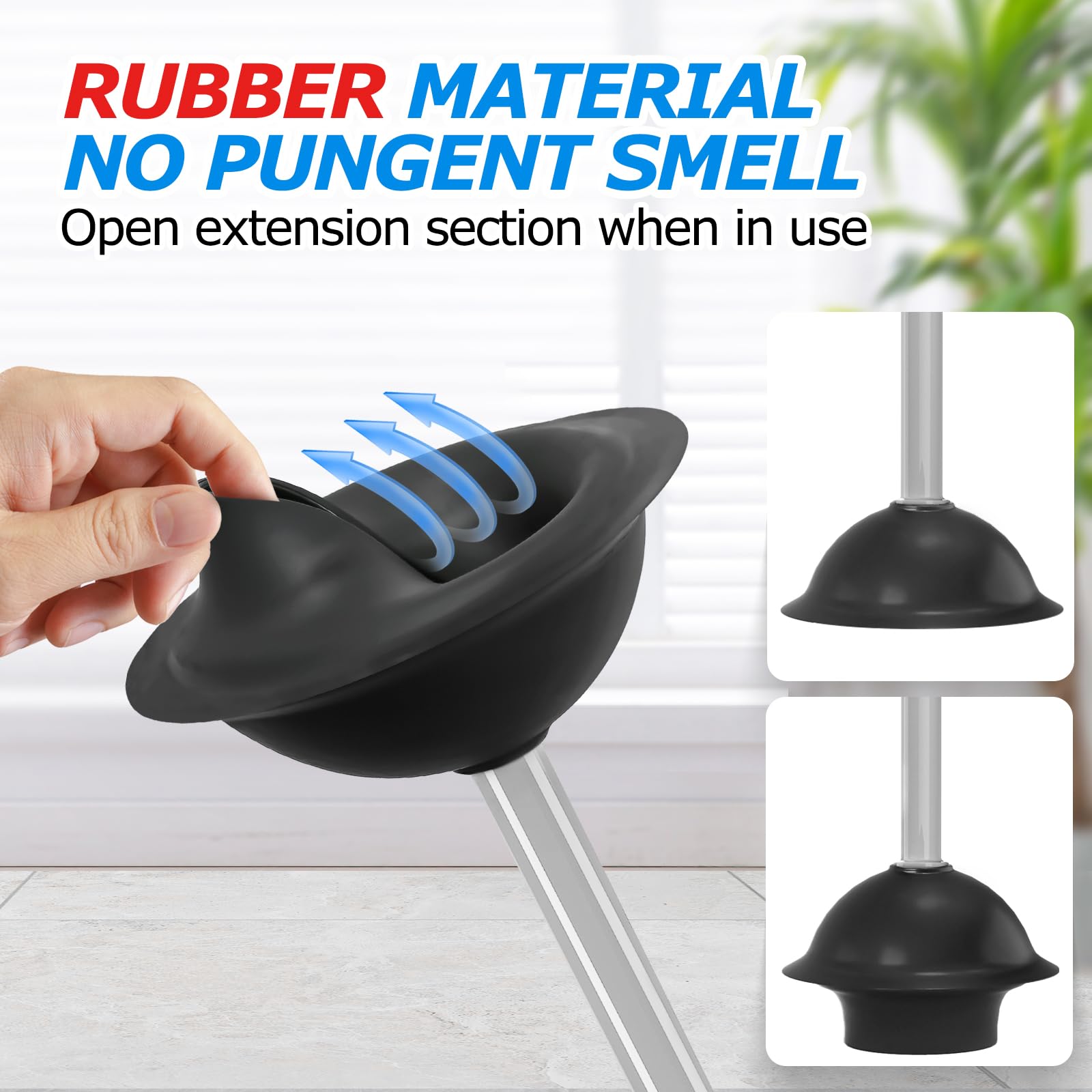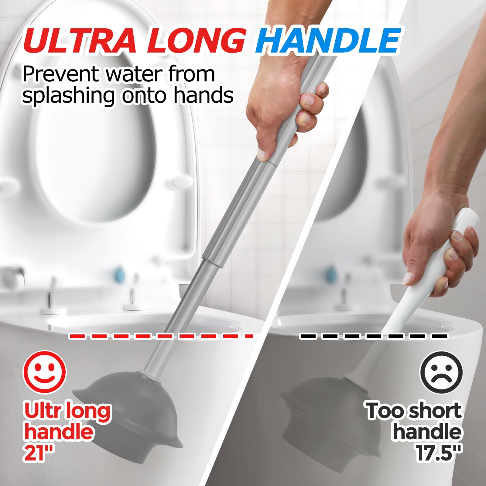 Extended handle -Heavy Duty Toilet Plunger: Compared to ordinary handles, our upgraded extended handle provides a better user experience and prevents stains from splashing onto the hands. A professional powerful suction cup that can solve various blockage problems. Comfortable handles provide greater support during use.