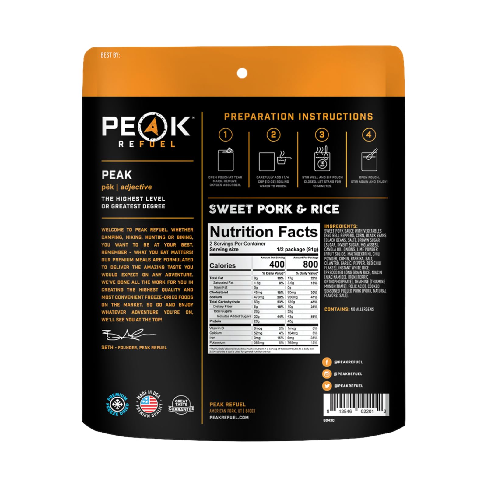 MADE IN THE USA – All Peak Refuel meals are freeze-dried and packaged in the USA. If you are not satisfied with your purchase or have any other questions, contact us directly and we will make it right!