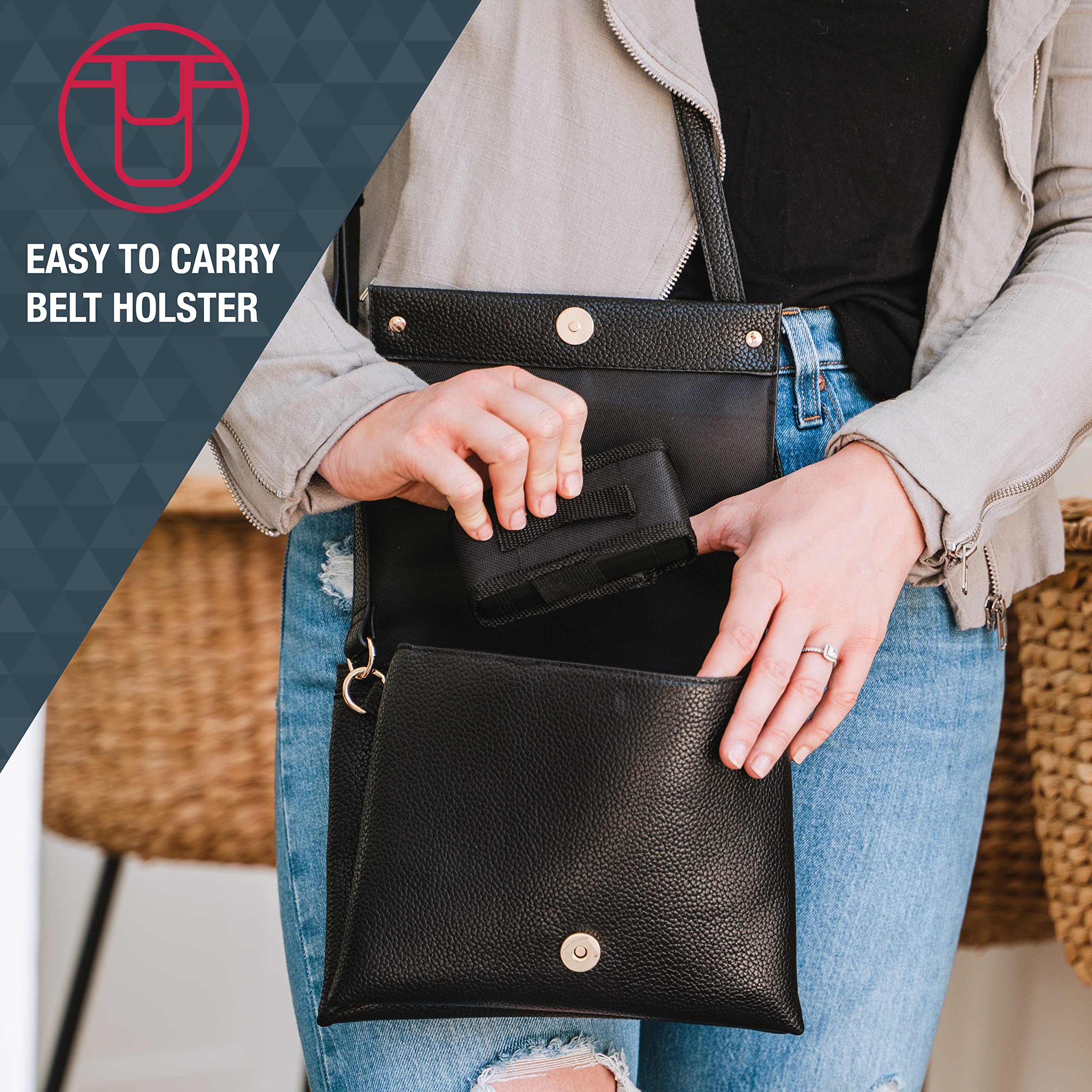 CONVENIENT AND EASY TO CARRY: Discreetly carry and store in your purse or loop on a belt with the included holster for easy access; Built-in rechargeable battery allows multiple uses and power when you need it